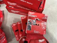 (5) Milwaukee advent calendars, (24) Milwaukee red gaiters, (11) face masks, (2) nail pullers, (4) Bosch hats, (4) blister bit organizers, (4) margin markers, (5) size medium gloves