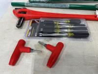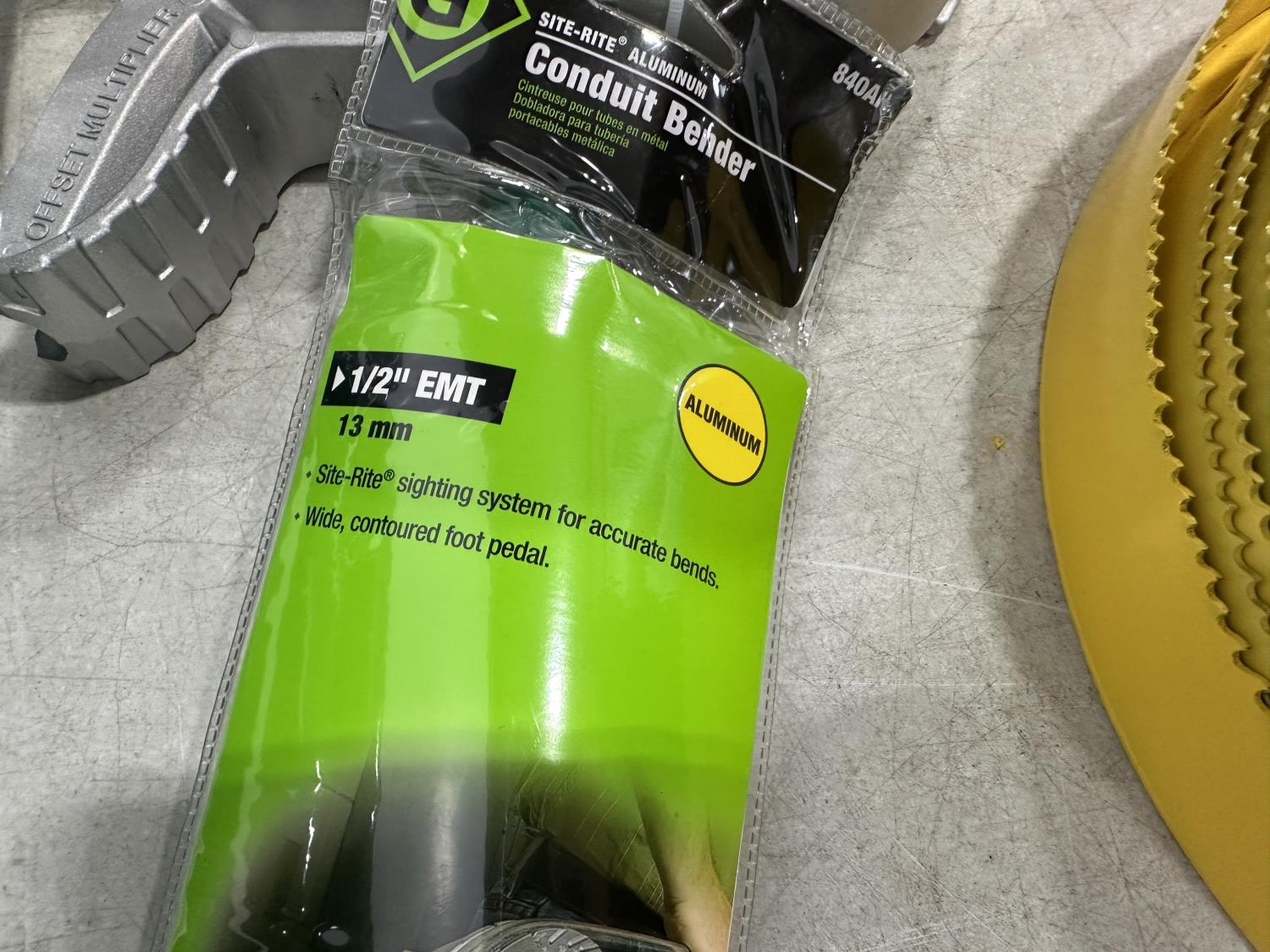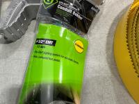 (4) holesaws -12 inch, 10-1/4 inch, 9-3/16 inch, (4) Greelee 1/2 inch EMT conduit benders, (2) ratcheting screwdrivers, Klein Tools 7 piece nut driver set, 24 inch Ridgid pipe wrench