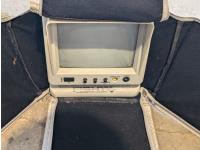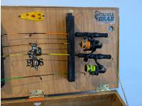 Box 37 inch w x 18 inch d x 18 inch h, (4) ice fishing rods, vintage Lowrance Fish Lo-K-Tor, FishTV7 underwater fish camera, ice fishing bag, (2) ice scoops, tip up