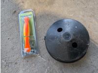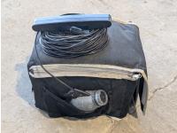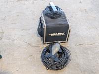 Box 37 inch w x 18 inch d x 18 inch h, (4) ice fishing rods, vintage Lowrance Fish Lo-K-Tor, FishTV7 underwater fish camera, ice fishing bag, (2) ice scoops, tip up