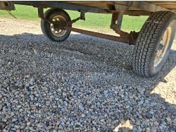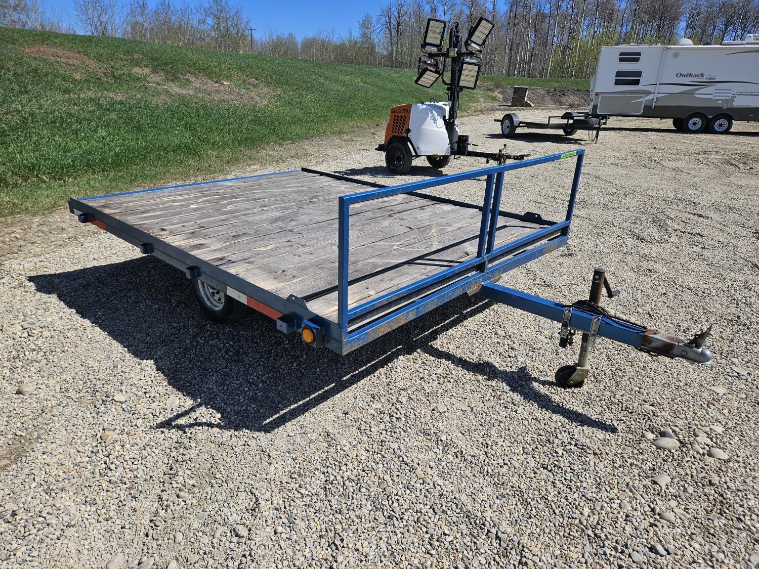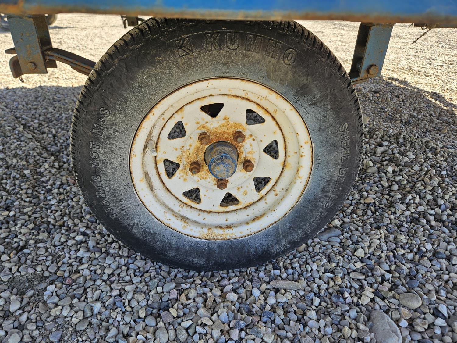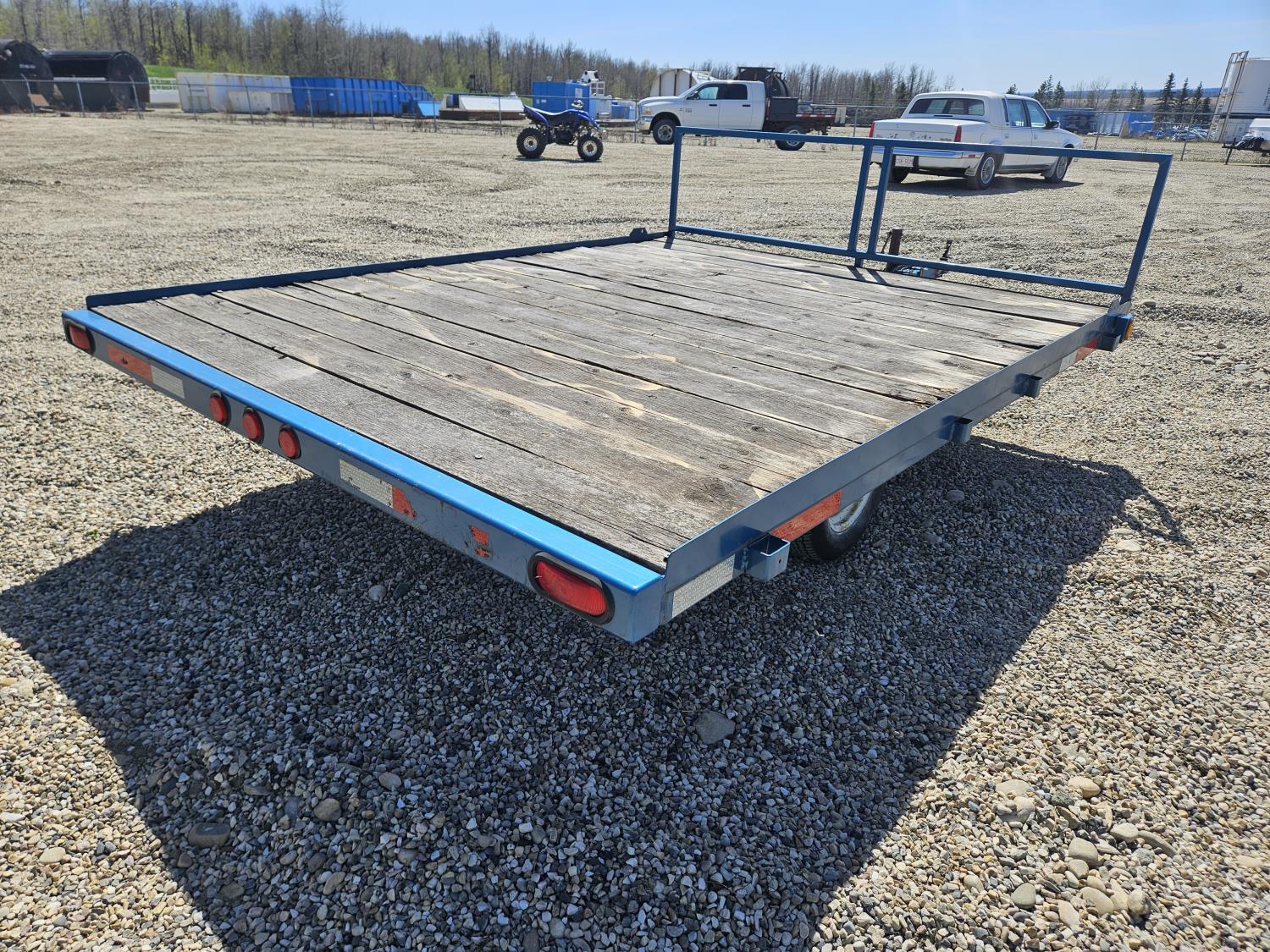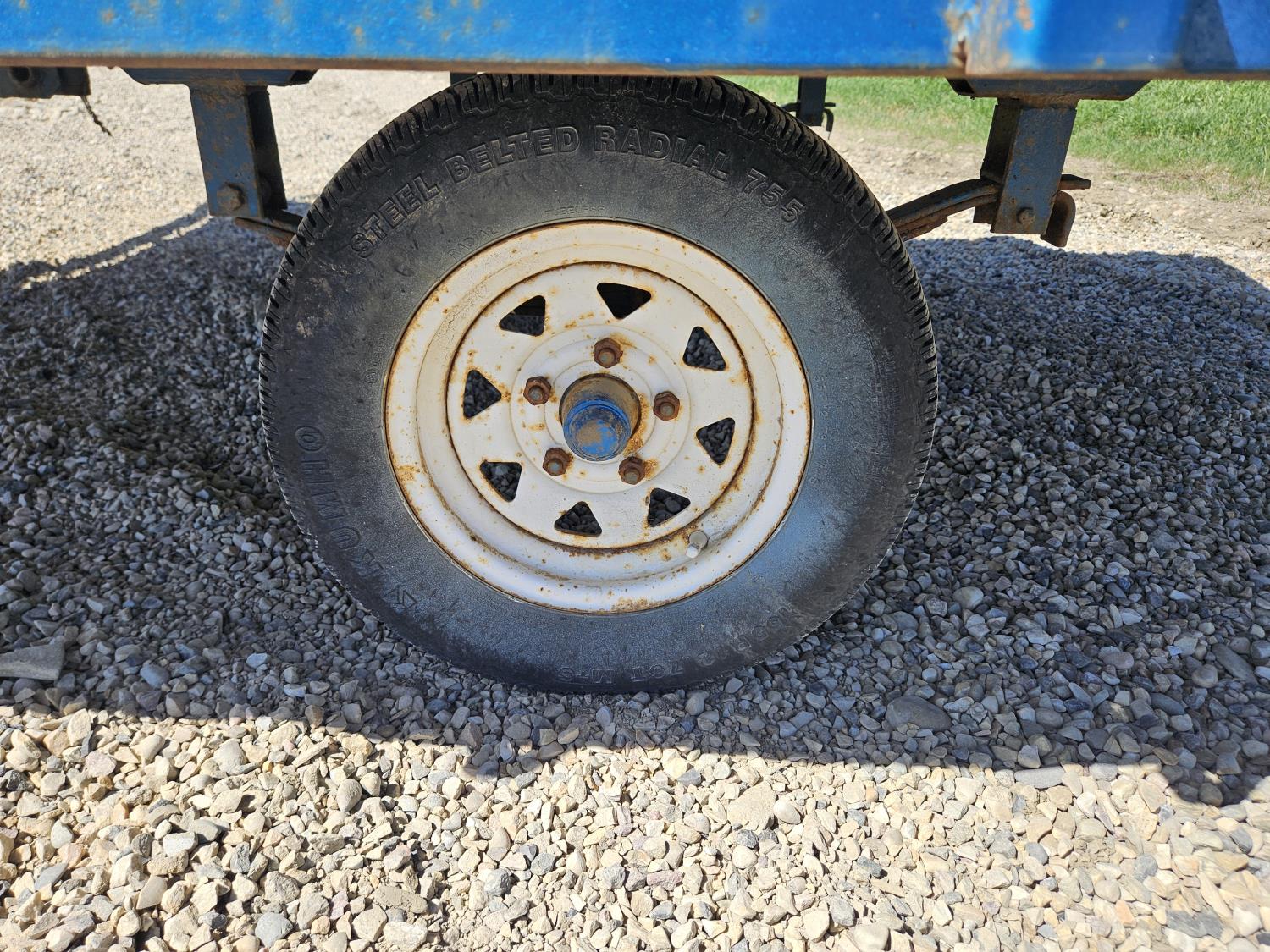 90 inch wide deck, wood deck, spring suspension, ball hitch, stake pockets, 155R12 tires