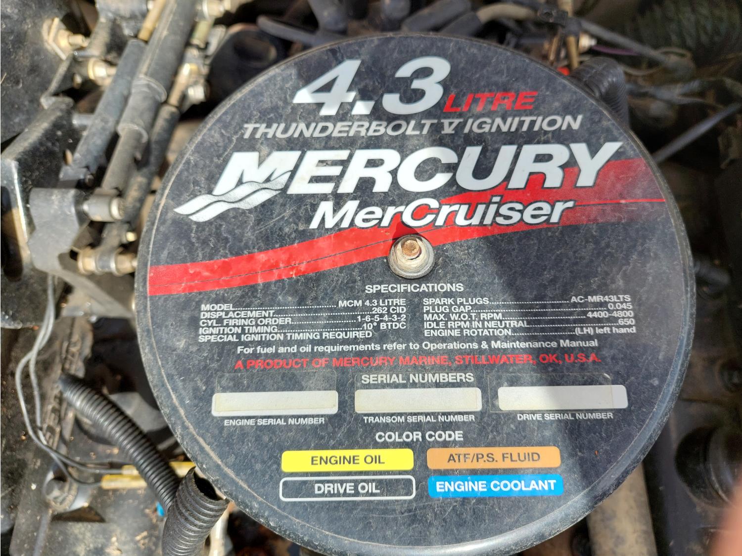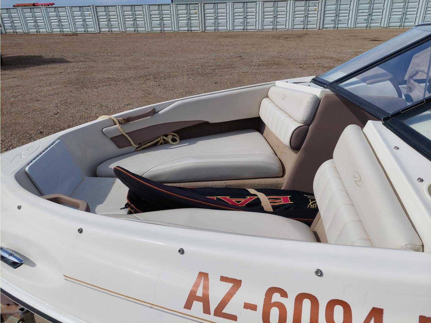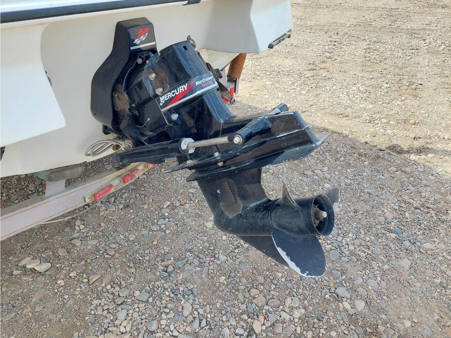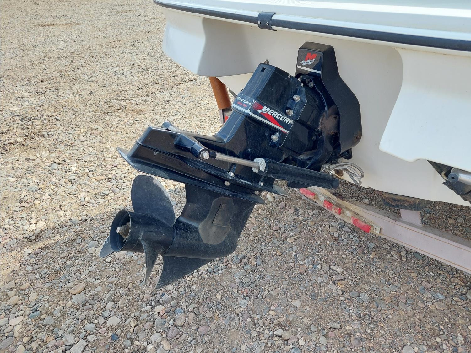 4.3L Mercury MerCruiser engine, 190 HP, Fast Trac hull, stern drive, open bow lounge area, includes 3 sets of water skis, extra prop, folding canopy, boat bumpers, and boat cover