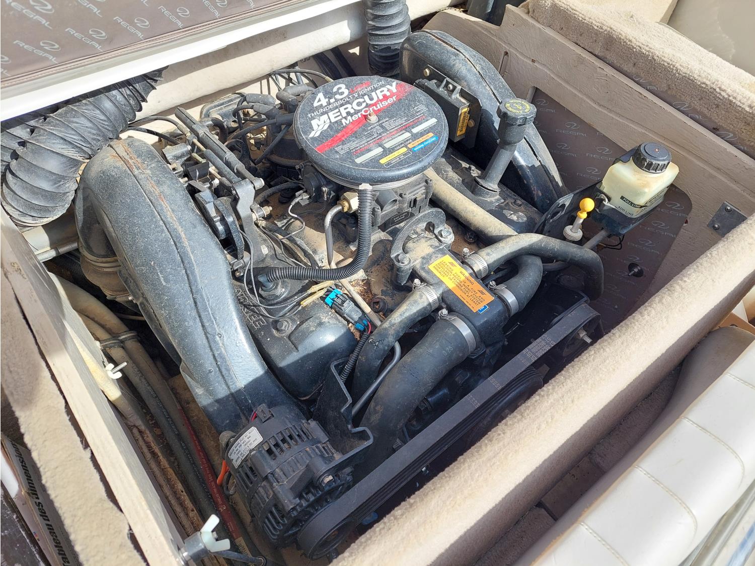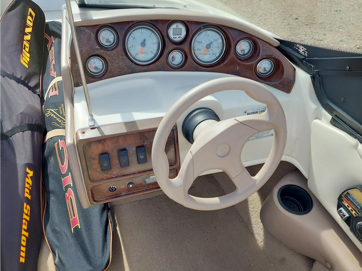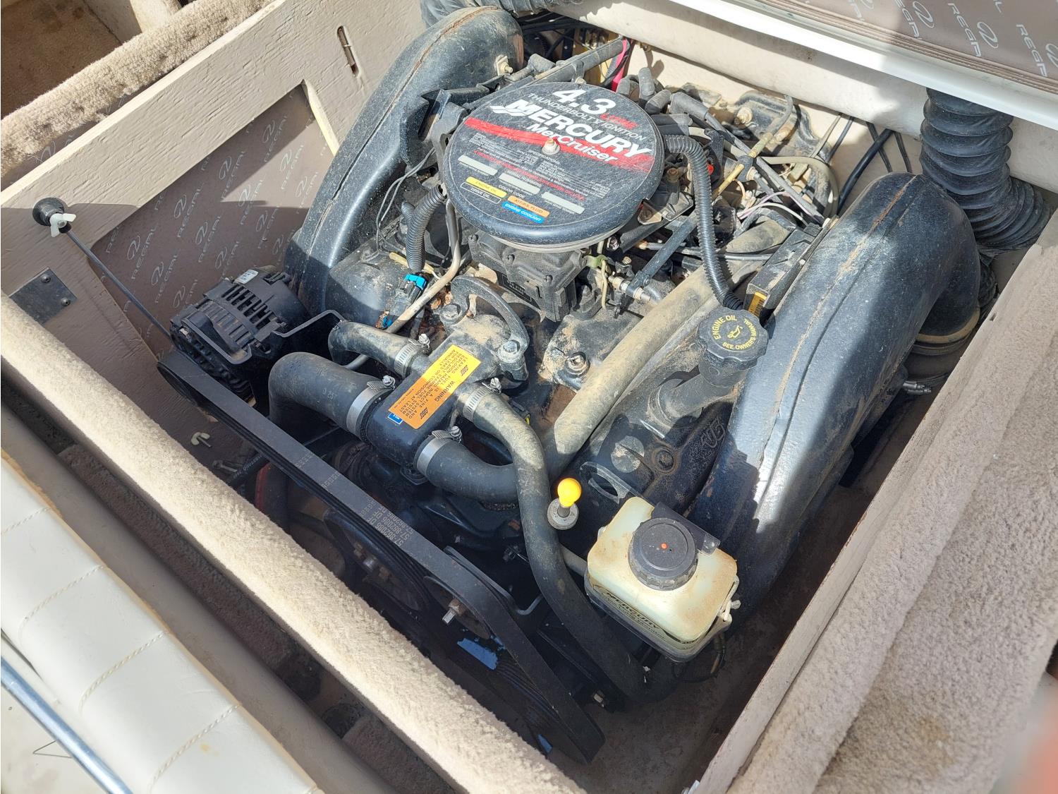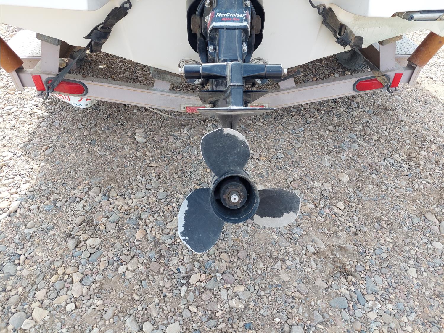 4.3L Mercury MerCruiser engine, 190 HP, Fast Trac hull, stern drive, open bow lounge area, includes 3 sets of water skis, extra prop, folding canopy, boat bumpers, and boat cover