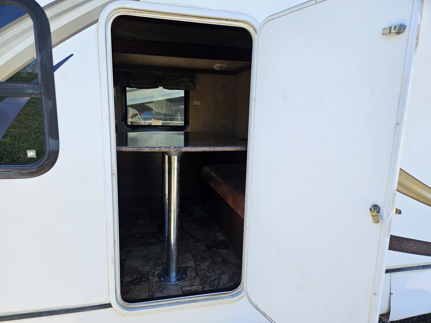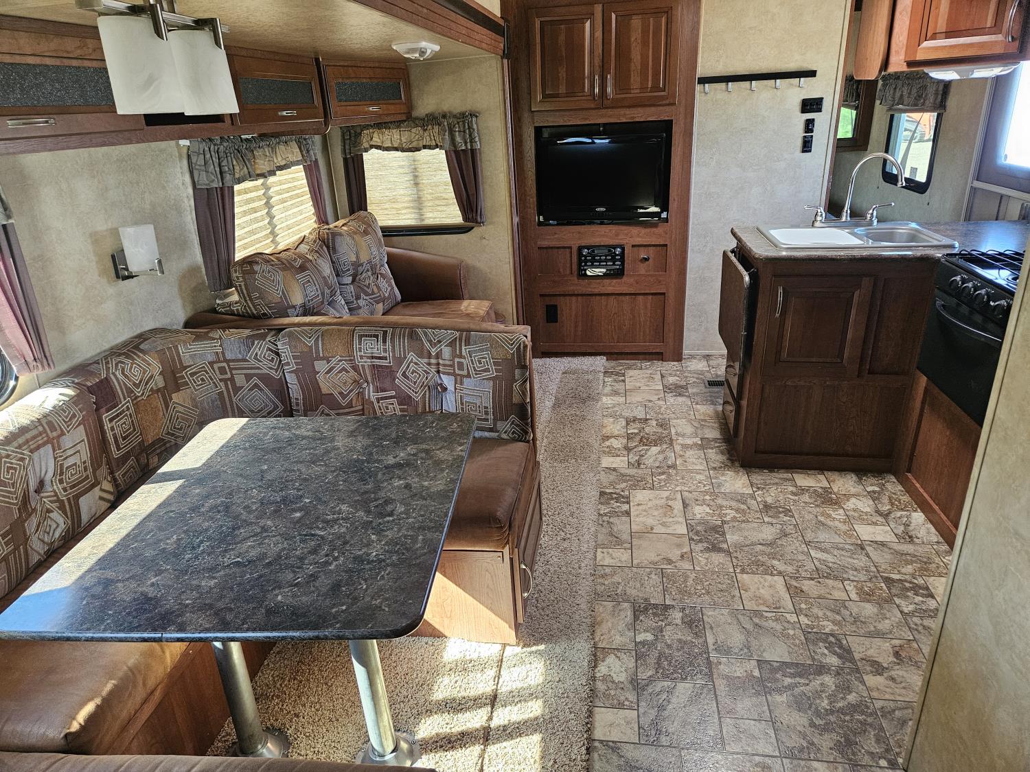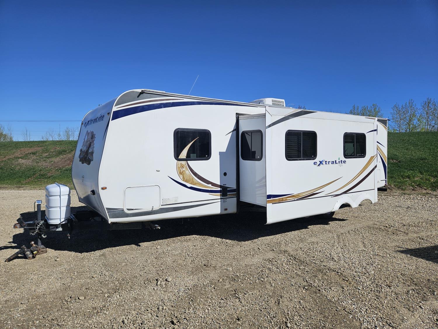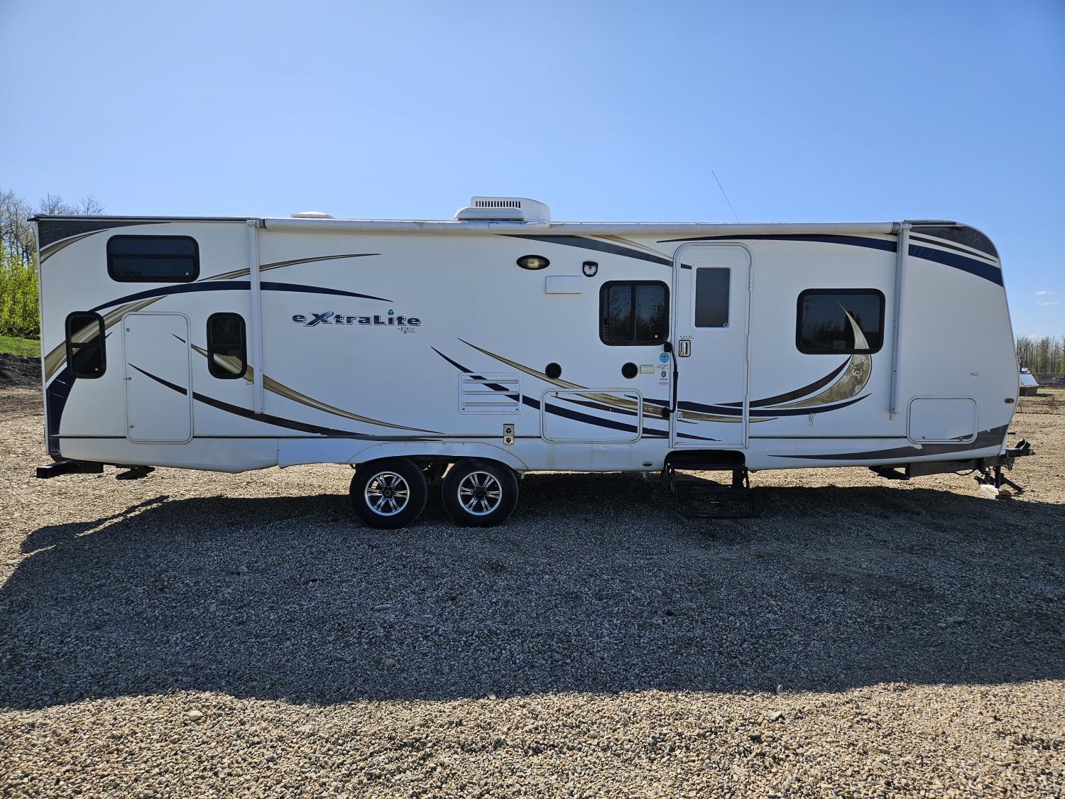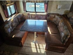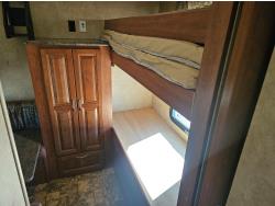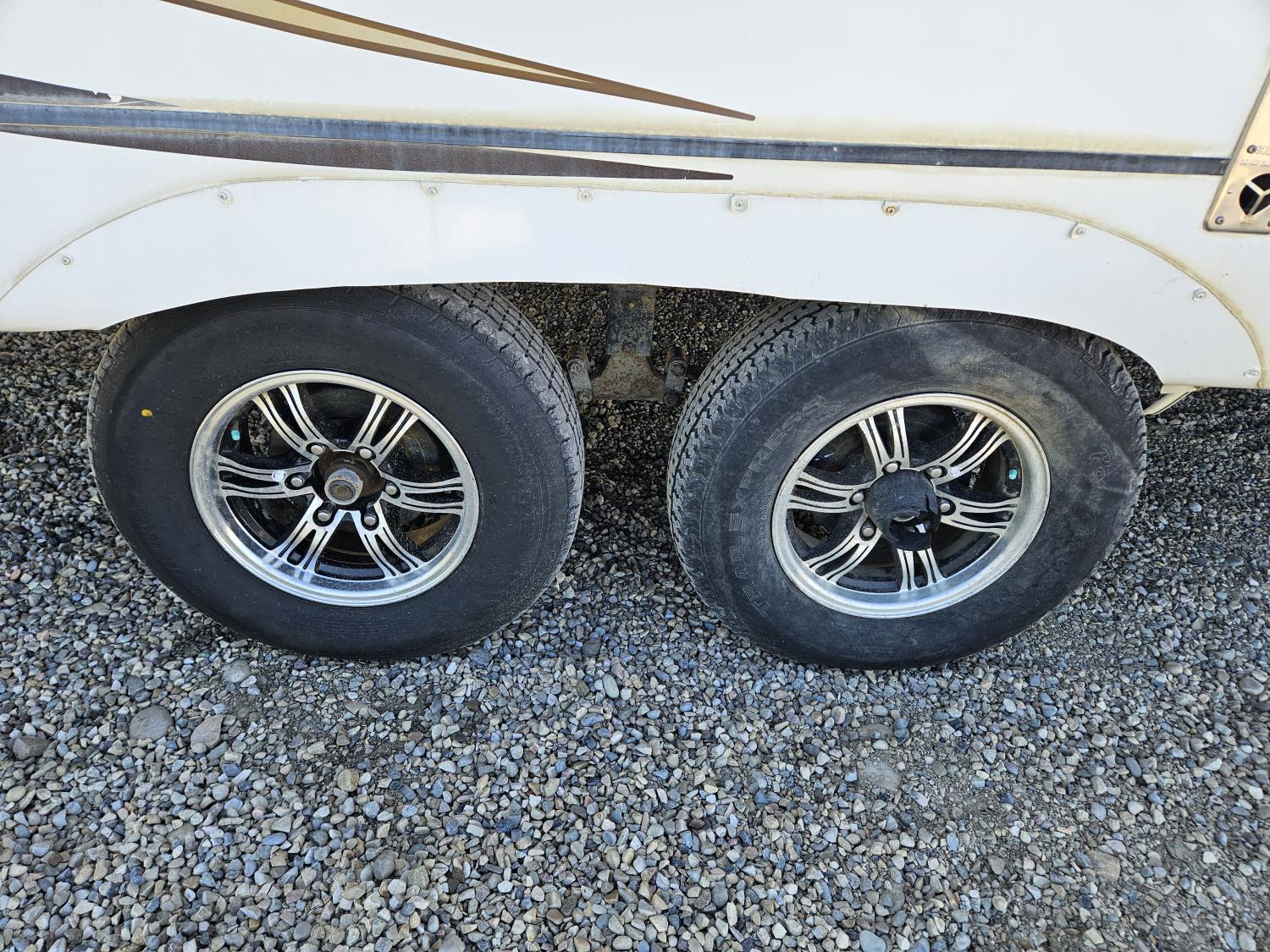 stove, fridge, microwave, full bath, bunk beds, A/C, outdoor shower, 1 slide, power awning, spring suspension, electric brakes, rear bunks with table, U shaped dinette, leather sofa, tv, stereo system, c/w stabilizer hitch, outdoor bbq, aluminum rims, 225/75R15 tires
