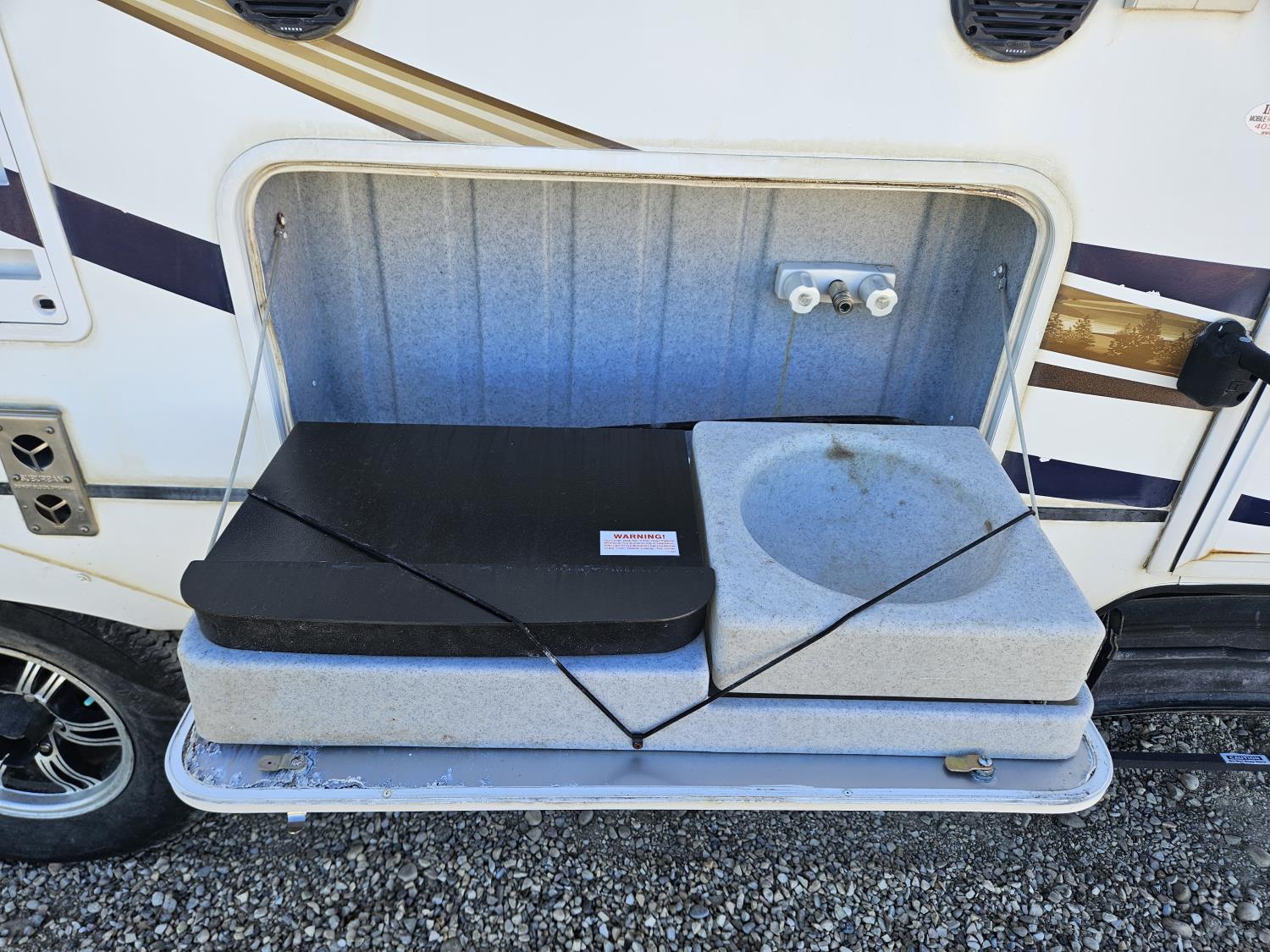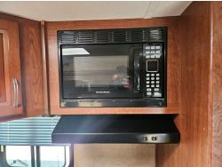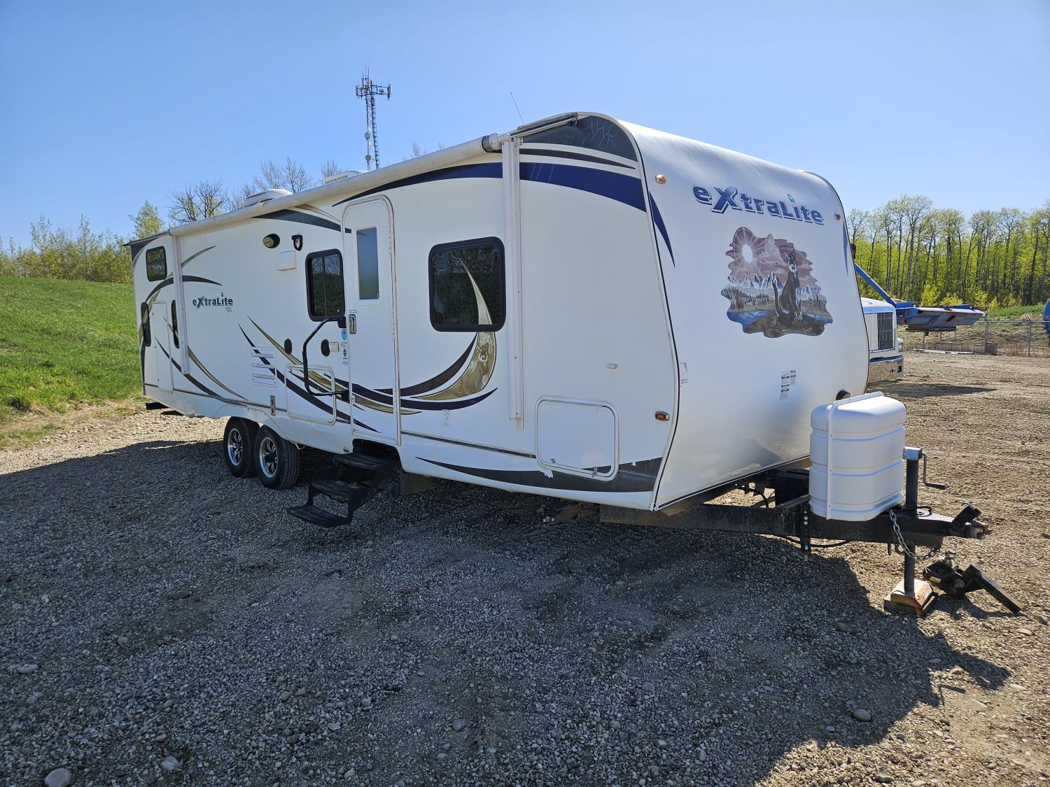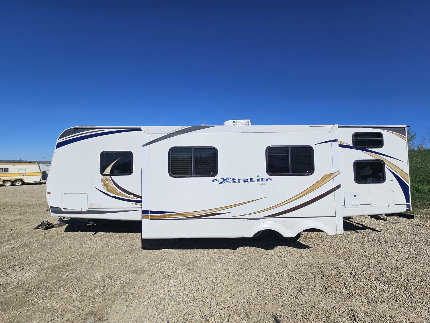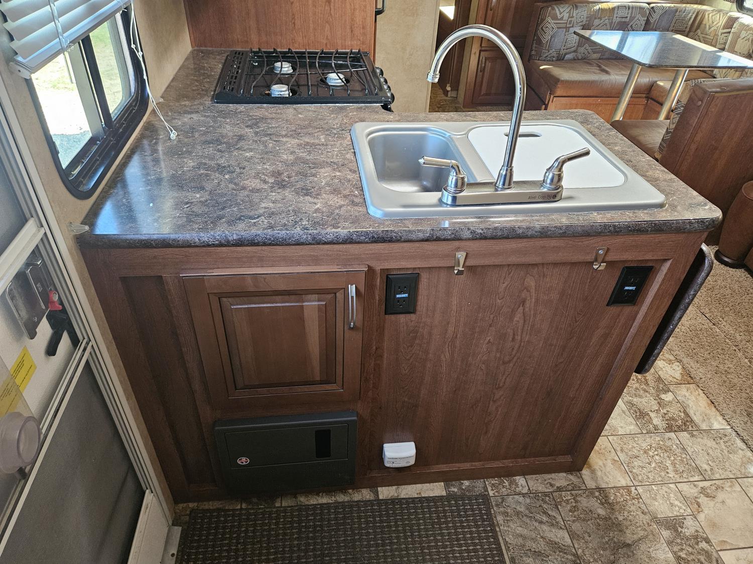 stove, fridge, microwave, full bath, bunk beds, A/C, outdoor shower, 1 slide, power awning, spring suspension, electric brakes, rear bunks with table, U shaped dinette, leather sofa, tv, stereo system, c/w stabilizer hitch, outdoor bbq, aluminum rims, 225/75R15 tires