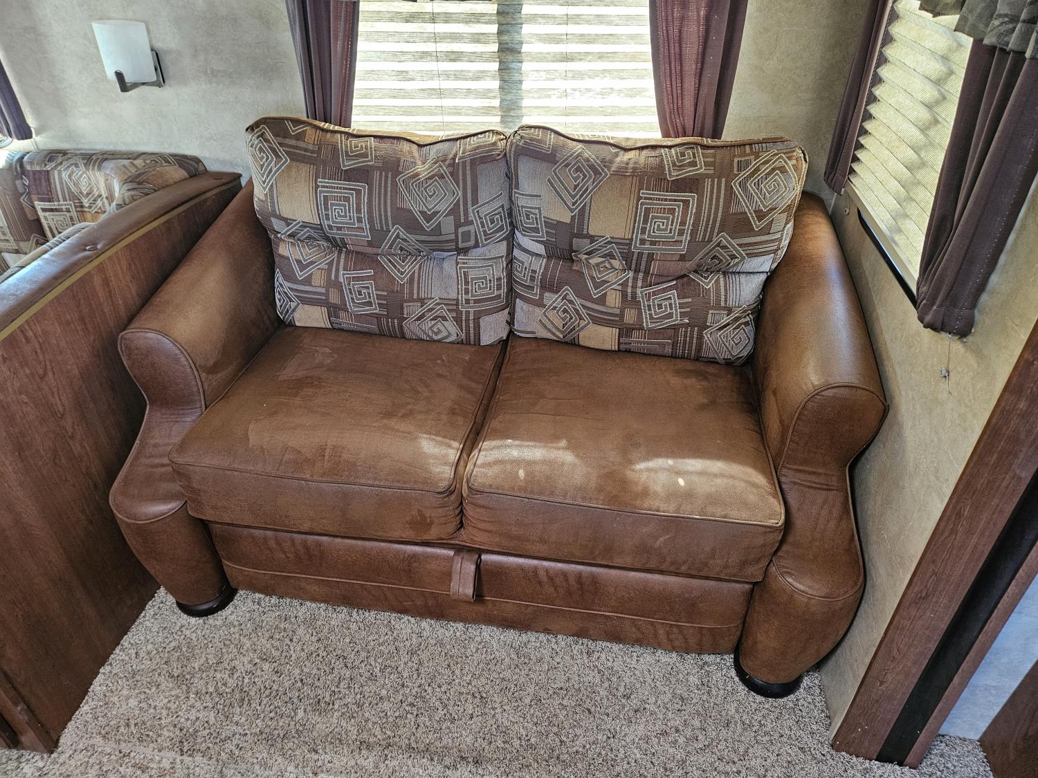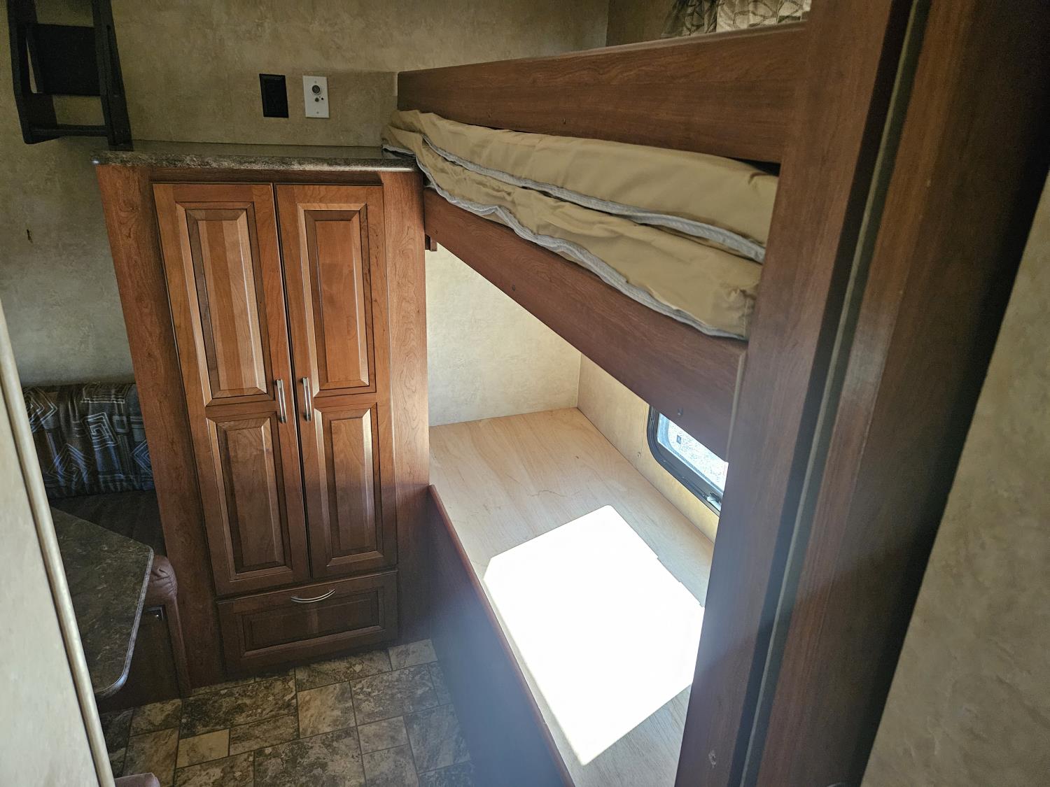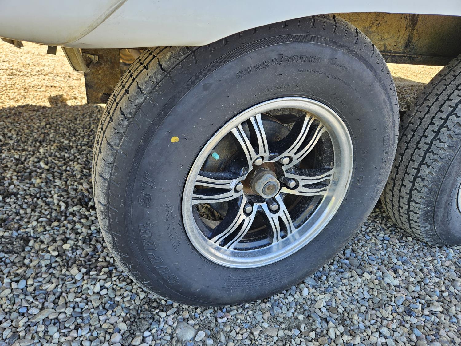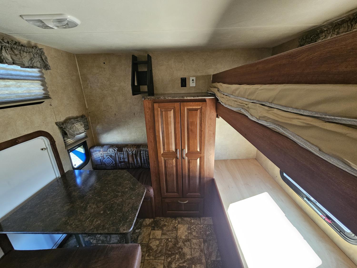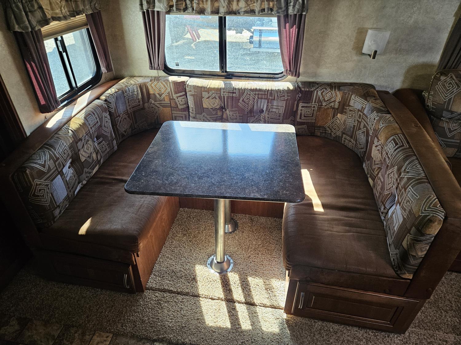 stove, fridge, microwave, full bath, bunk beds, A/C, outdoor shower, 1 slide, power awning, spring suspension, electric brakes, rear bunks with table, U shaped dinette, leather sofa, tv, stereo system, c/w stabilizer hitch, outdoor bbq, aluminum rims, 225/75R15 tires