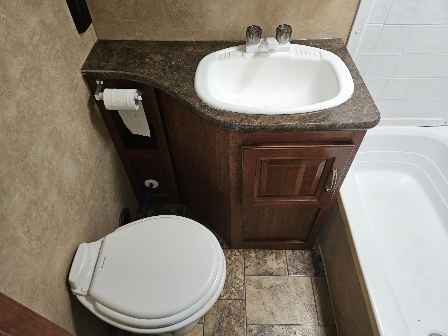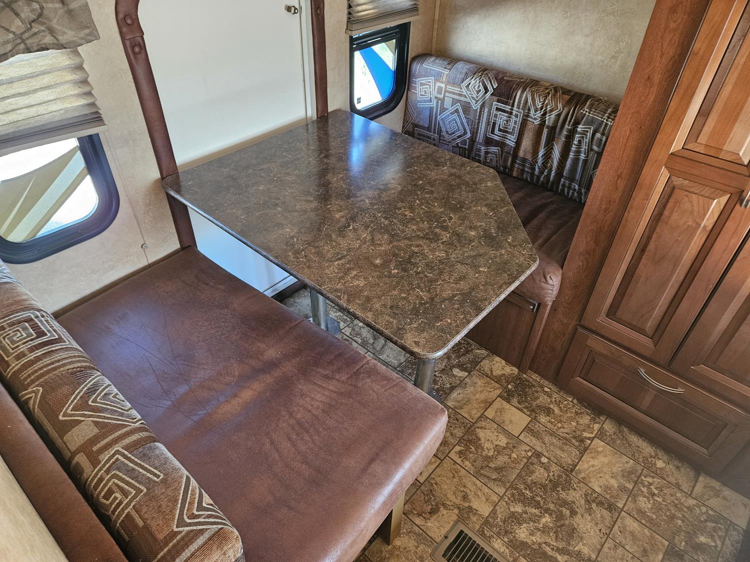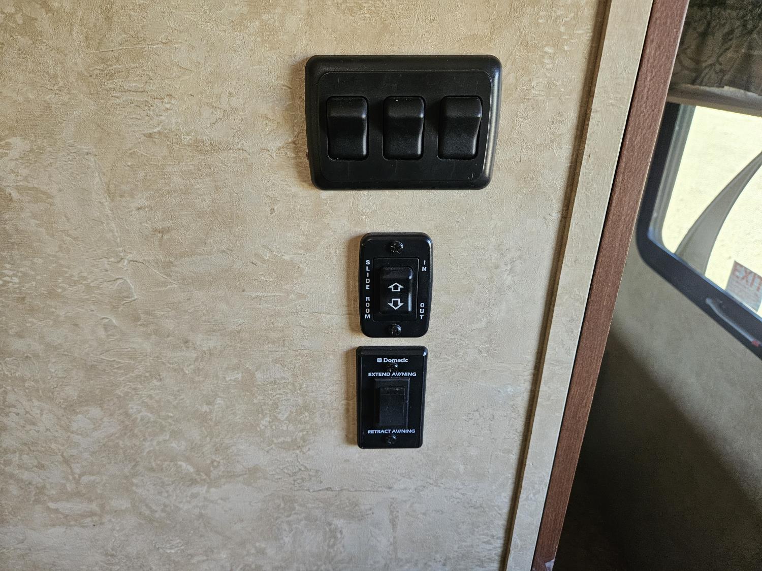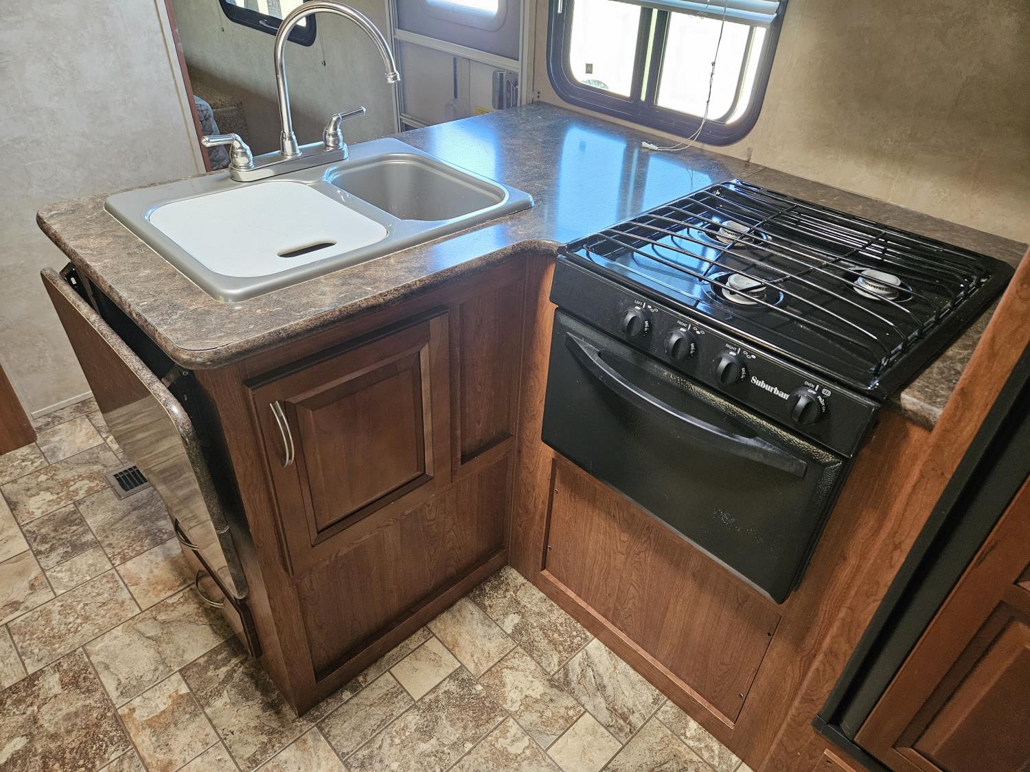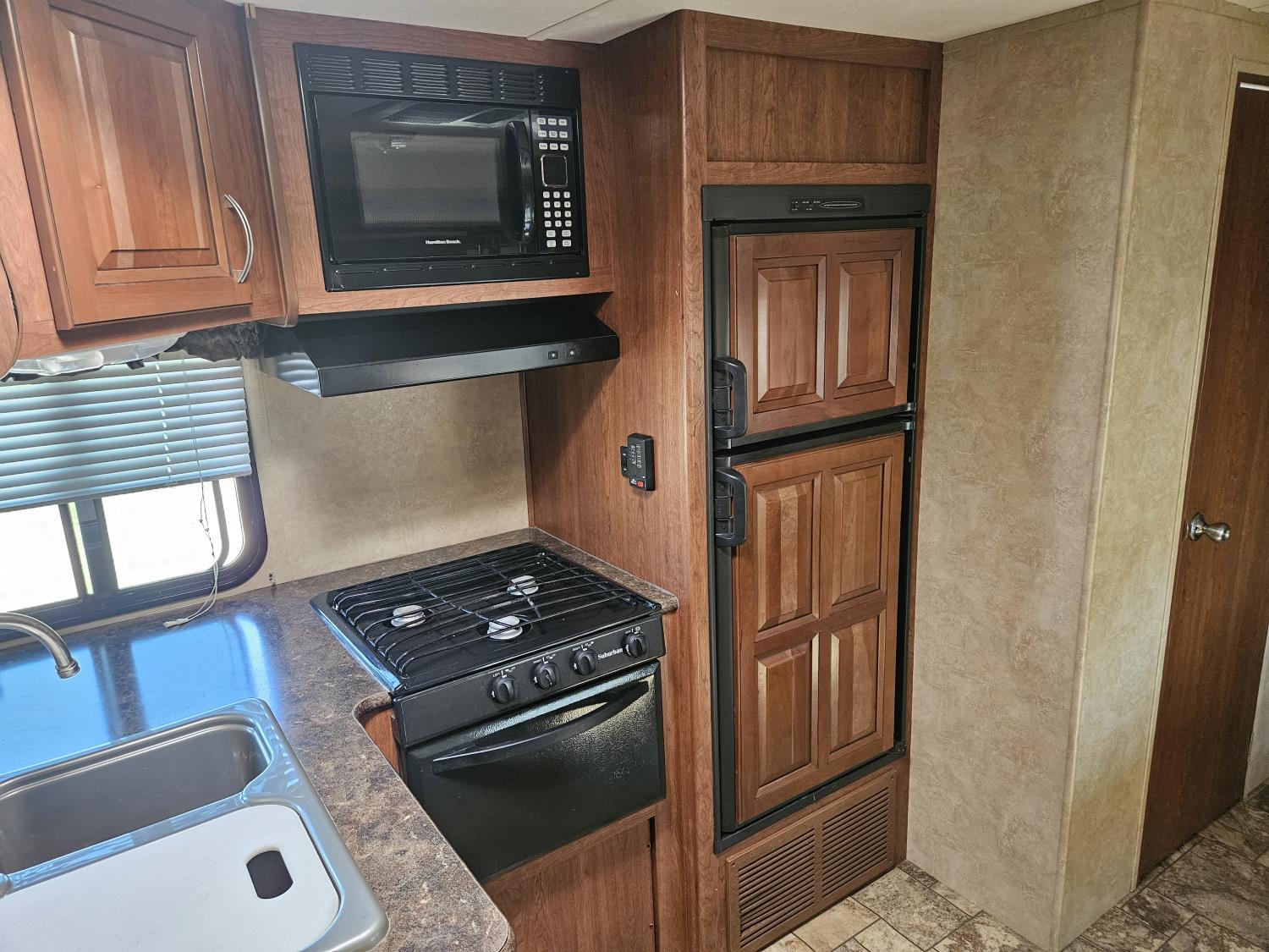stove, fridge, microwave, full bath, bunk beds, A/C, outdoor shower, 1 slide, power awning, spring suspension, electric brakes, rear bunks with table, U shaped dinette, leather sofa, tv, stereo system, c/w stabilizer hitch, outdoor bbq, aluminum rims, 225/75R15 tires