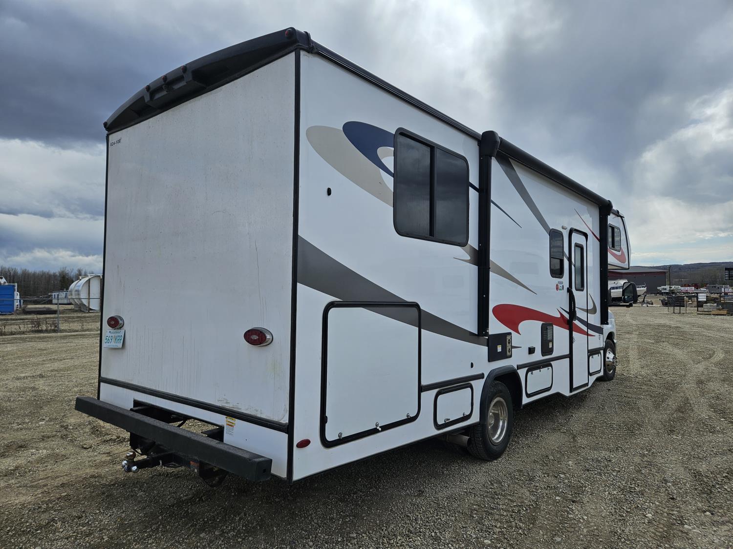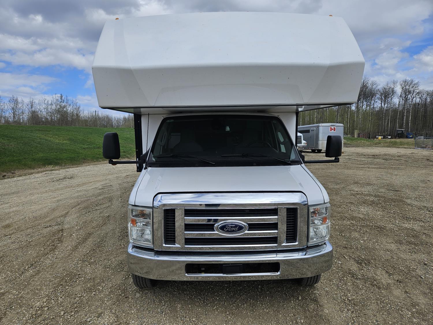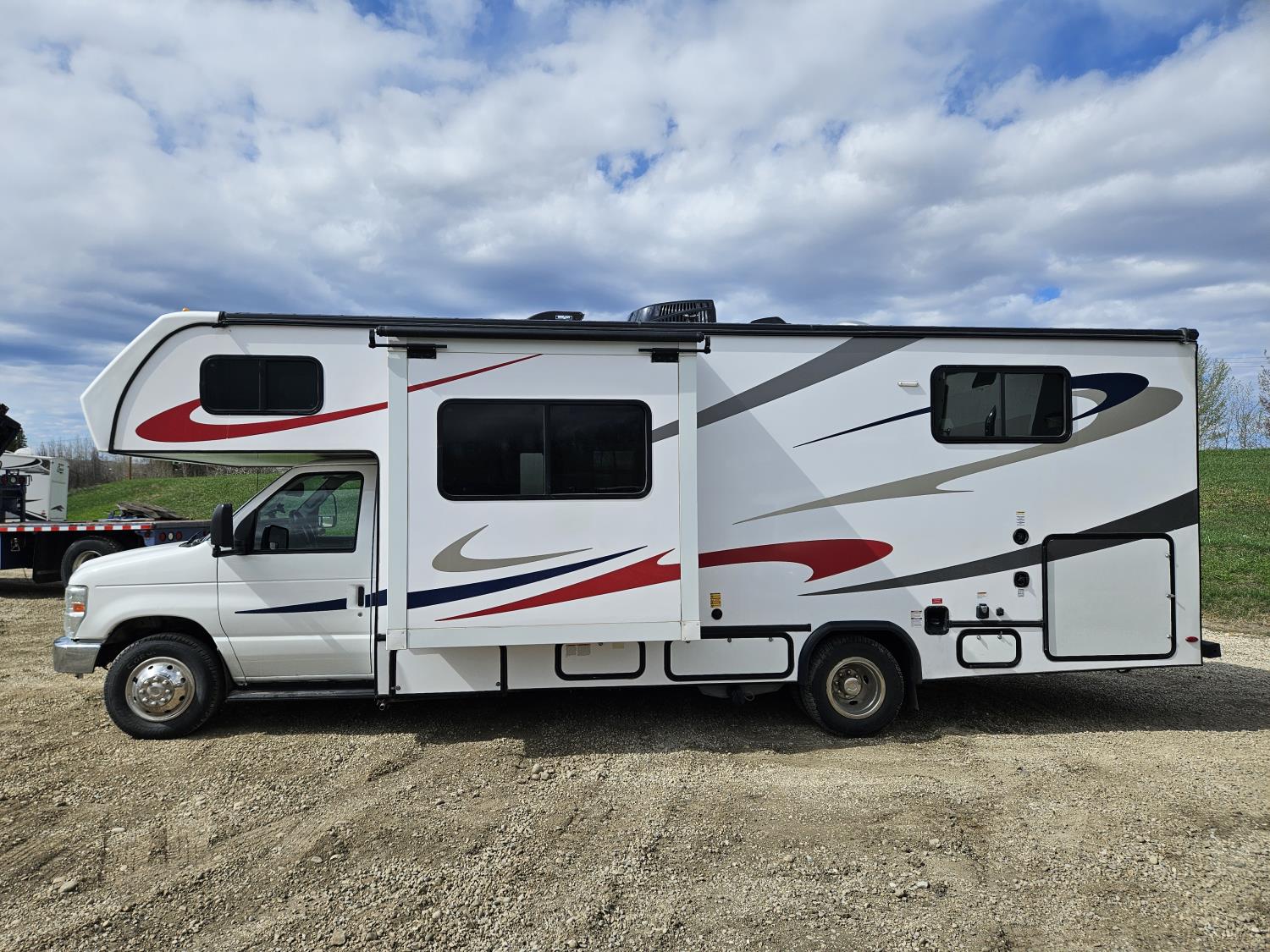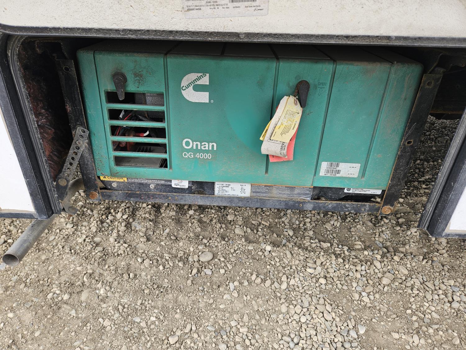 7.3 L V8 gas engine, automatic transmission, Ford E450 chassis, P/W, P/L, single slide, A/C, rear bedroom, full bathroom, stove, oven, microwave, dinette, over cab bunk, chair, TV, solar panels, power awning, onboard Onan QG 4000 gas powered generator, storage compartments, back up camera, equipped with bedding and kitchenware, receiver hitch, rear duals, 225/75R16 tires