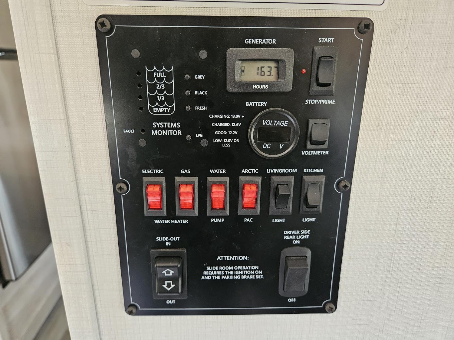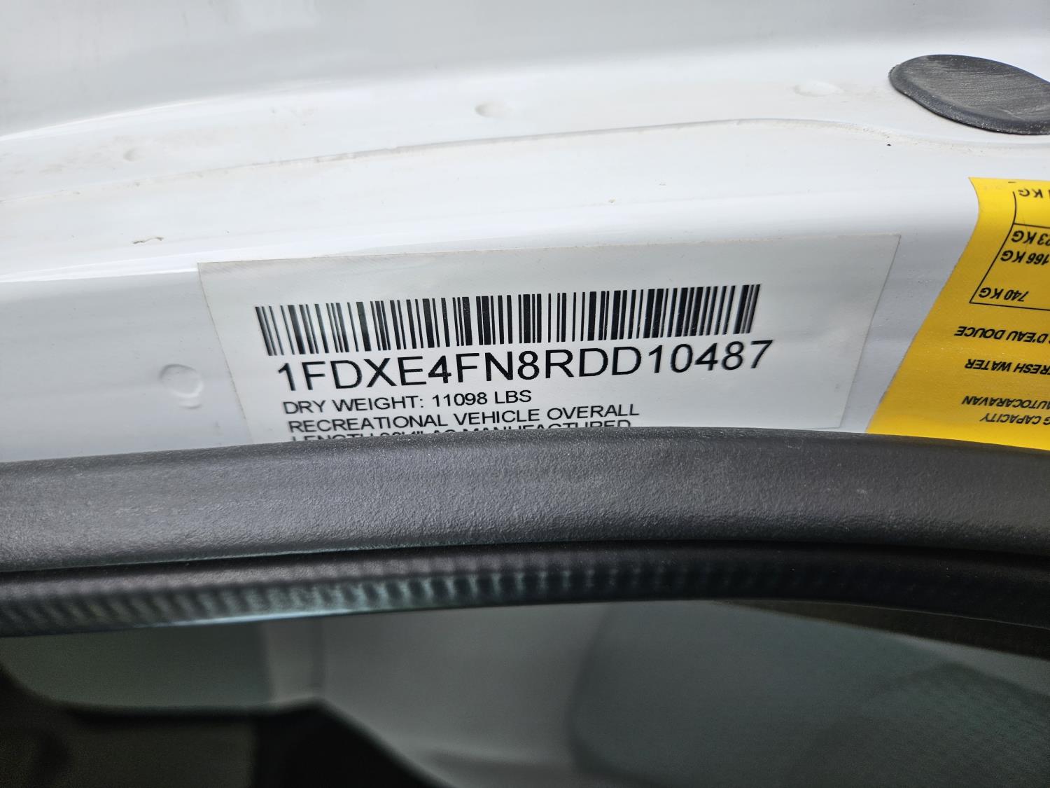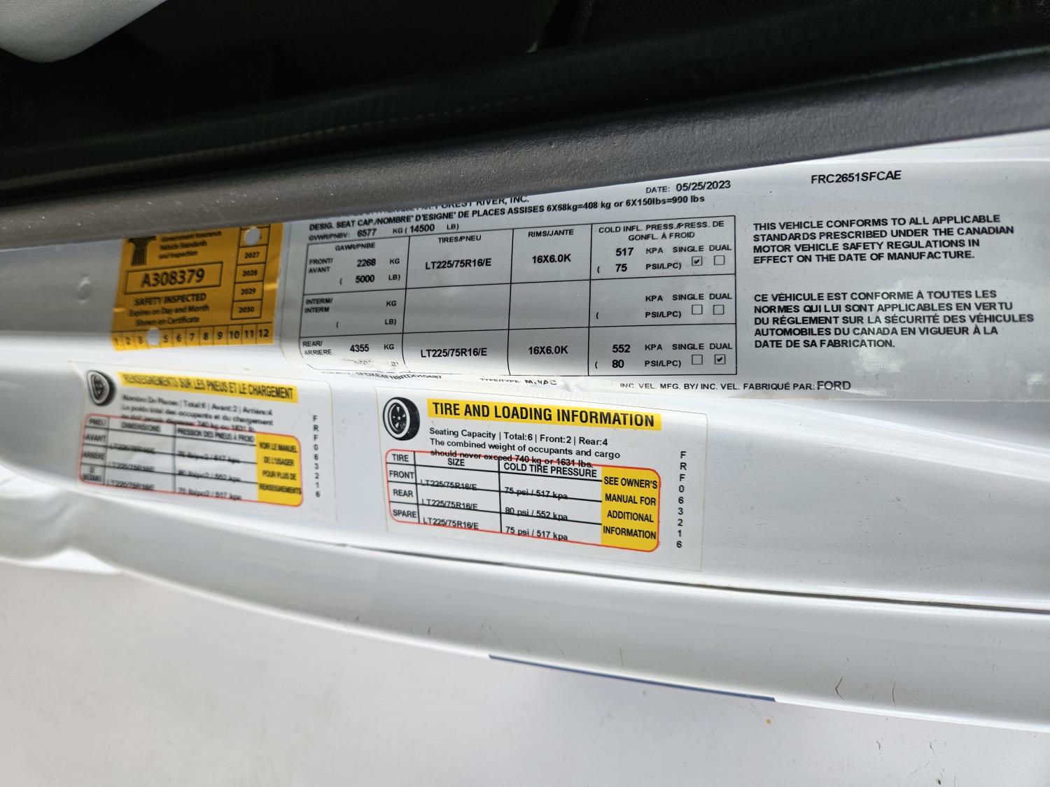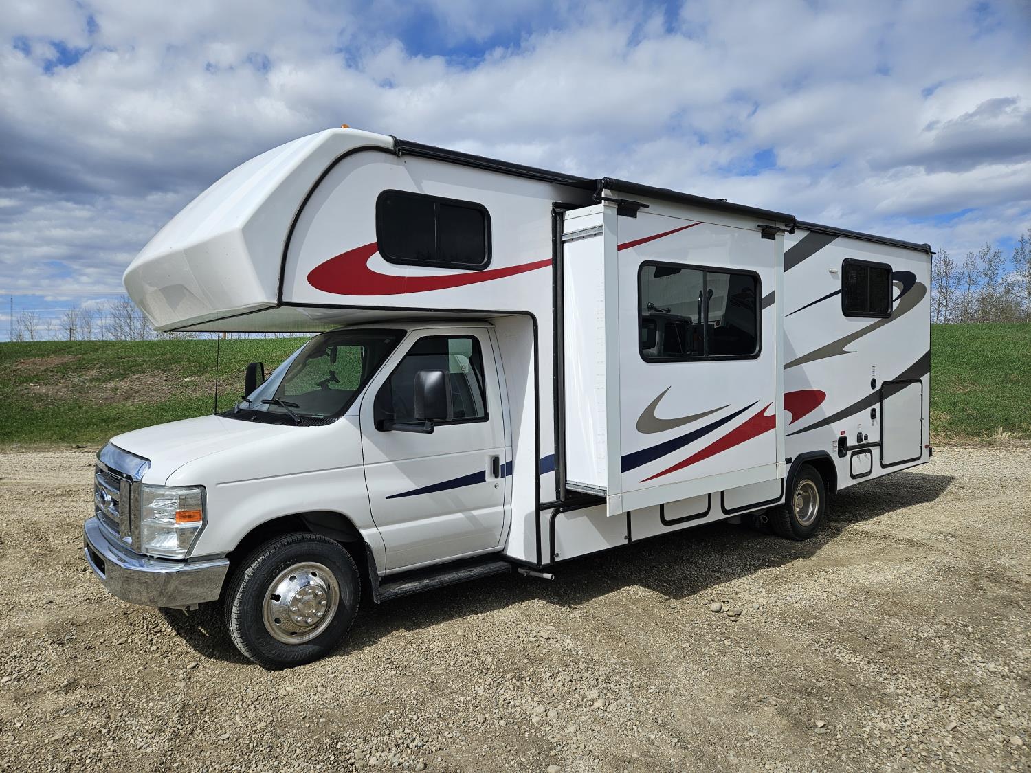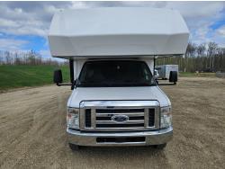 7.3 L V8 gas engine, automatic transmission, Ford E450 chassis, P/W, P/L, single slide, A/C, rear bedroom, full bathroom, stove, oven, microwave, dinette, over cab bunk, chair, TV, solar panels, power awning, onboard Onan QG 4000 gas powered generator, storage compartments, back up camera, equipped with bedding and kitchenware, receiver hitch, rear duals, 225/75R16 tires