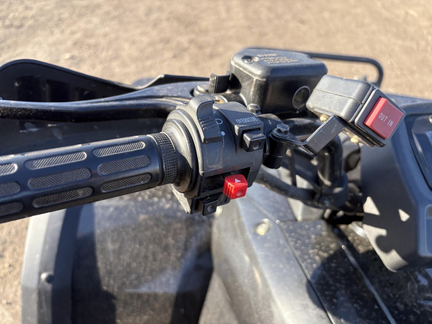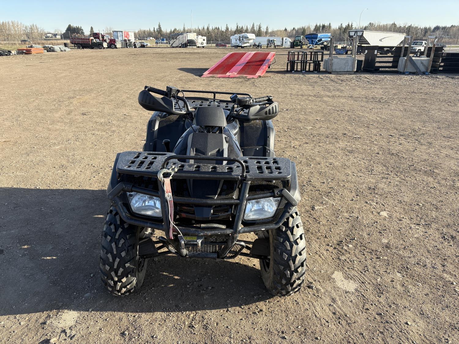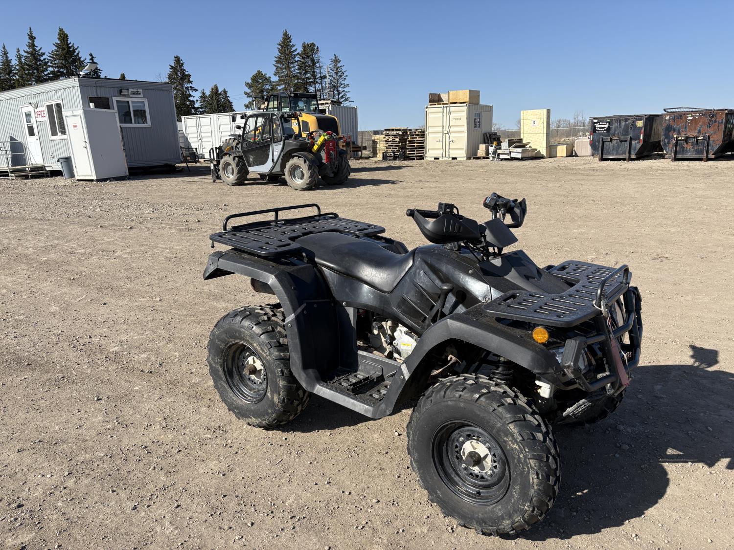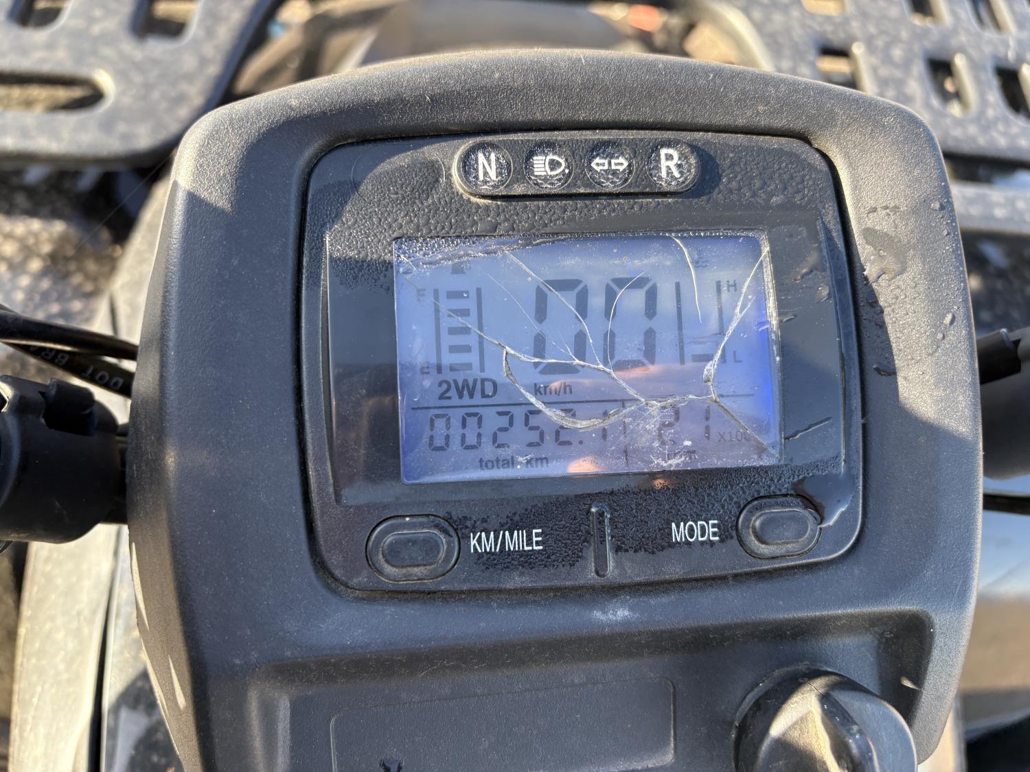300 cc fuel injected water cooled engine, automatic transmission, Hi/Lo range, reverse, front and rear racks, front winch, alarm theft system, remote start, needs battery, 25X8-12 front tires, 25X10-12 rear tires