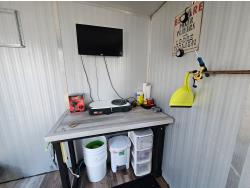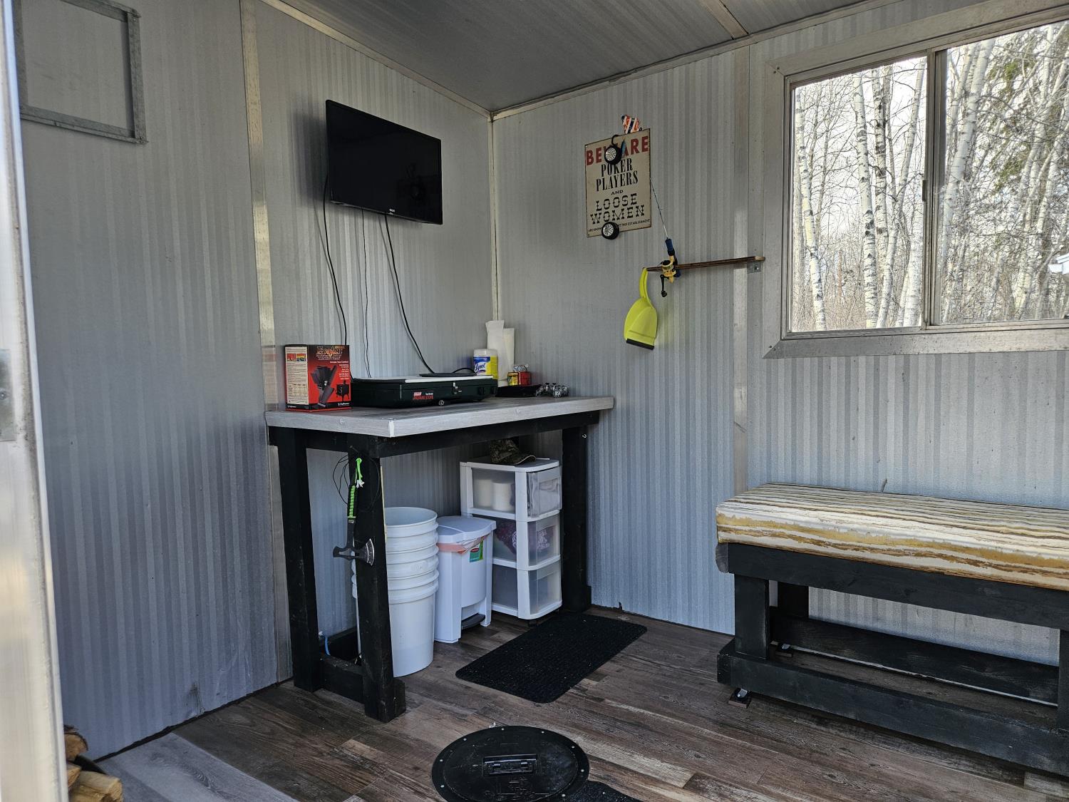 TV, hot plate, 3 holes with covers, rigged up for generator and wood stove.