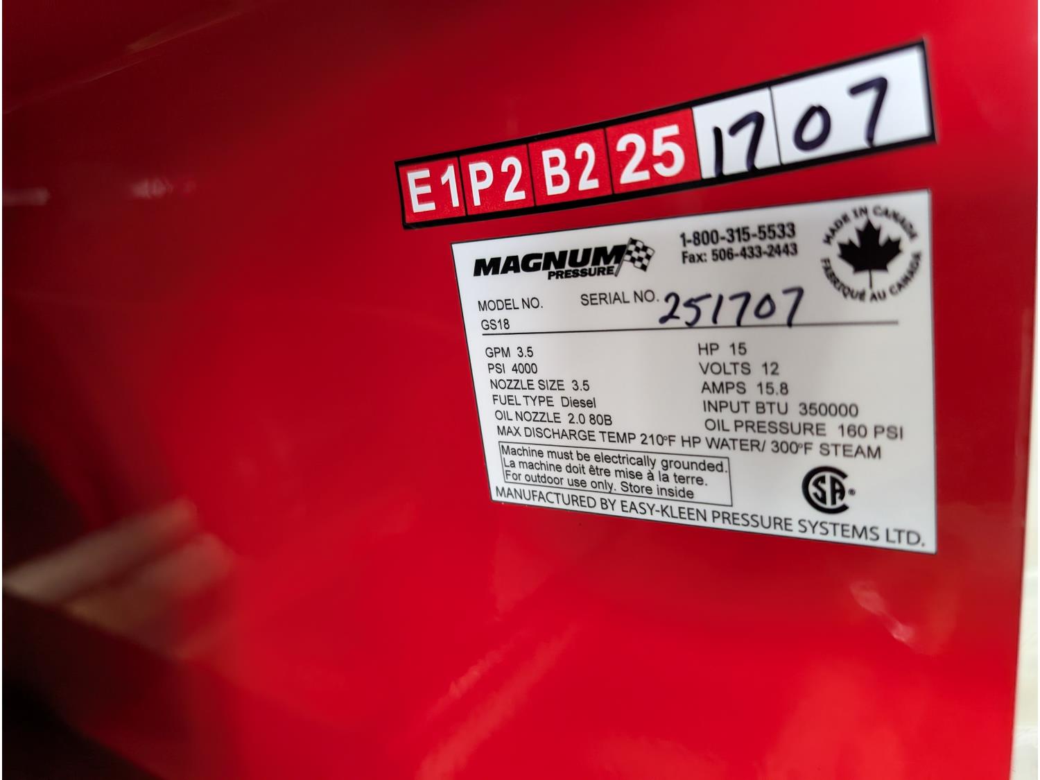 3.5 GPM at 4000 PSI, 15 HP, gasoline engine, electric start, 12 volt burner, oil/diesel fired burned/thermostat, schedule 80 coil with stainless steel housing, fully welded, powder coated frame, 10 gallon poly fuel tank, 30' hose and wand