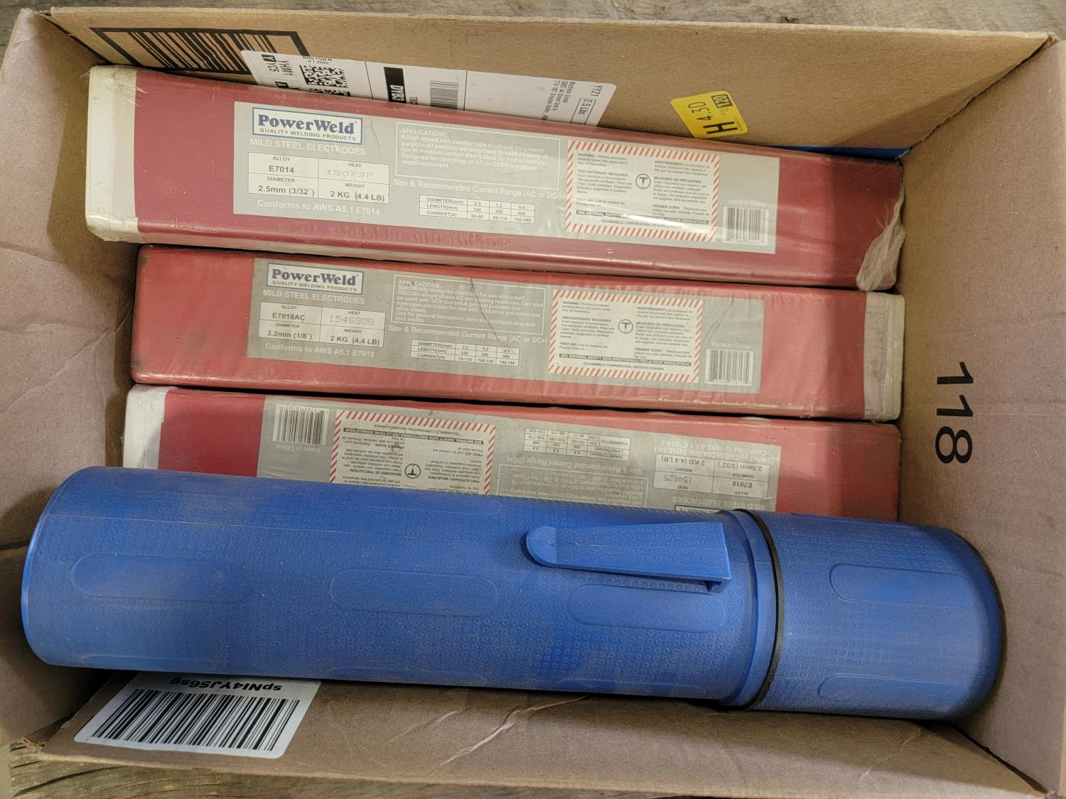(3) boxed of rods, (1) rod holder, (1) welding table, (1) trouble light