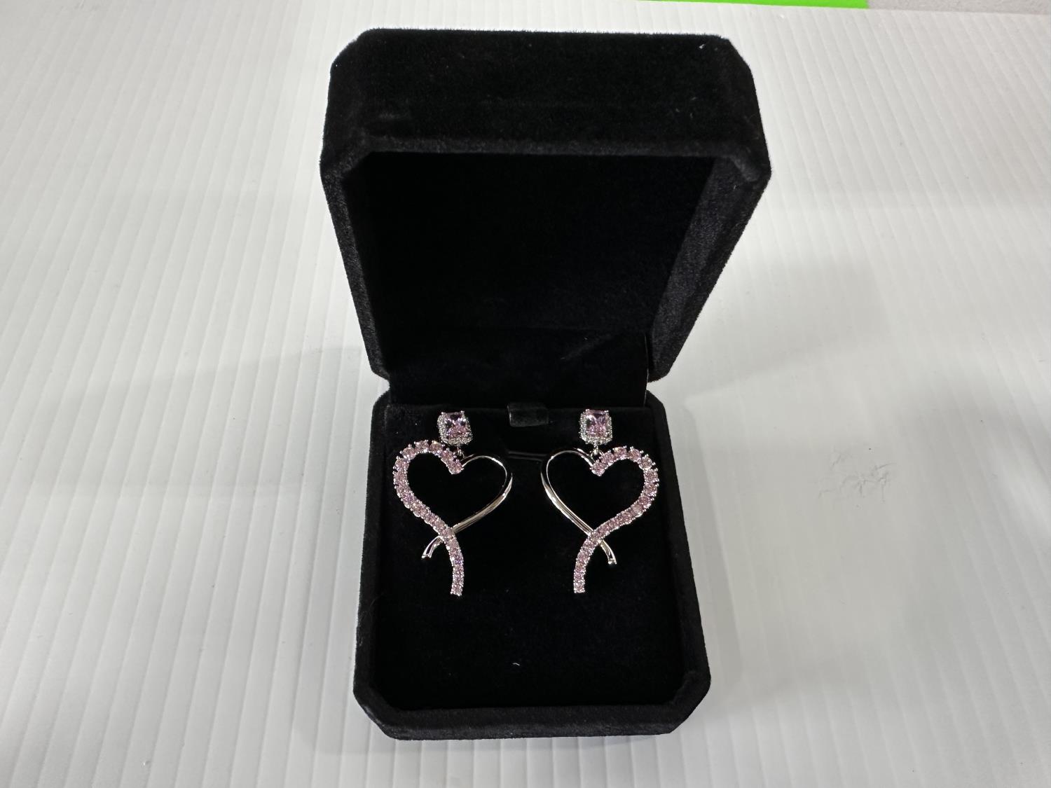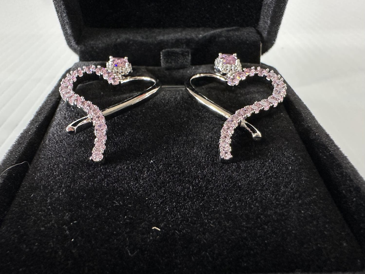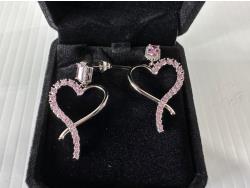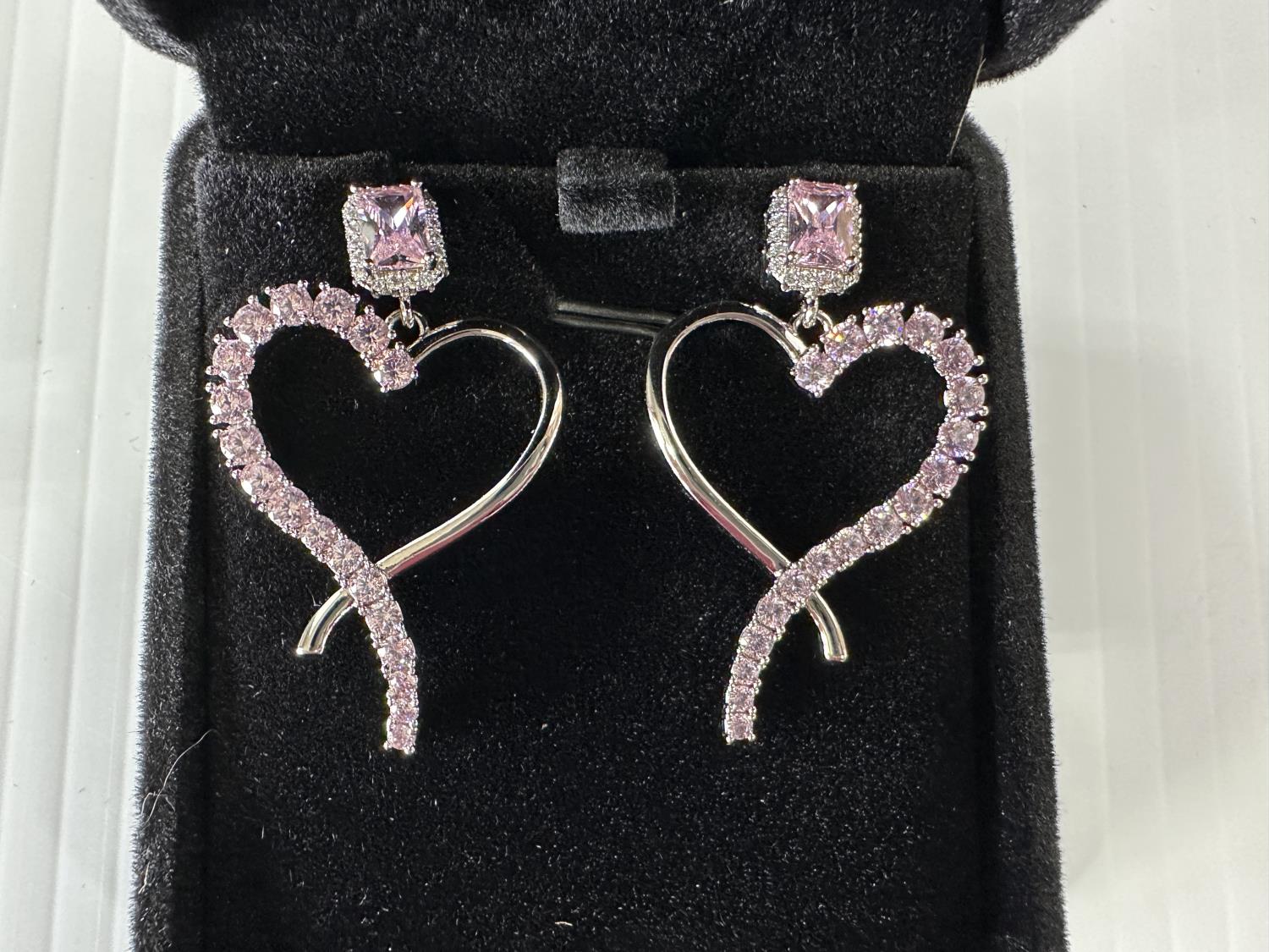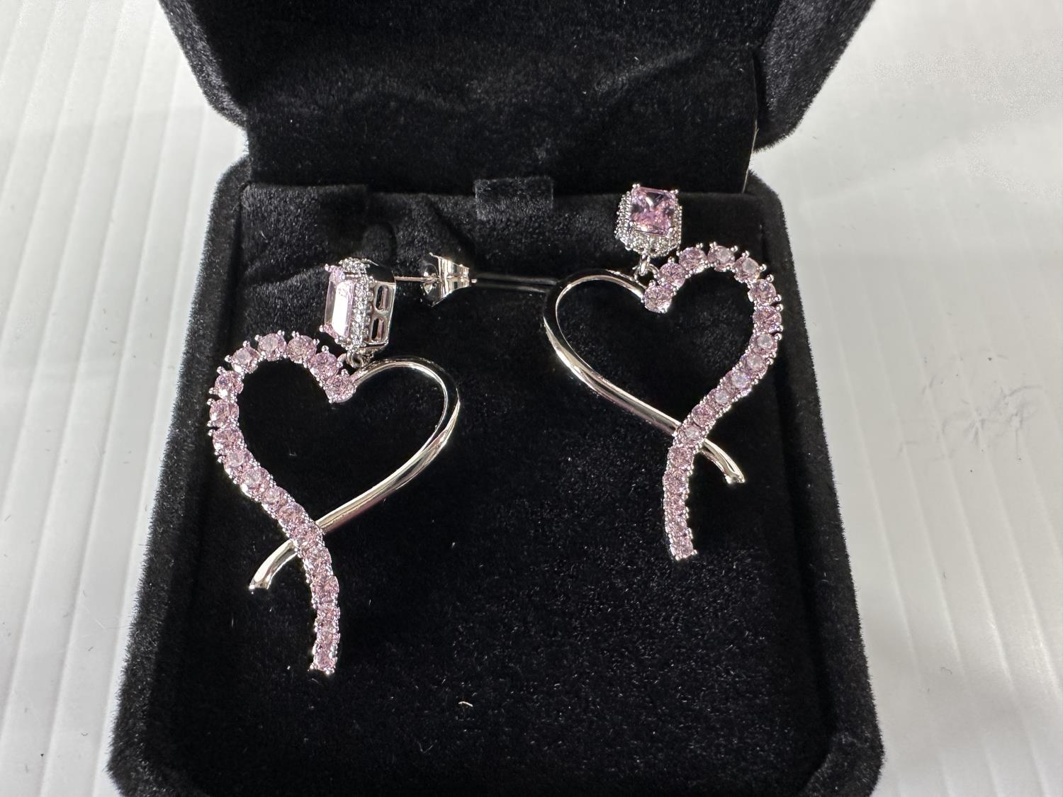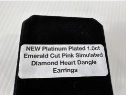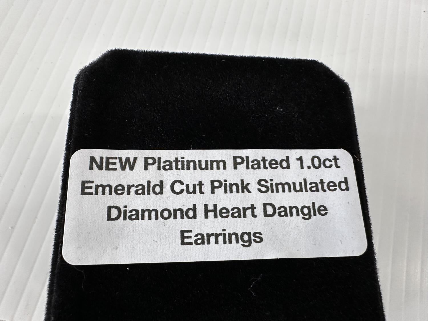 5015 Smartlife Platinum Plated 1.0 Ct Emerald Cut Pink Simulated Diamond Heart Dangle Earrings (Unused)