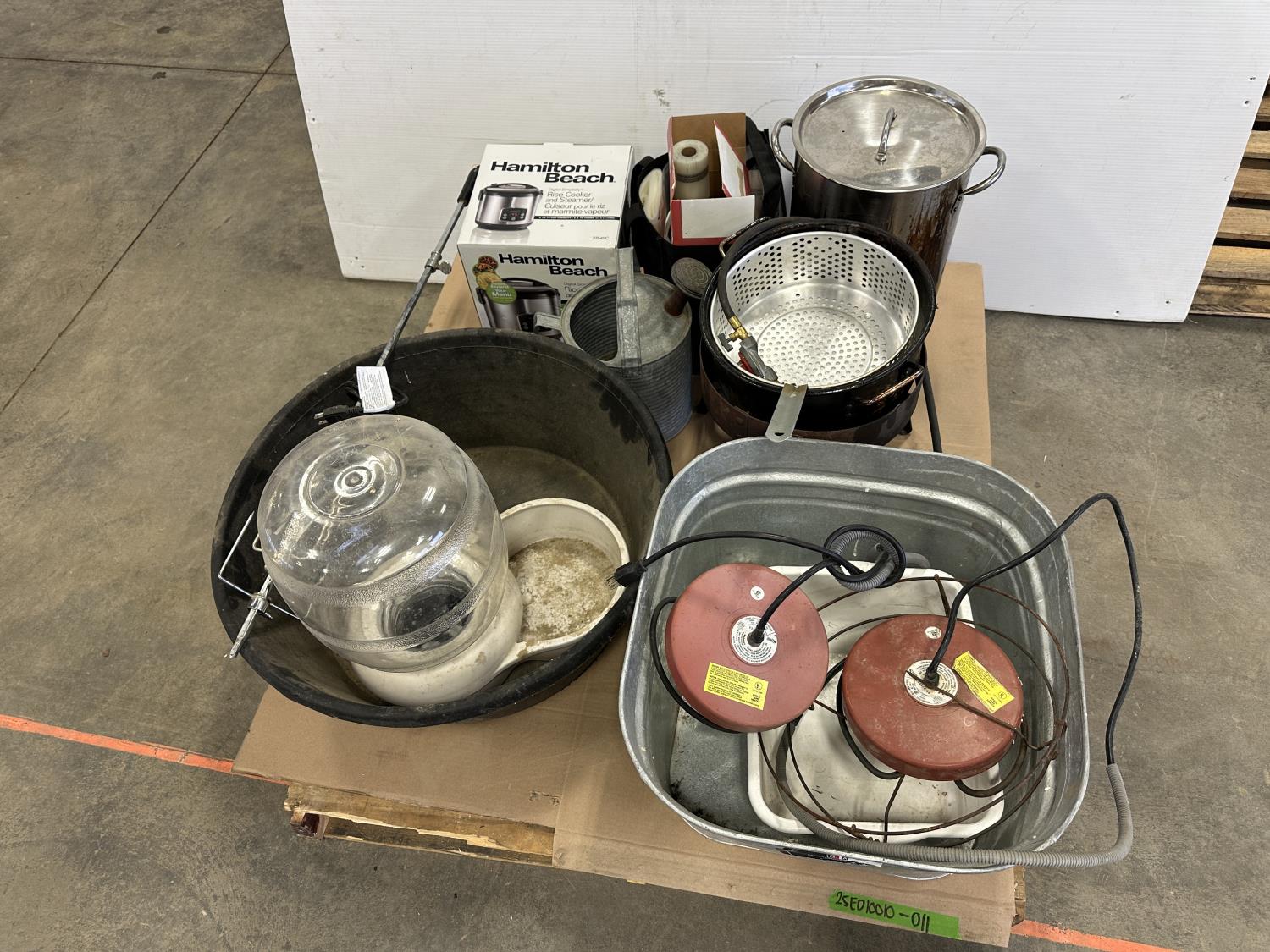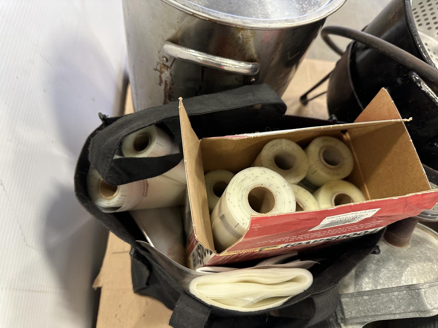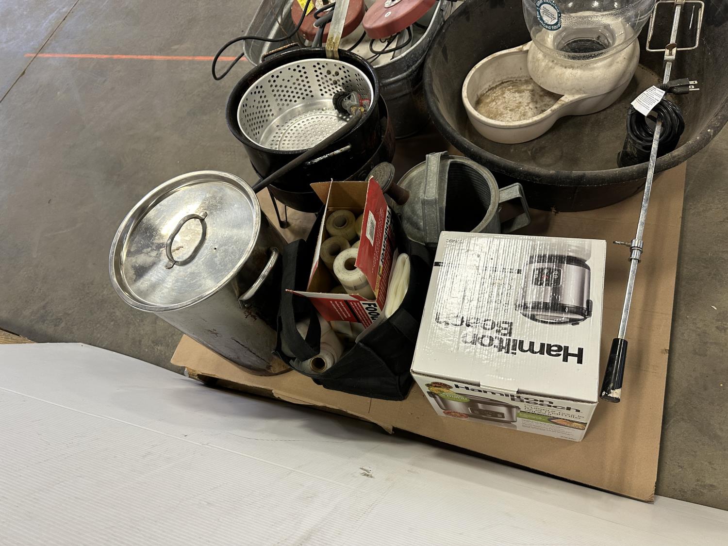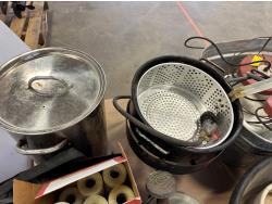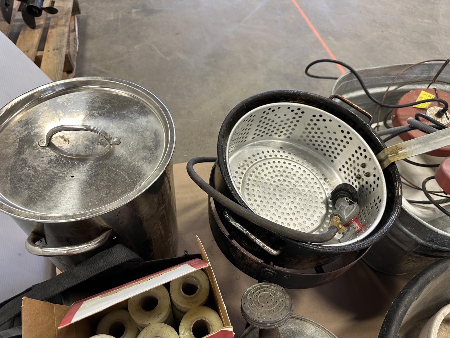 Propane burner with pots, water heaters, rice cooker (unused), vacuum sealer bags, rubber basin, galvanized basin