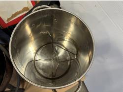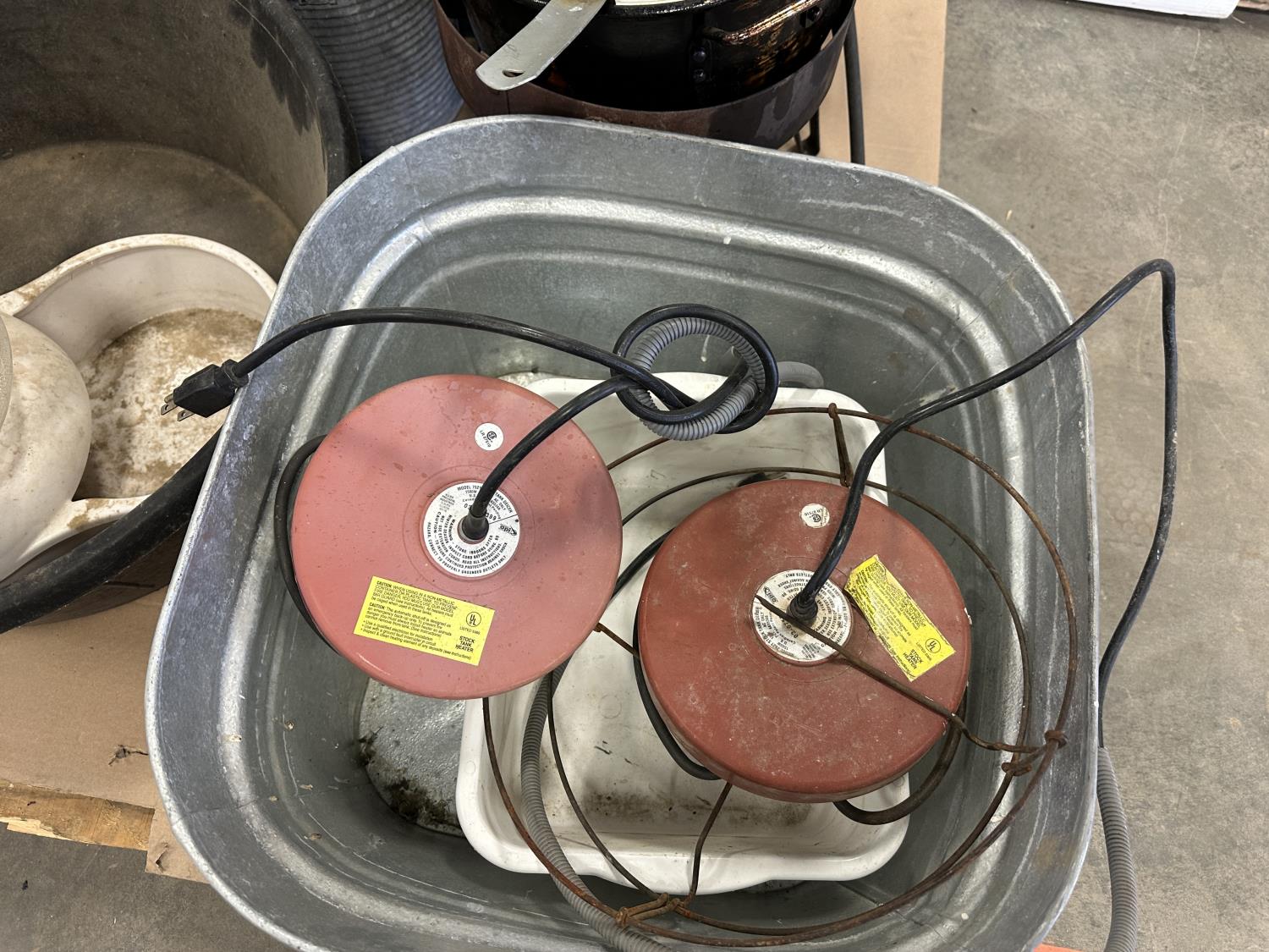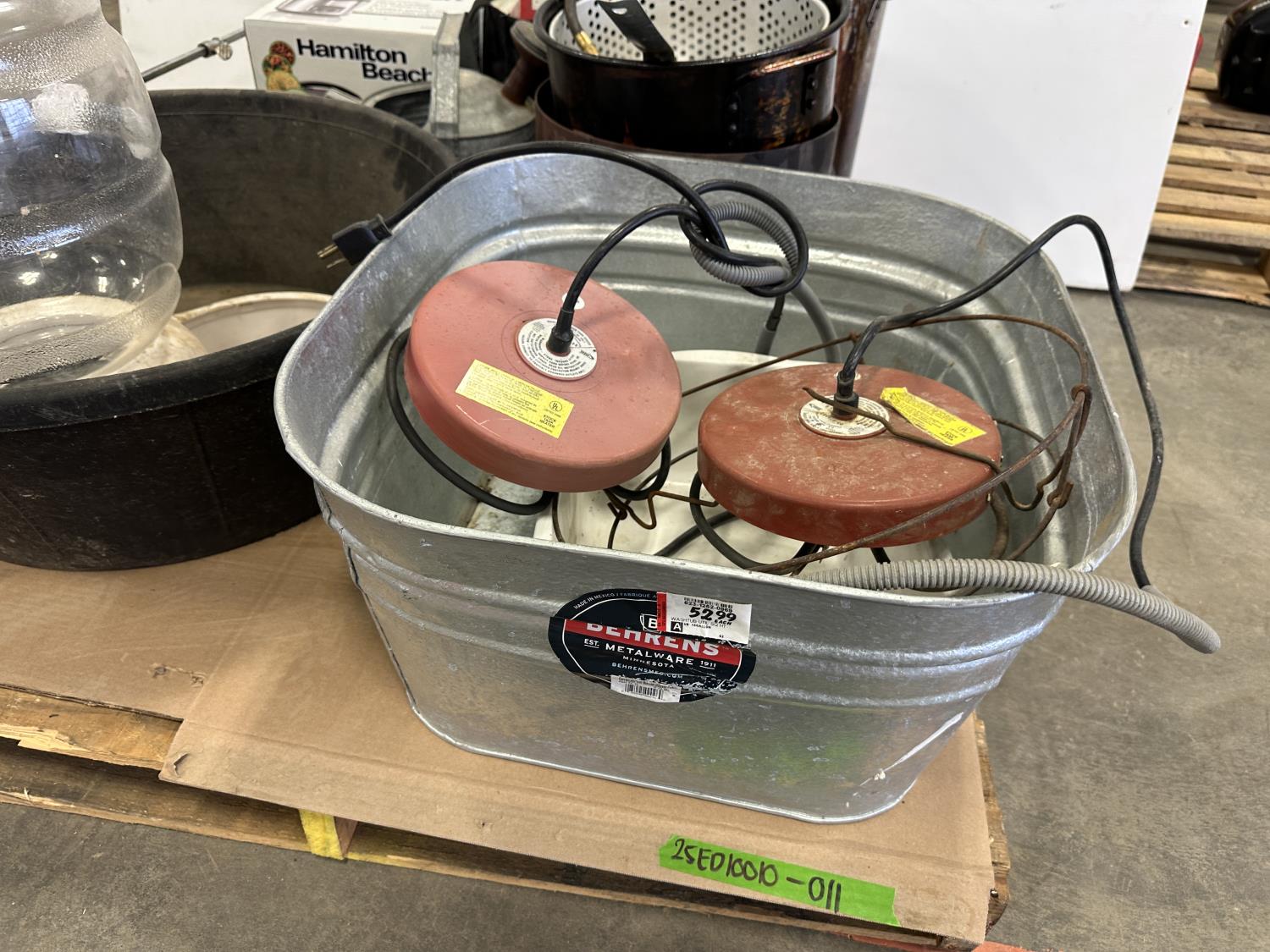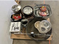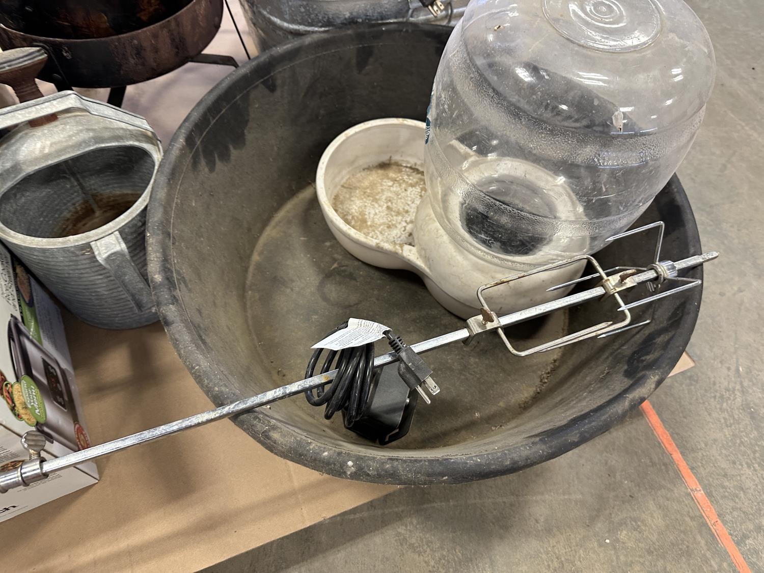 Propane burner with pots, water heaters, rice cooker (unused), vacuum sealer bags, rubber basin, galvanized basin