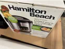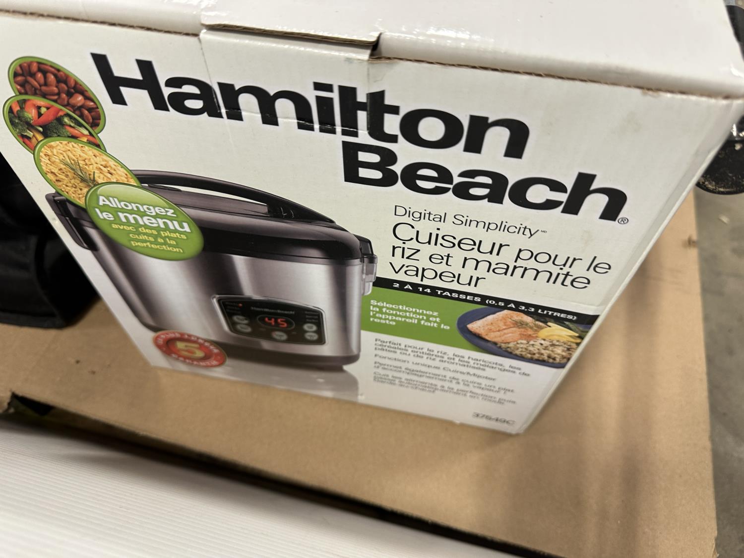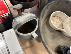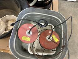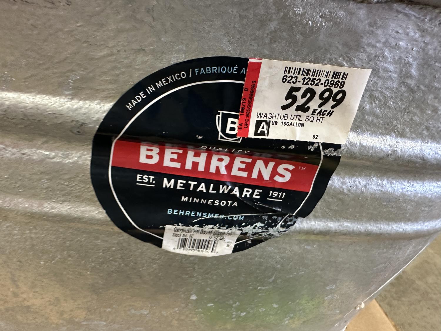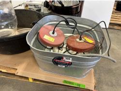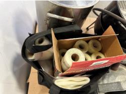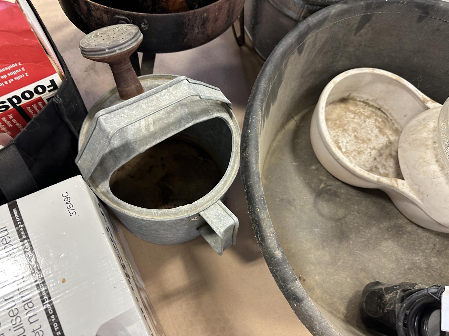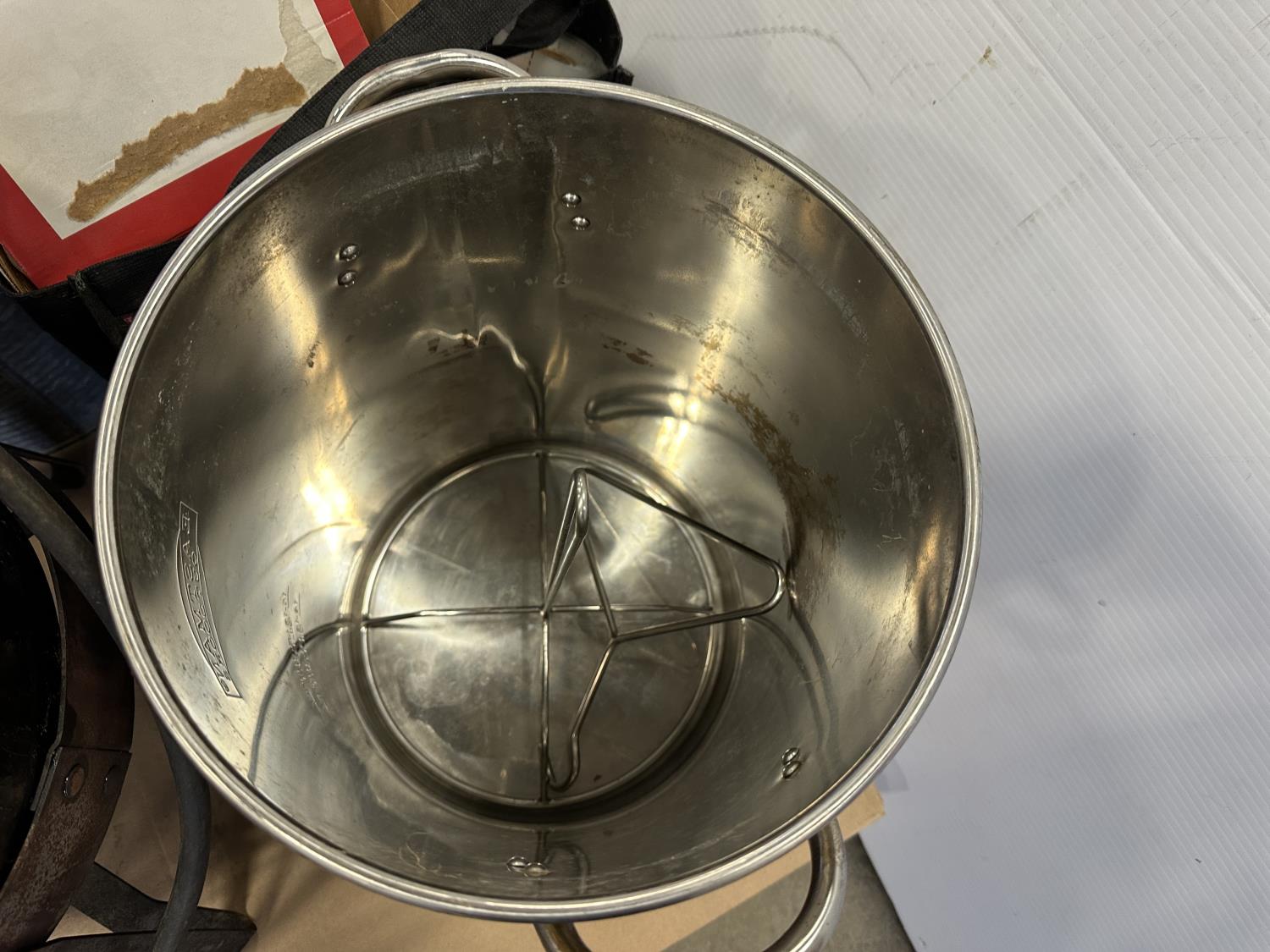 Propane burner with pots, water heaters, rice cooker (unused), vacuum sealer bags, rubber basin, galvanized basin