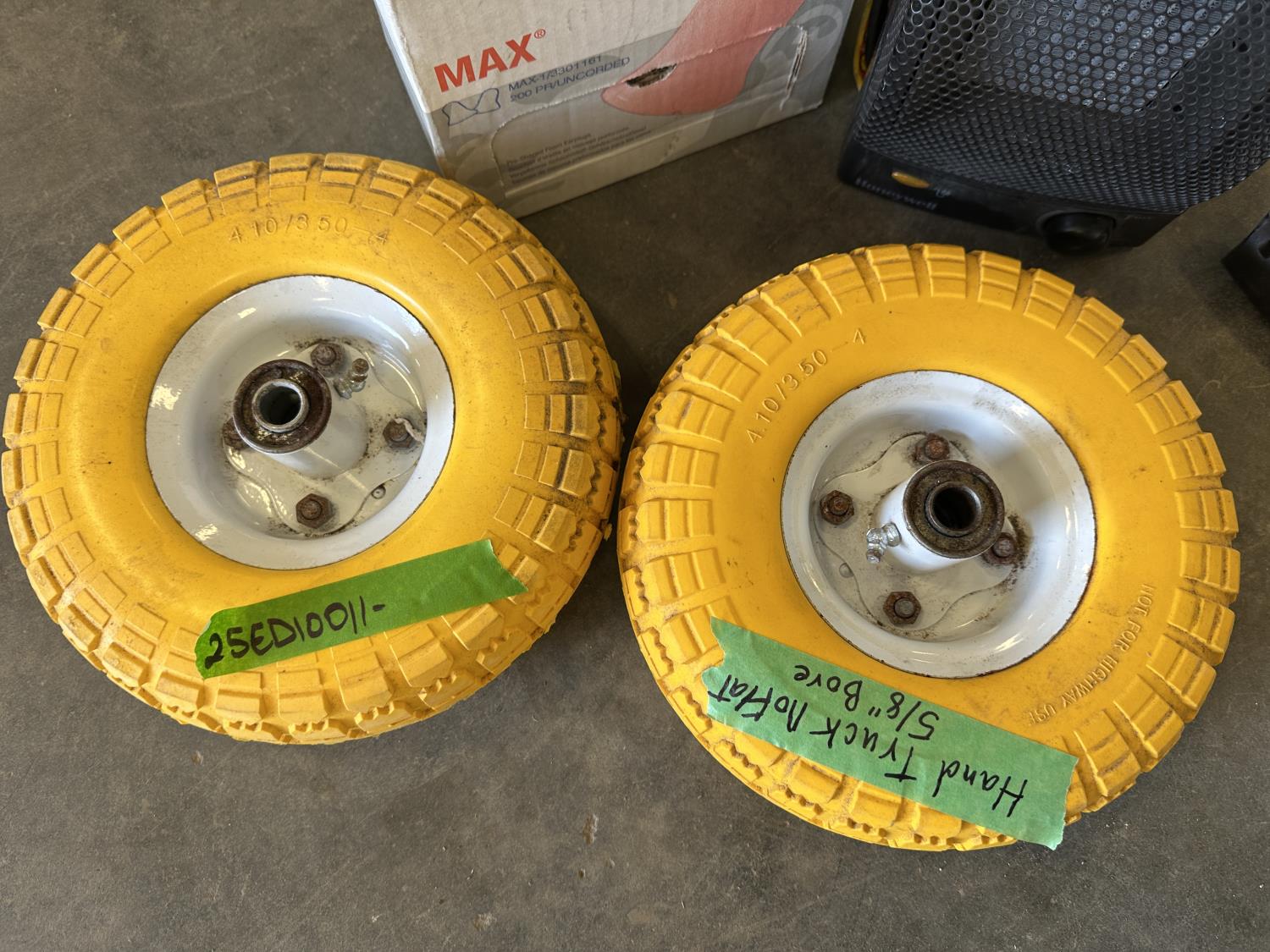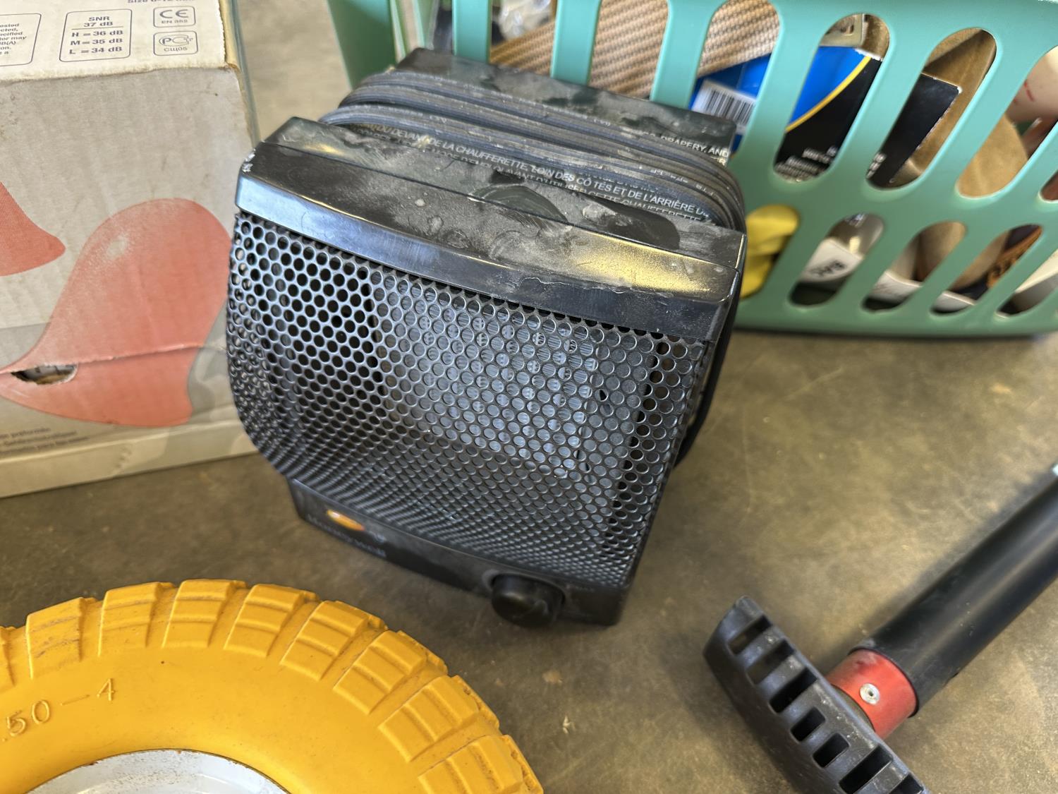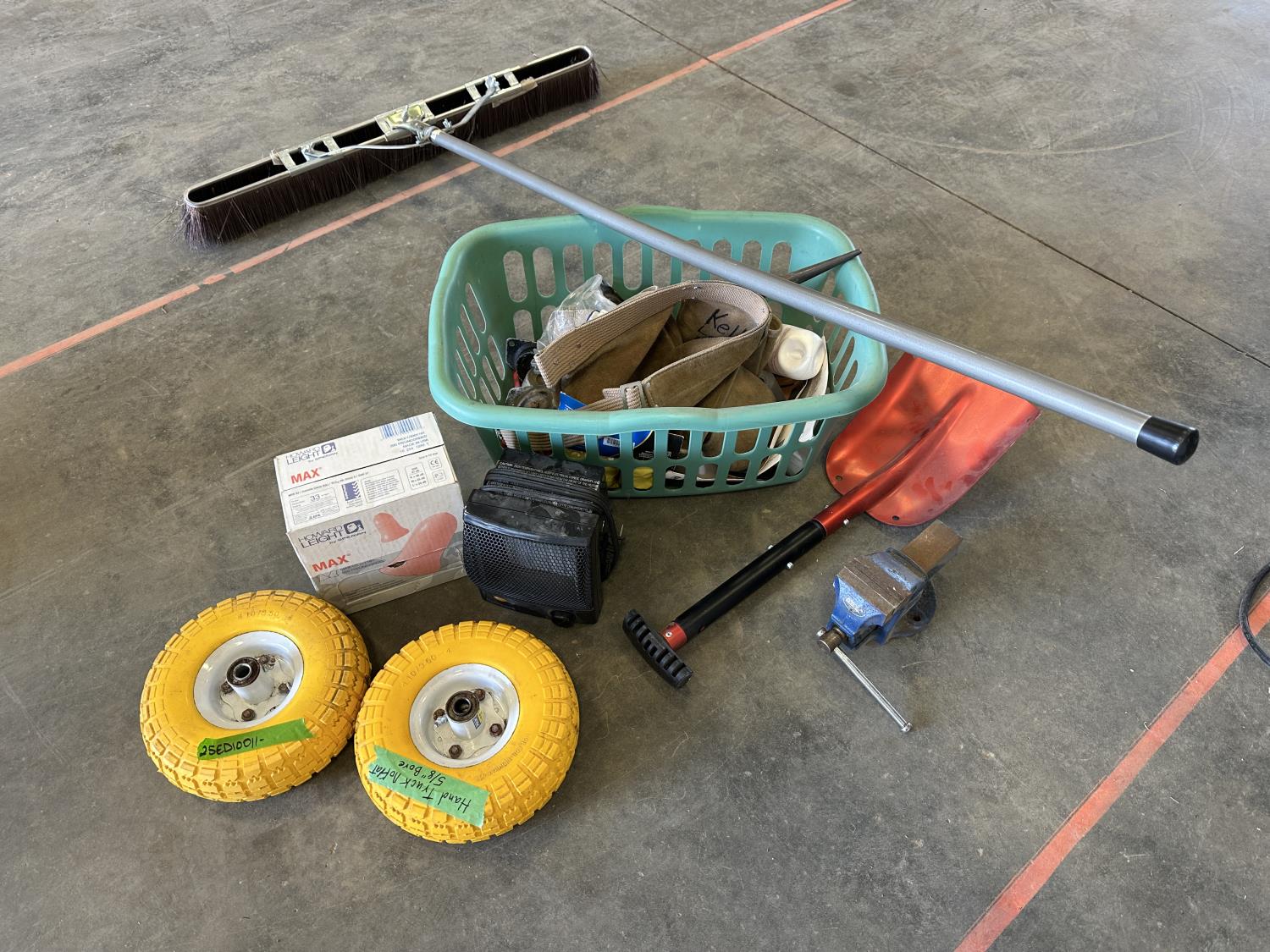 5/8 inch bore never flat hand truck tires, space heater, 3 inch Record vise, castor wheels, 35 inch shop broom, ear plugs