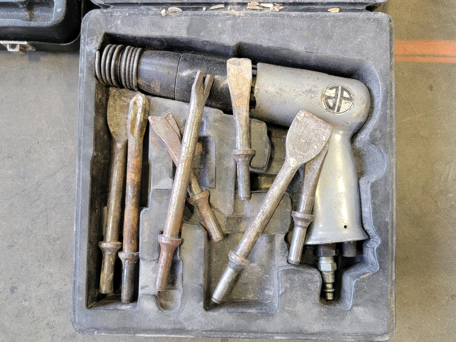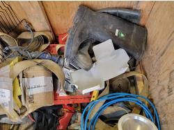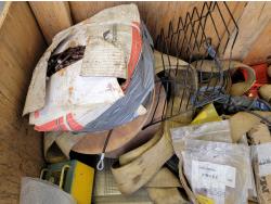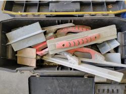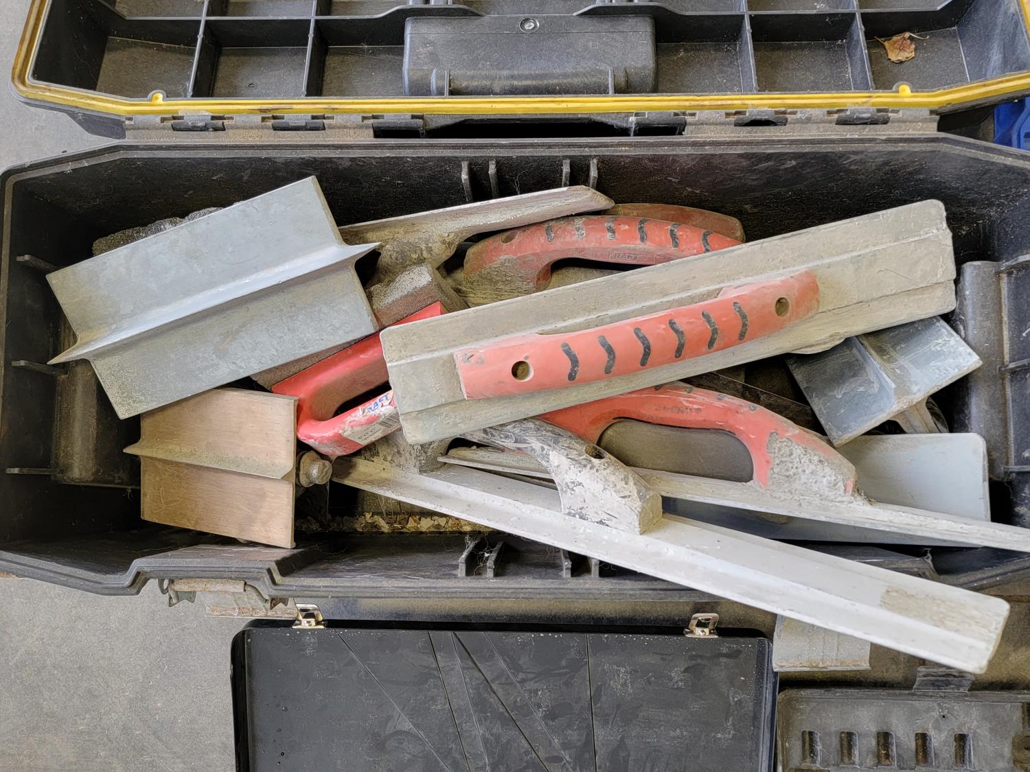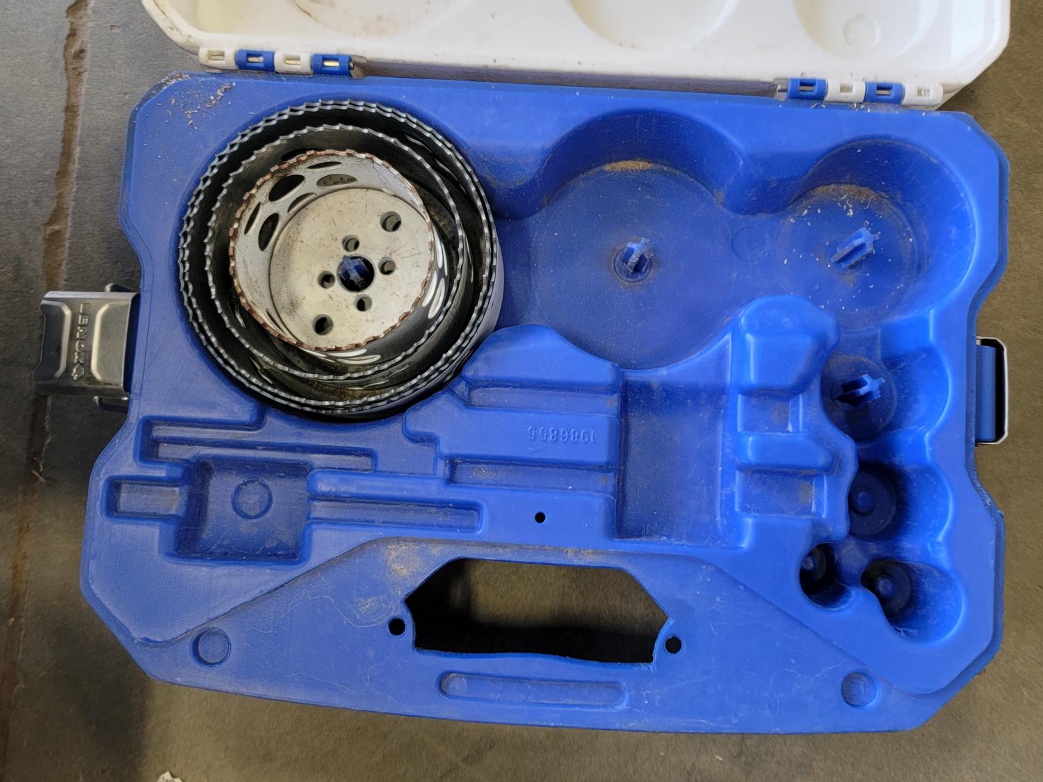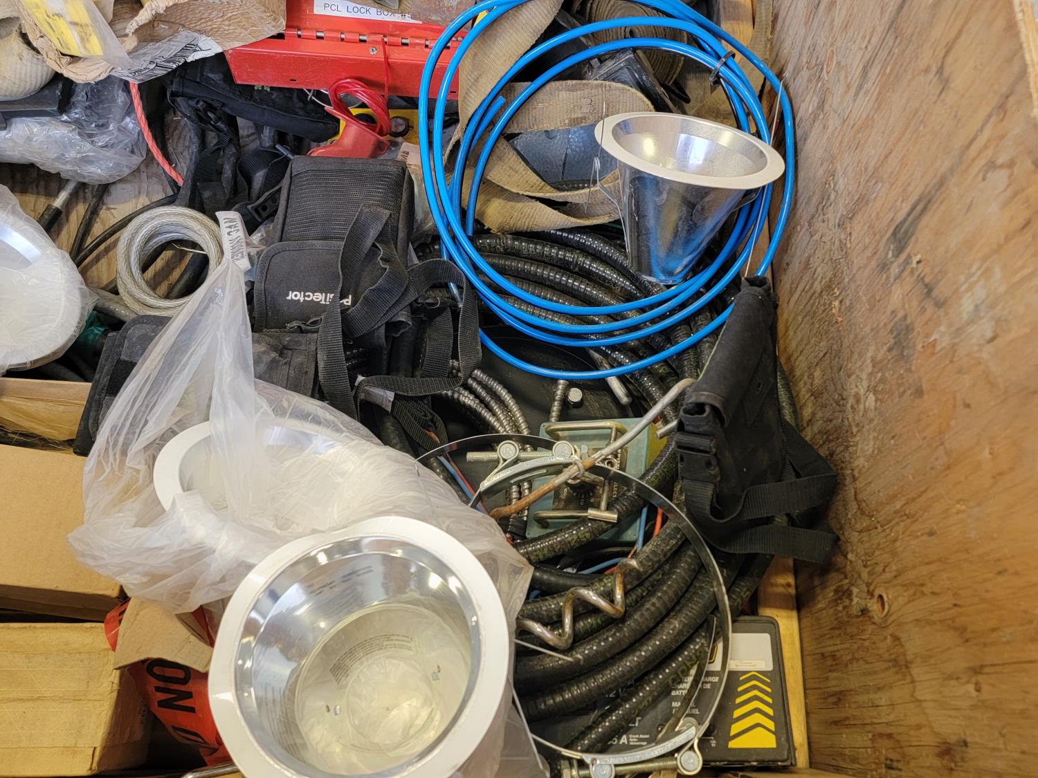 hammer chisel, socket wrench, atf adapter kit, hole saw, cement trowels, tie down ratchets, rope, propane heater, qty of 2 inch two piece shower drain, qty of cables, nails