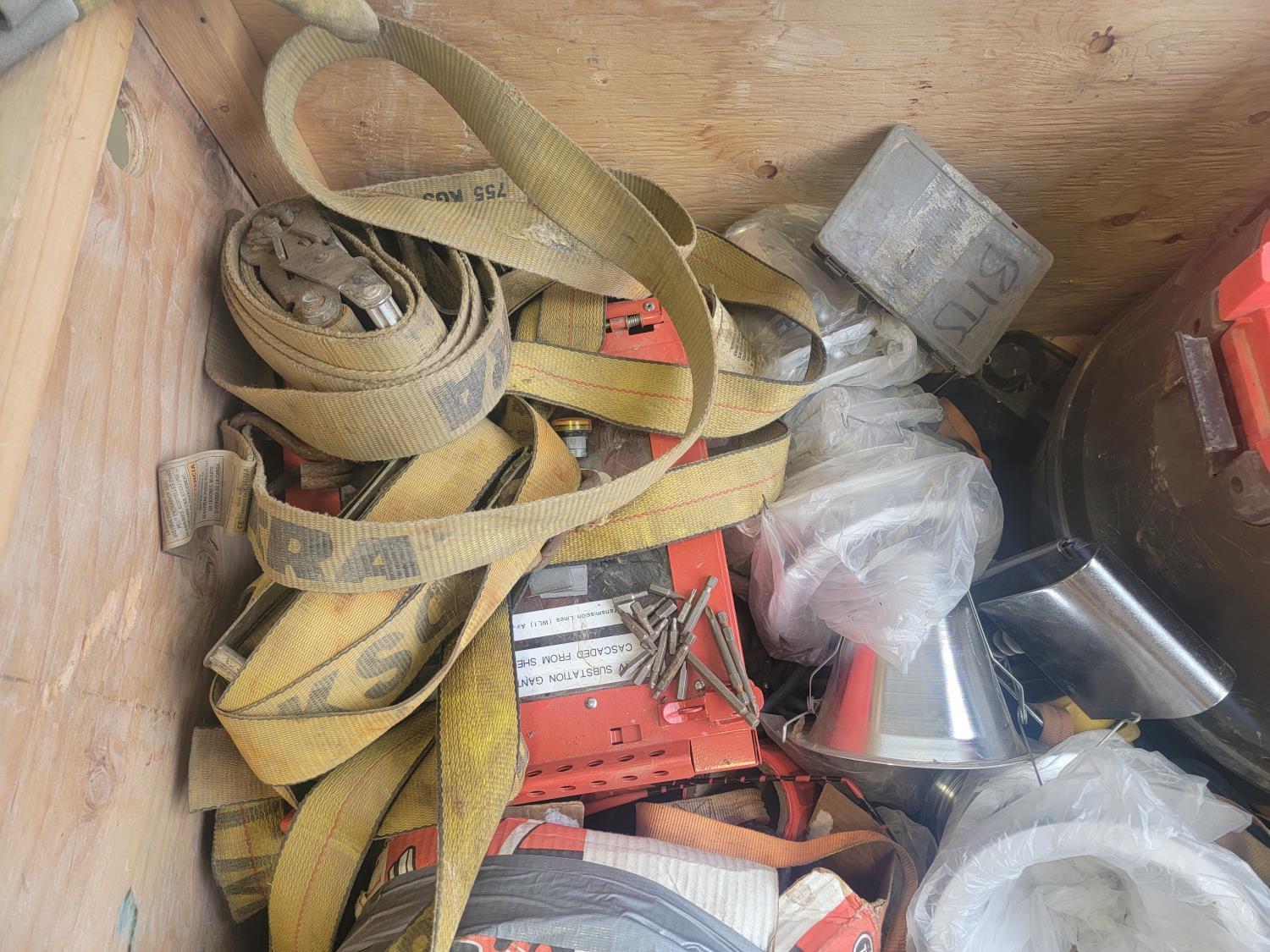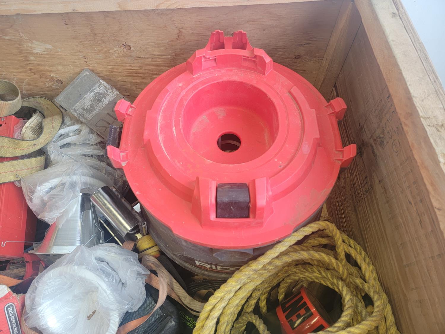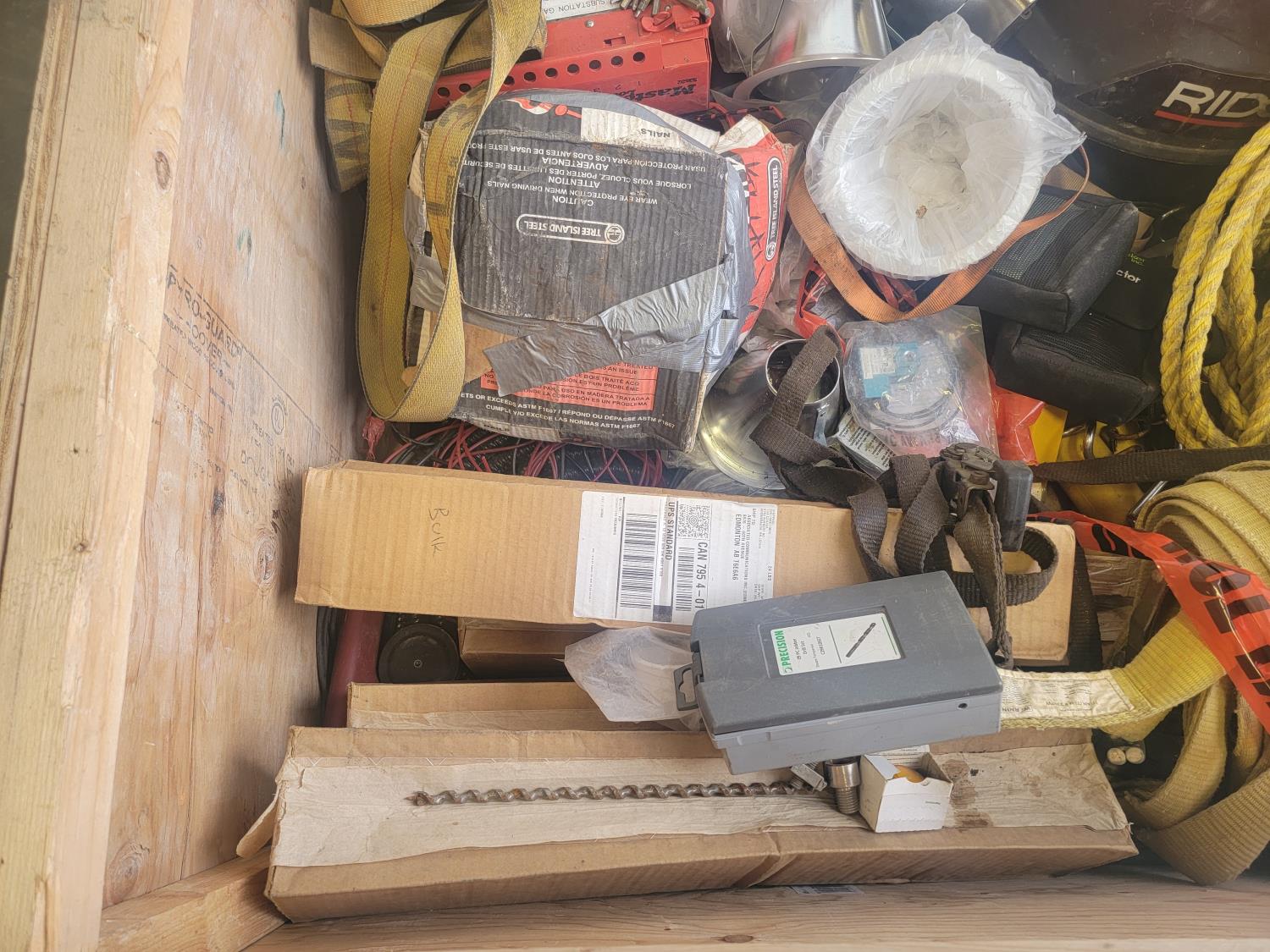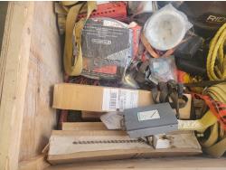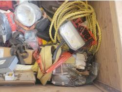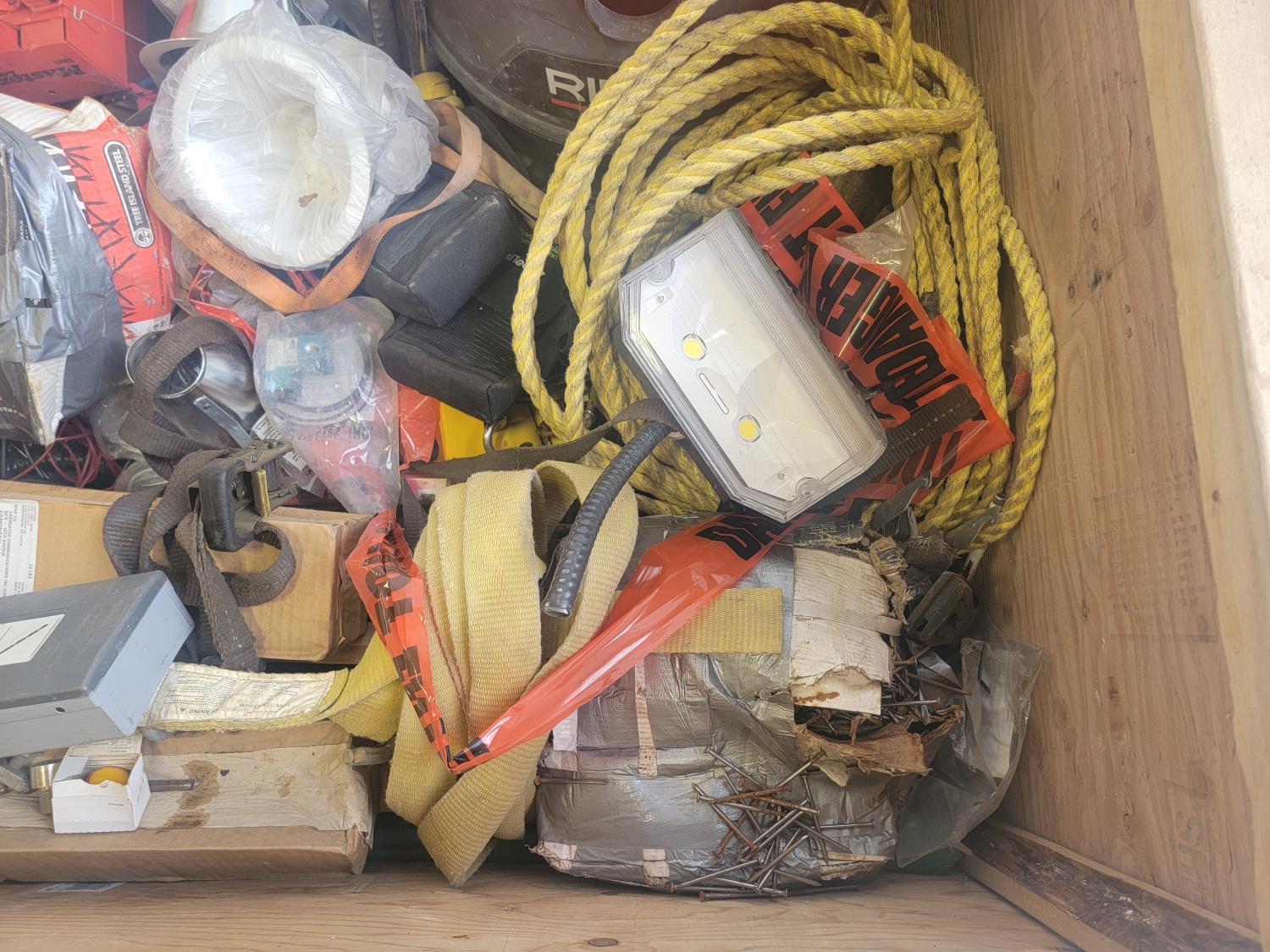 Rolls of rope, cordless impact driver, hole saw kit, propane heater, tap and die set, steel braided hose, belts, strapping seals, assorted shop supplies