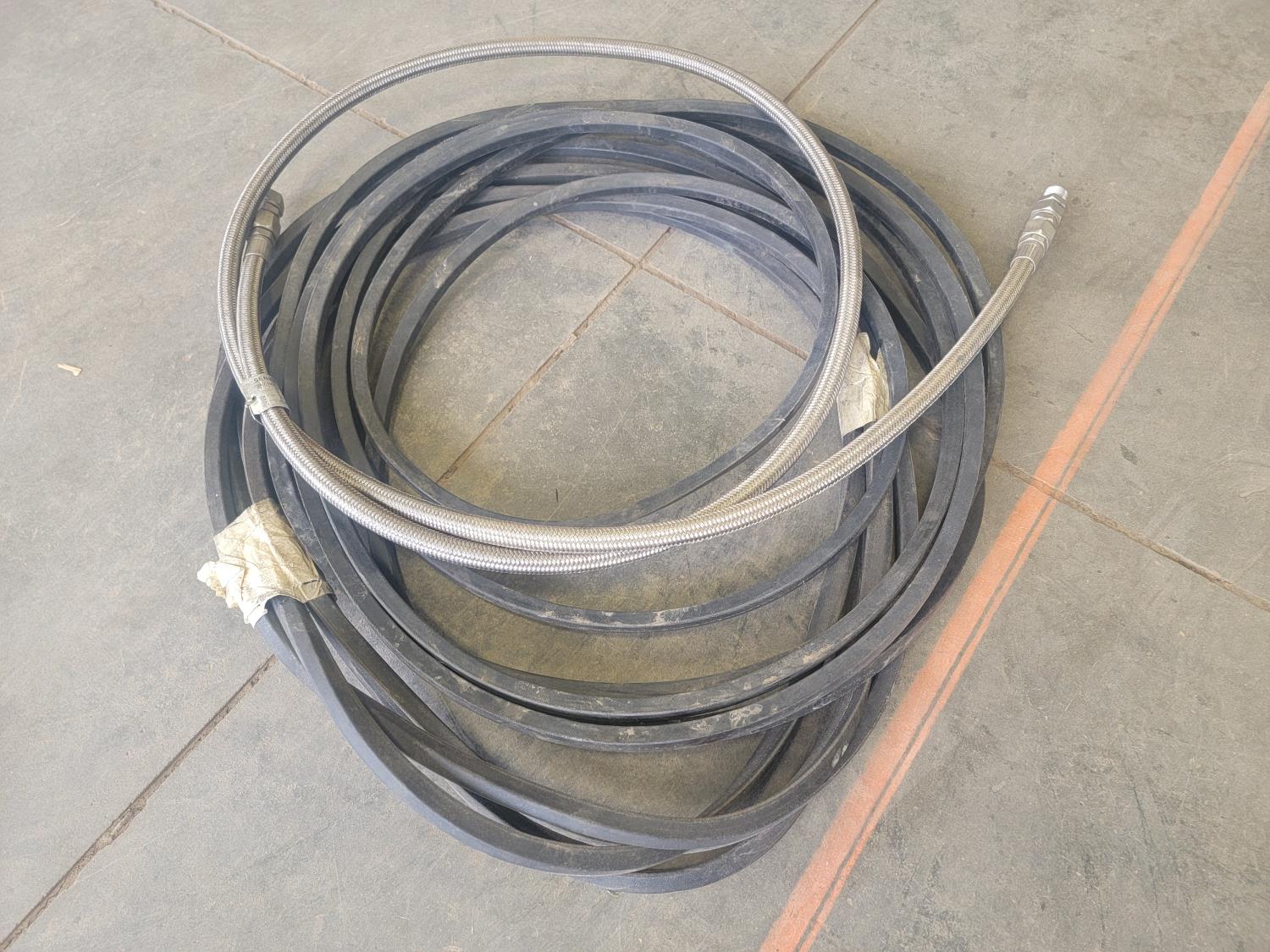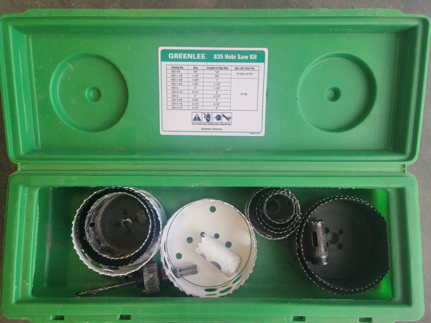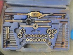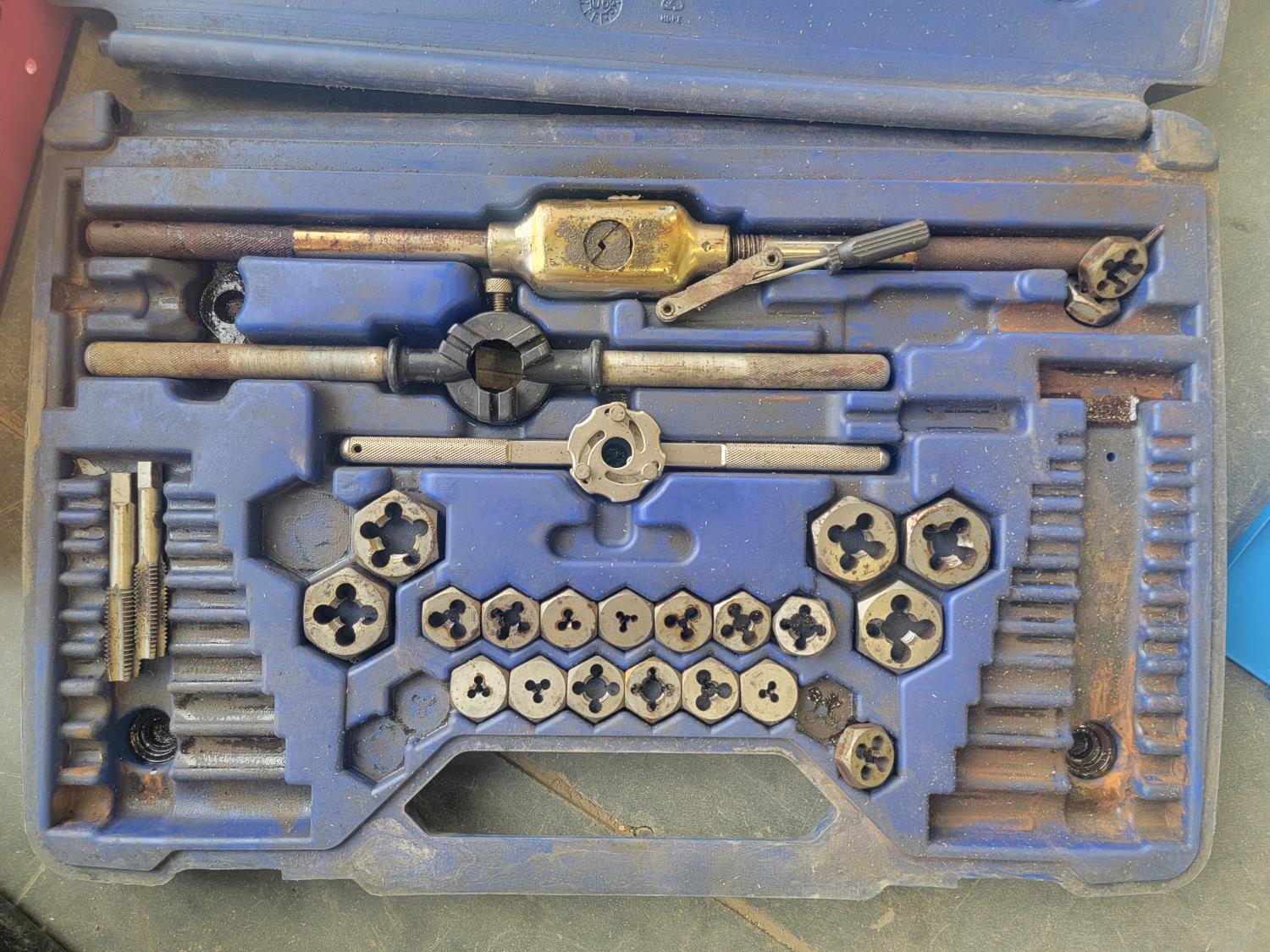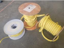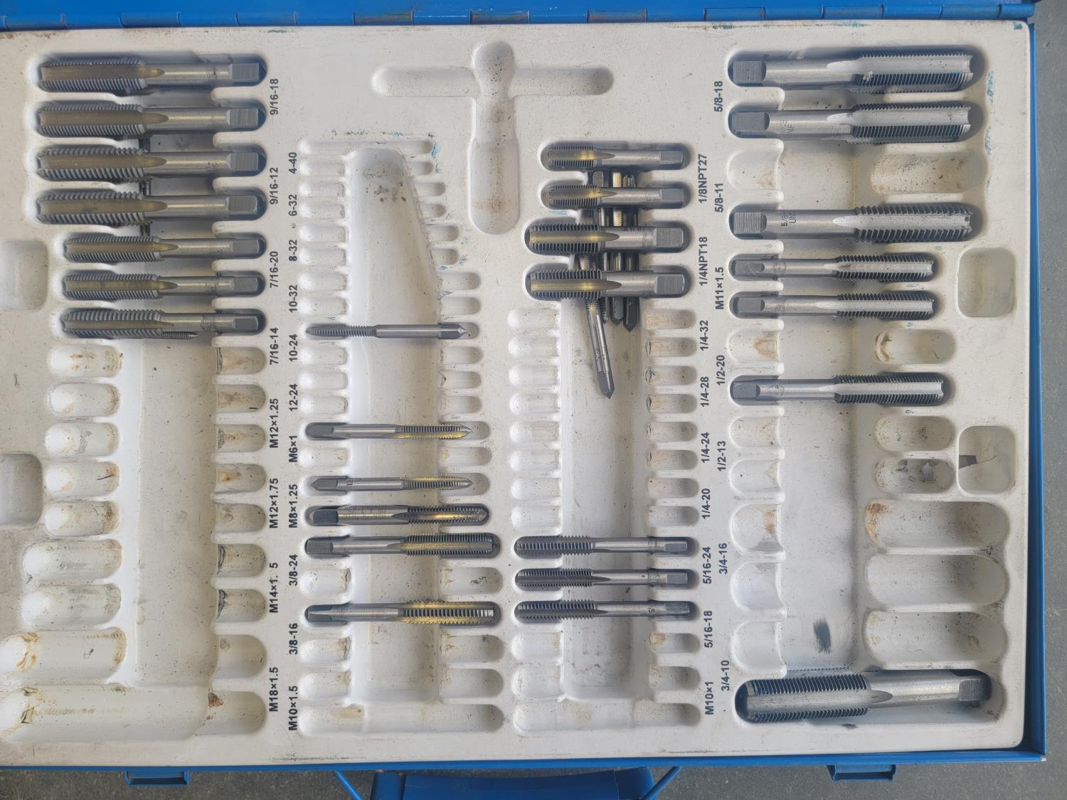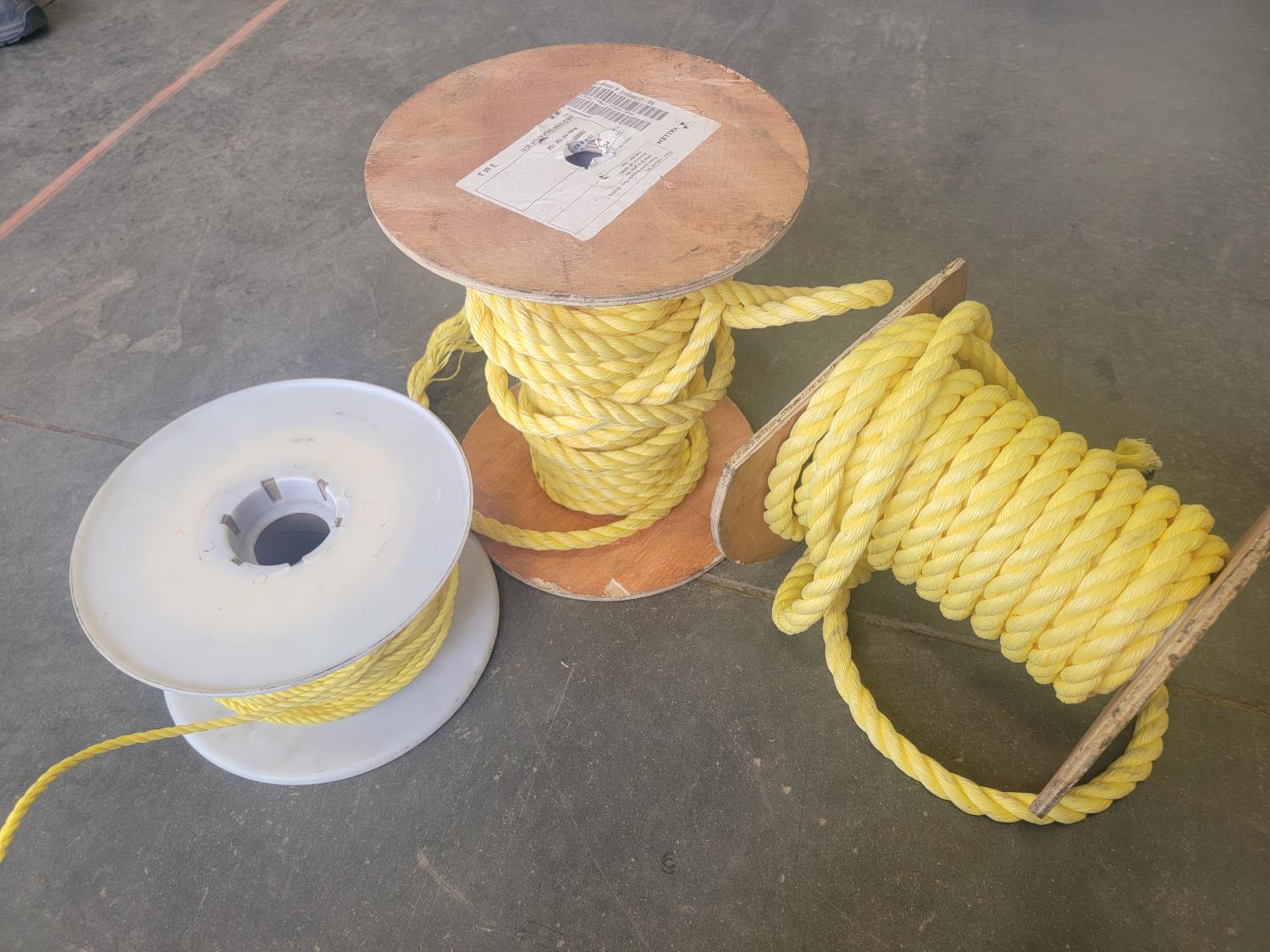 Rolls of rope, cordless impact driver, hole saw kit, propane heater, tap and die set, steel braided hose, belts, strapping seals, assorted shop supplies