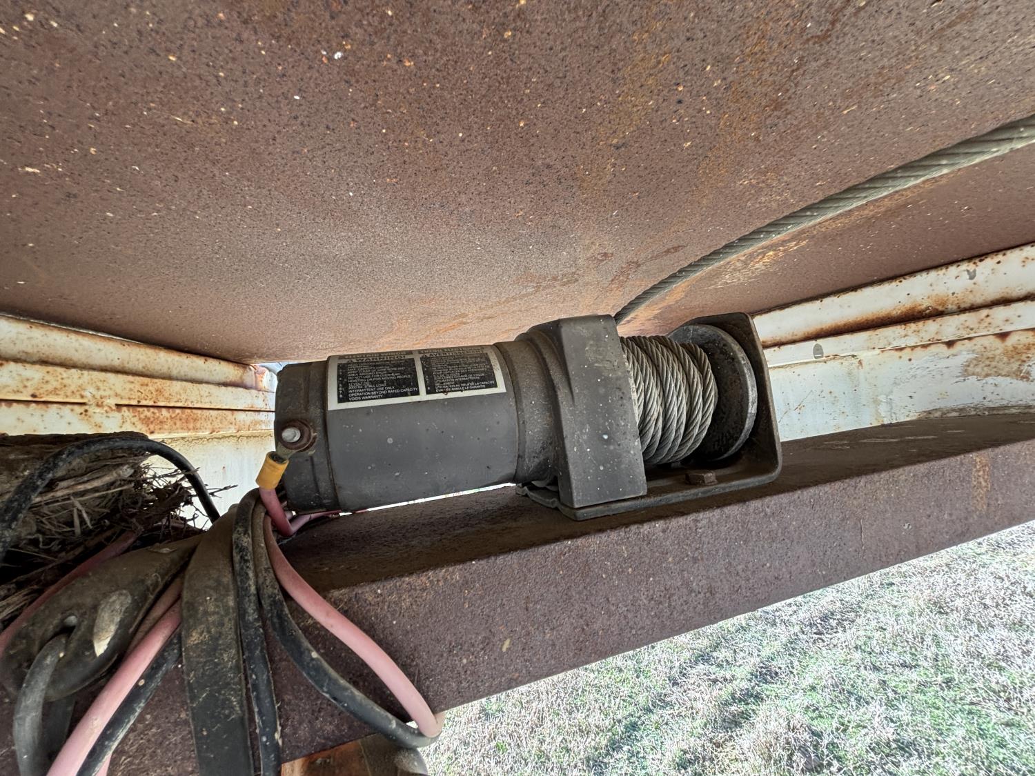 92 inch wide deck, 60 inch beaver tails, wood deck, flip over ramps, electric brakes, spring suspension, tool / storage box, rub rails, stake pockets, 2000 lb 12 volt winch, 7000 lb axles, 235/85R16 tires