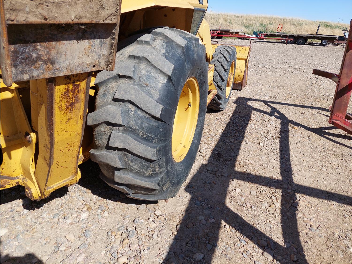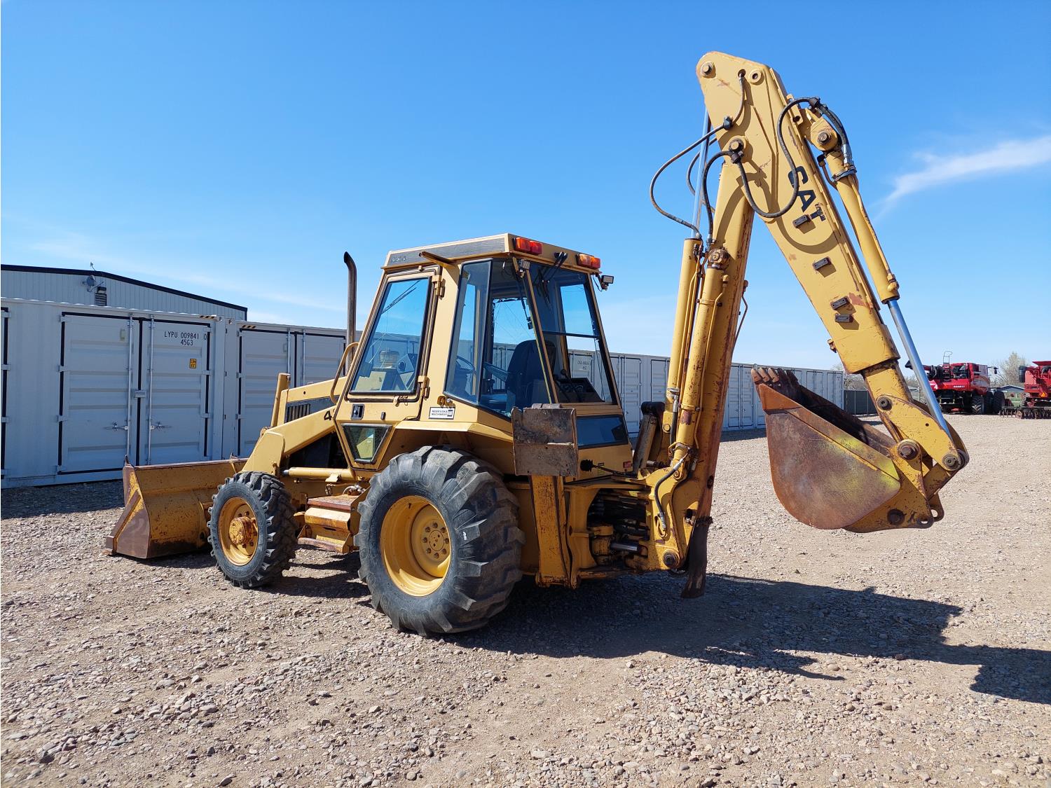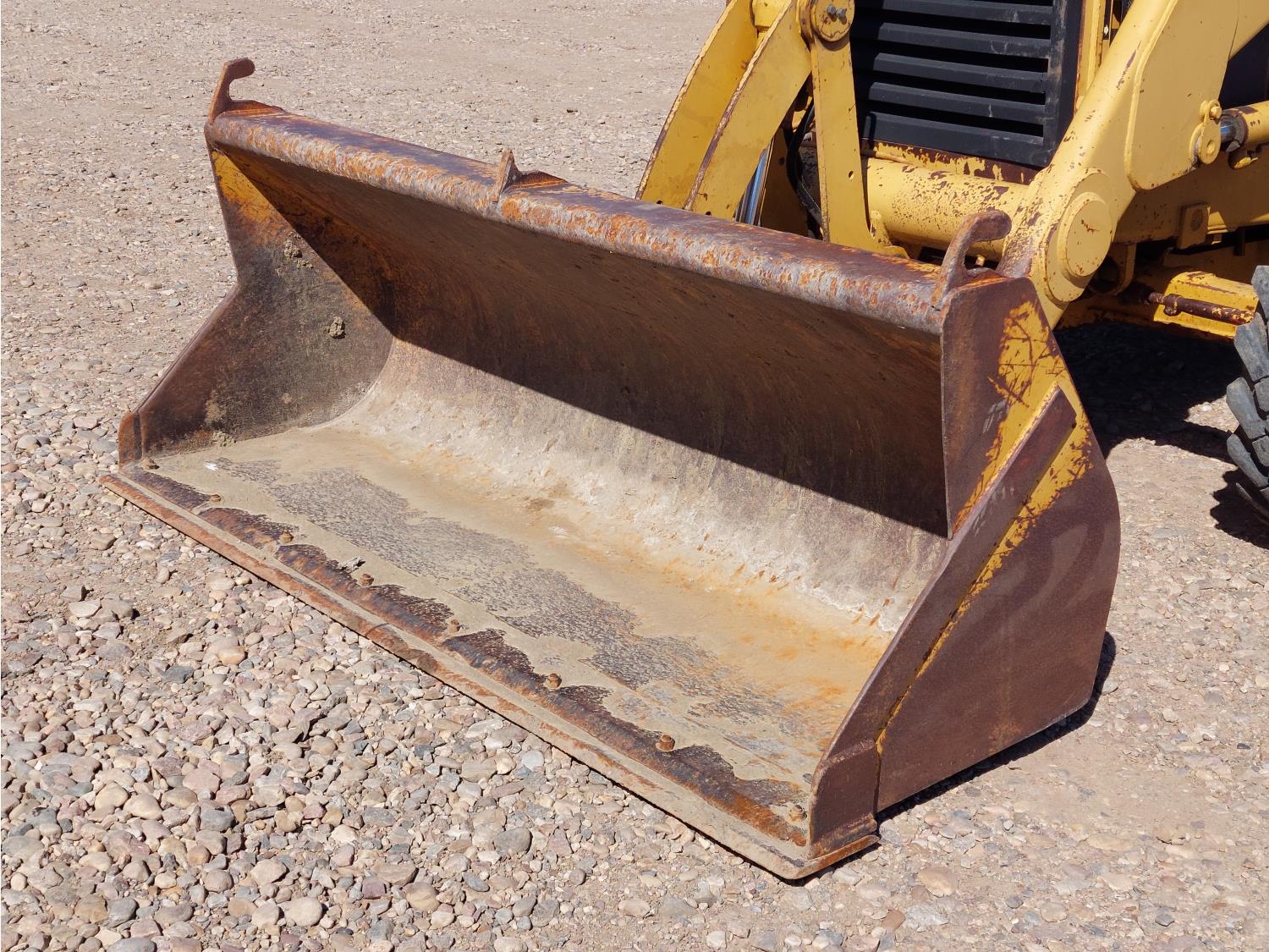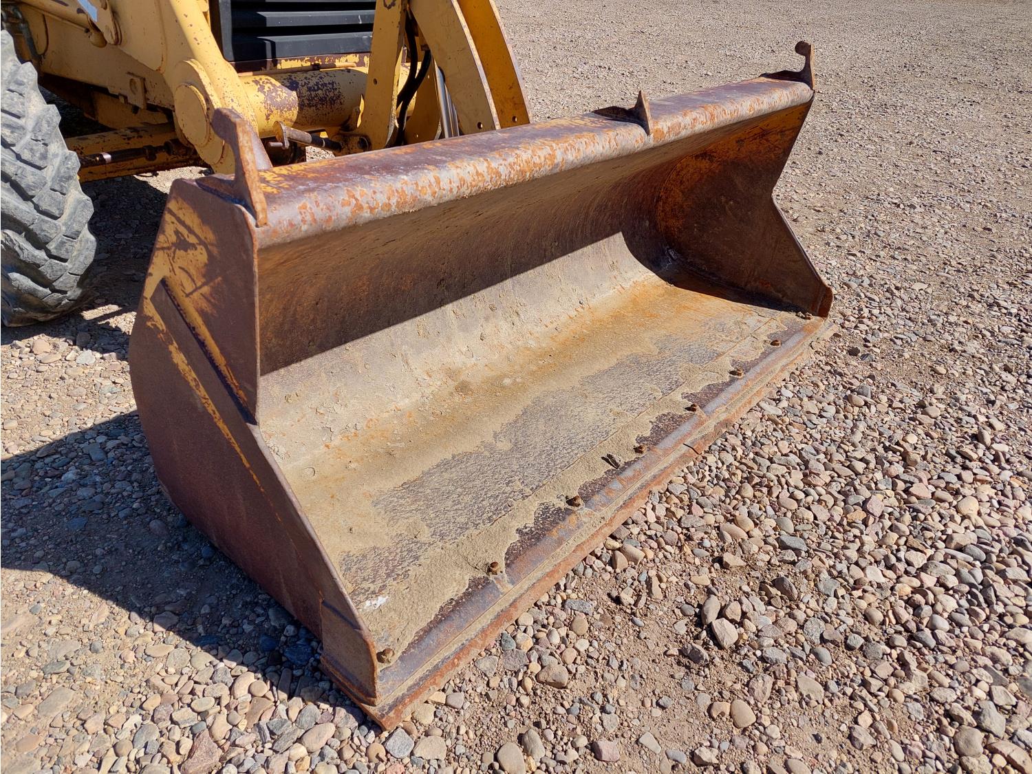 Enclosed cab, air ride seat, 87 inch smooth loader bucket, 23 inch dig backhoe bucket, outriggers, extendable stick, 10.5-20 front tires, 19.5L-24 rear tires
