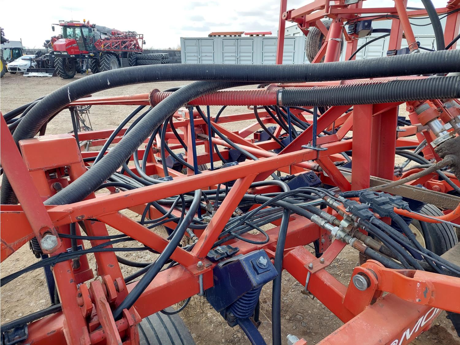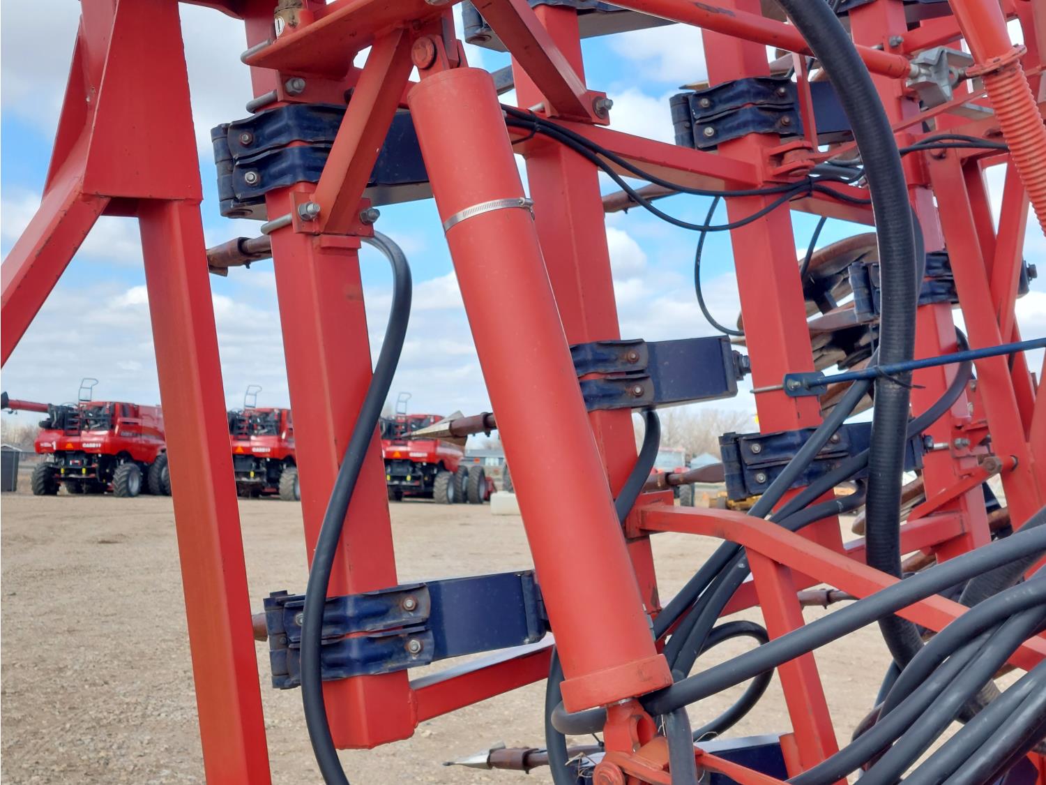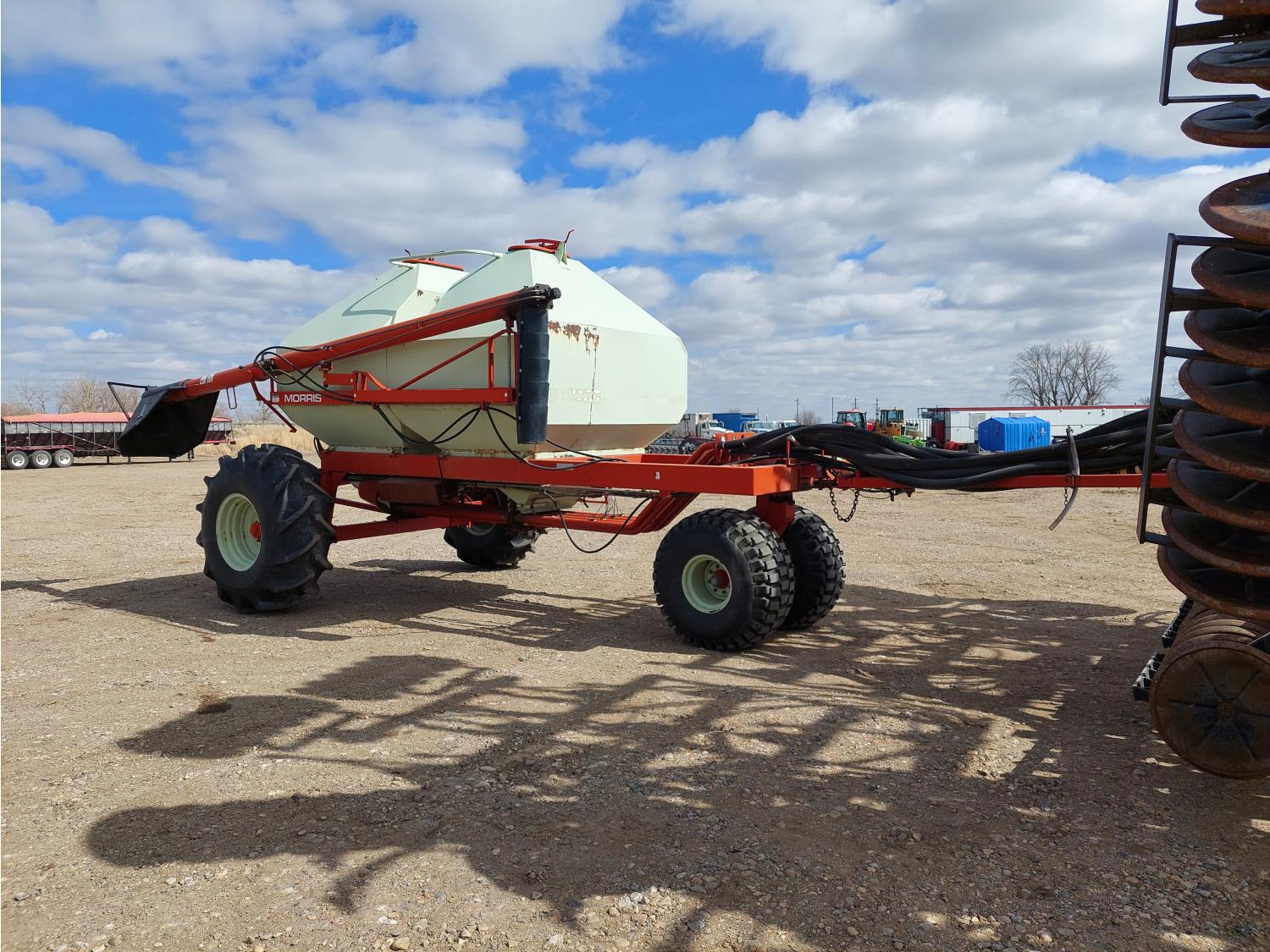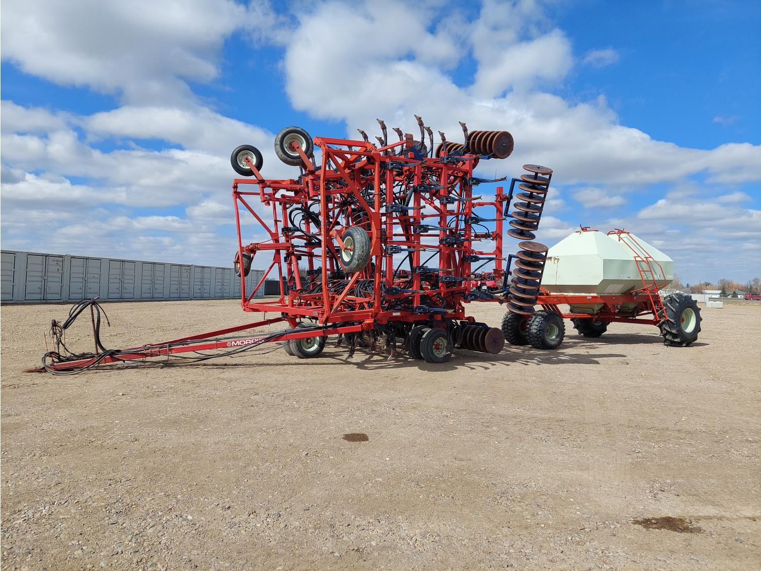 7 inch spacing, single shoot openers, 2 inch steel packers, seed monitor, Morris M21082 RO monitors, Air Cart: 2 compartments, 6 inch loading auger, single fan, 11L-15FI drill tires, 21.5L-16.1SL front tires, 21.5L-16.1SL rear tires