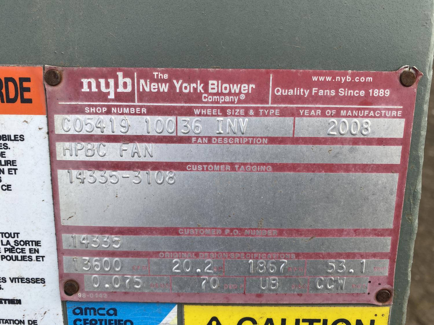 47 2008 New York Blower Company 13600 CFM HPBC Fan