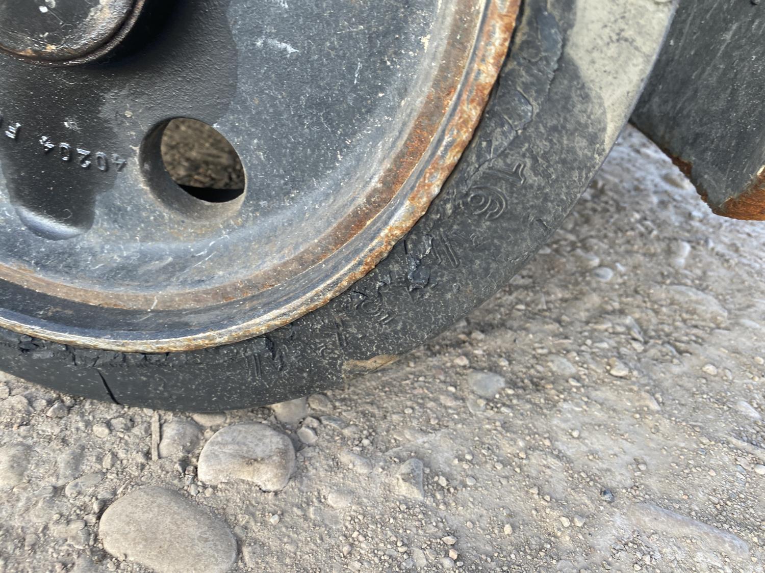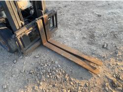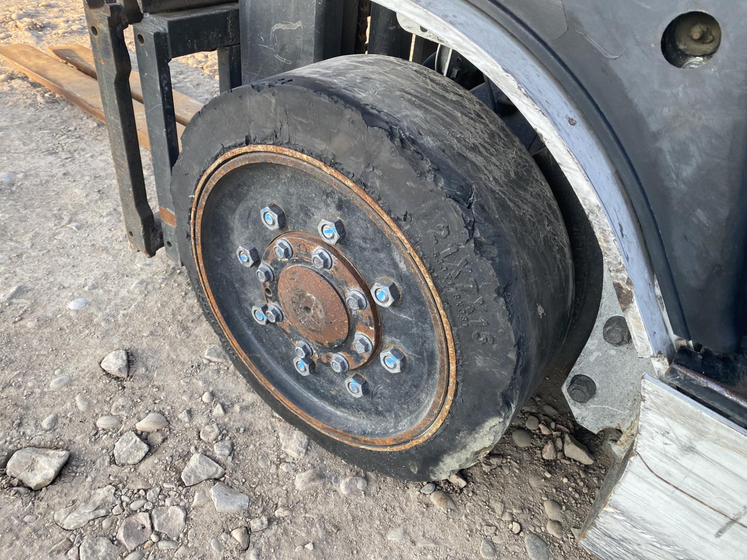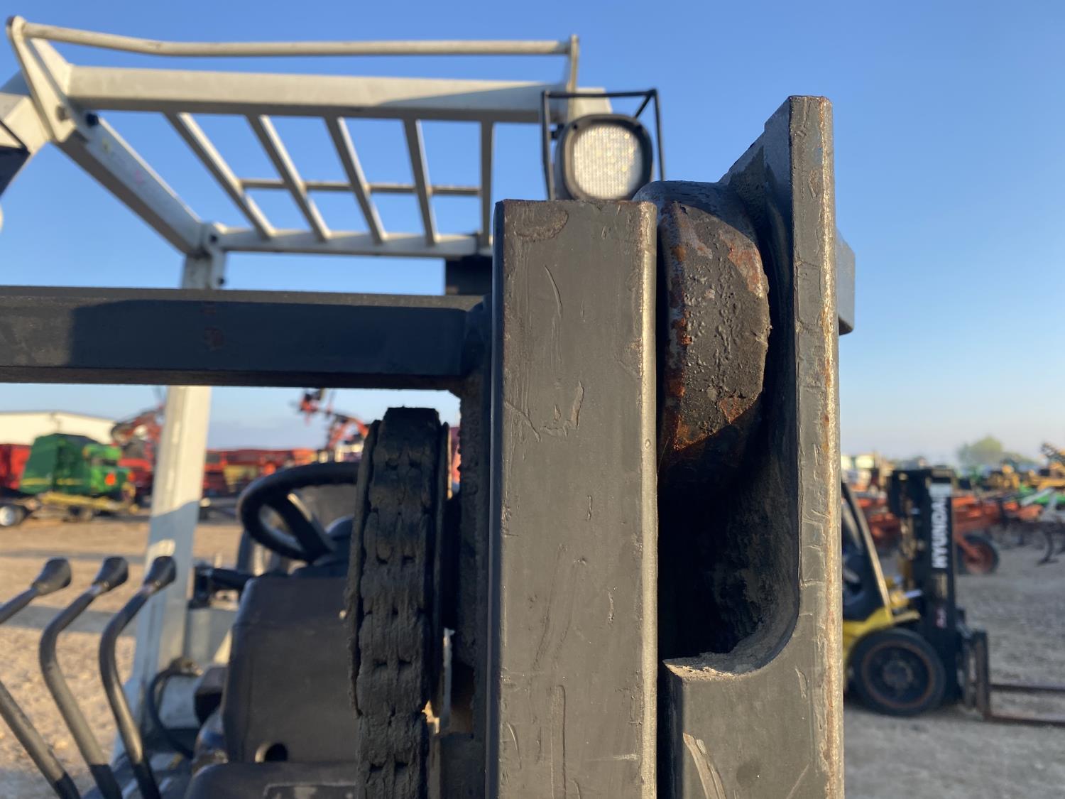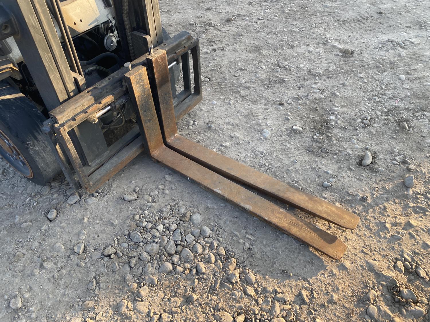 Open station with ROPS, propane, hydro transmission, left hand reverser, 5 ft 2 inch lowered mast height, 6 ft 9 in max lift height, 2 mast stages, 42 inch pallet forks, side shift, solid rubber 21X7X15 front tires