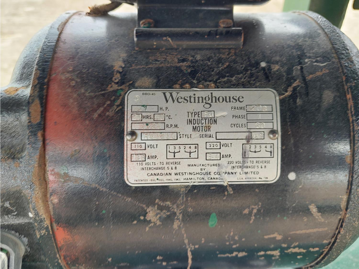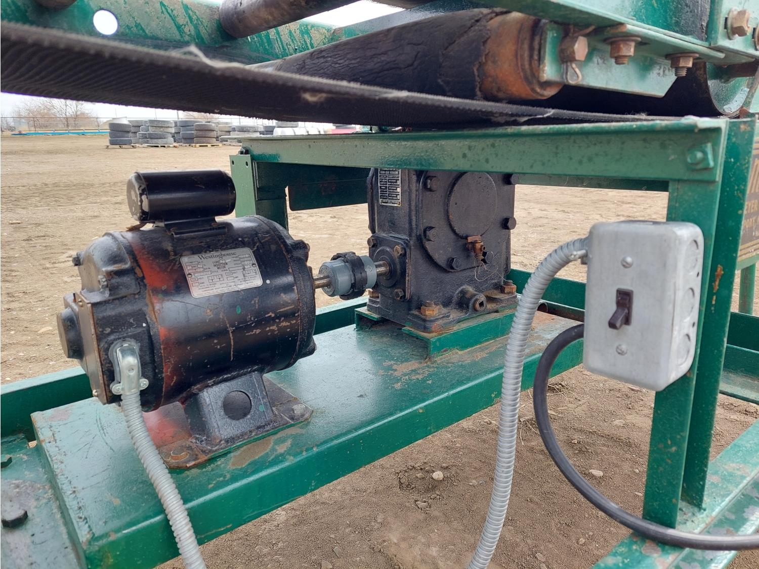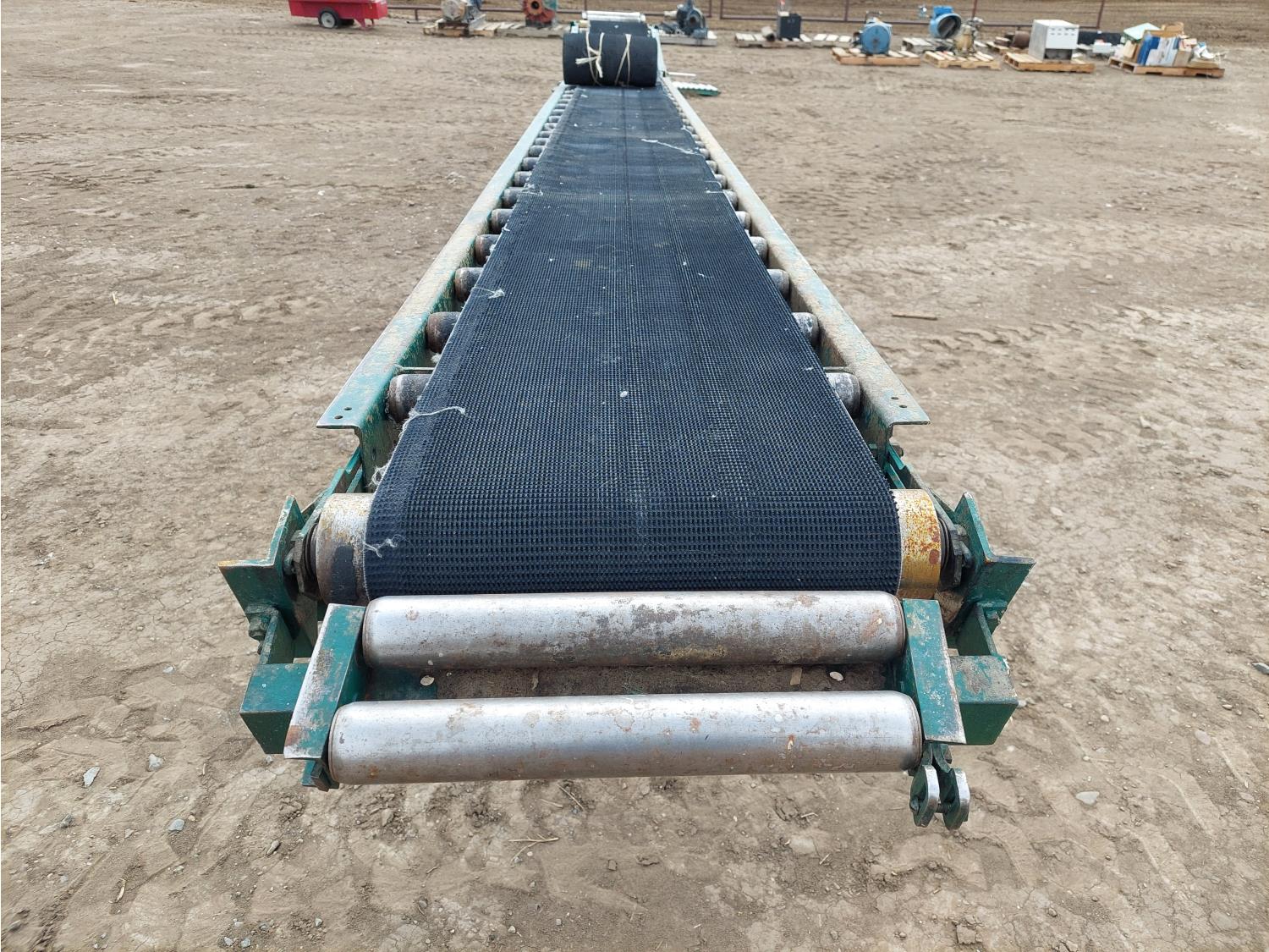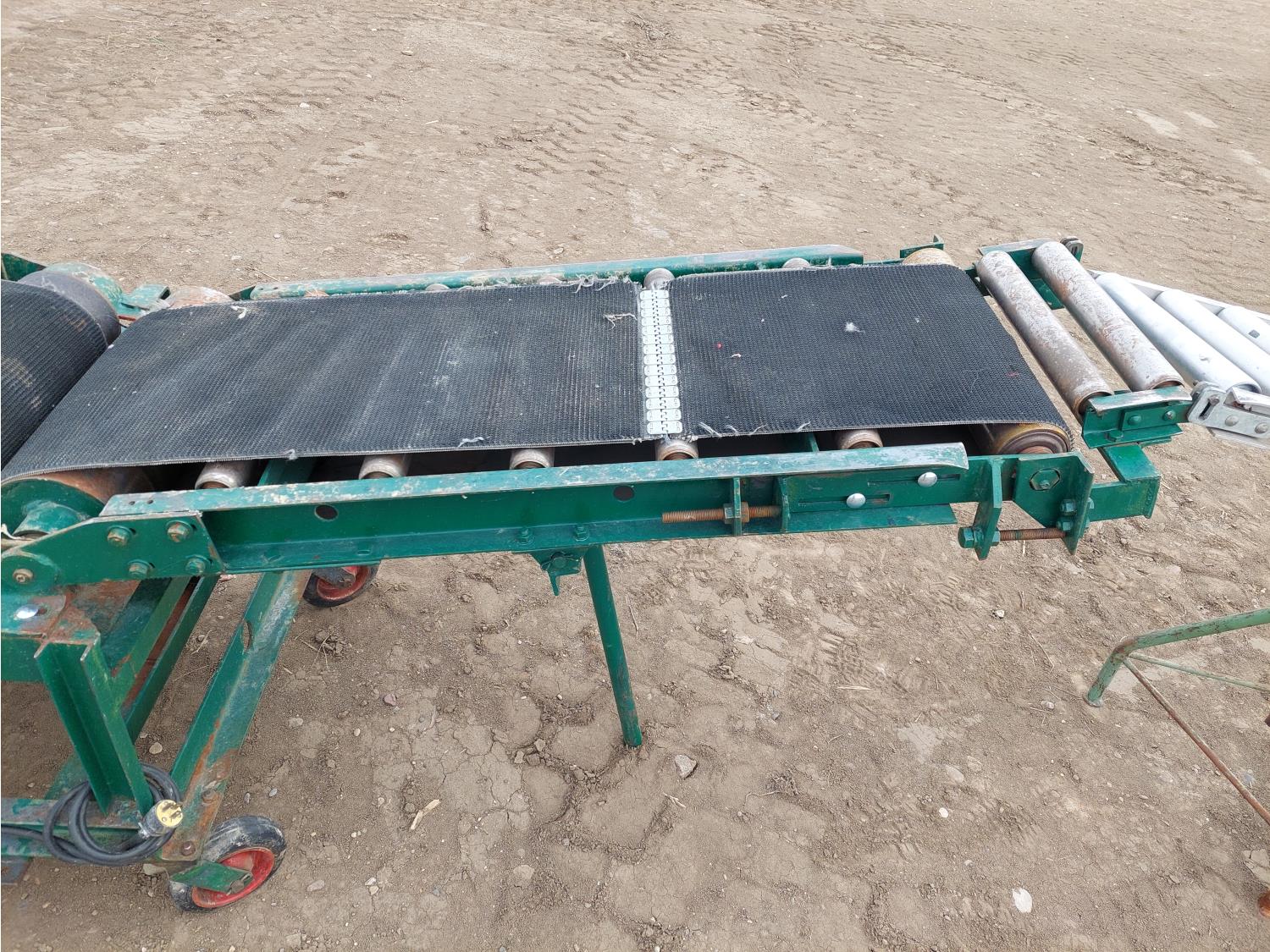 adjustable height, reversible 110V 1HP single phase Westinghouse motor, 15 inch W belt, includes (1) 10 ft extension w/ 14 inch rollers, (2) 34 inch L corner transitions w/ 14 inch rollers, and (2) tripods