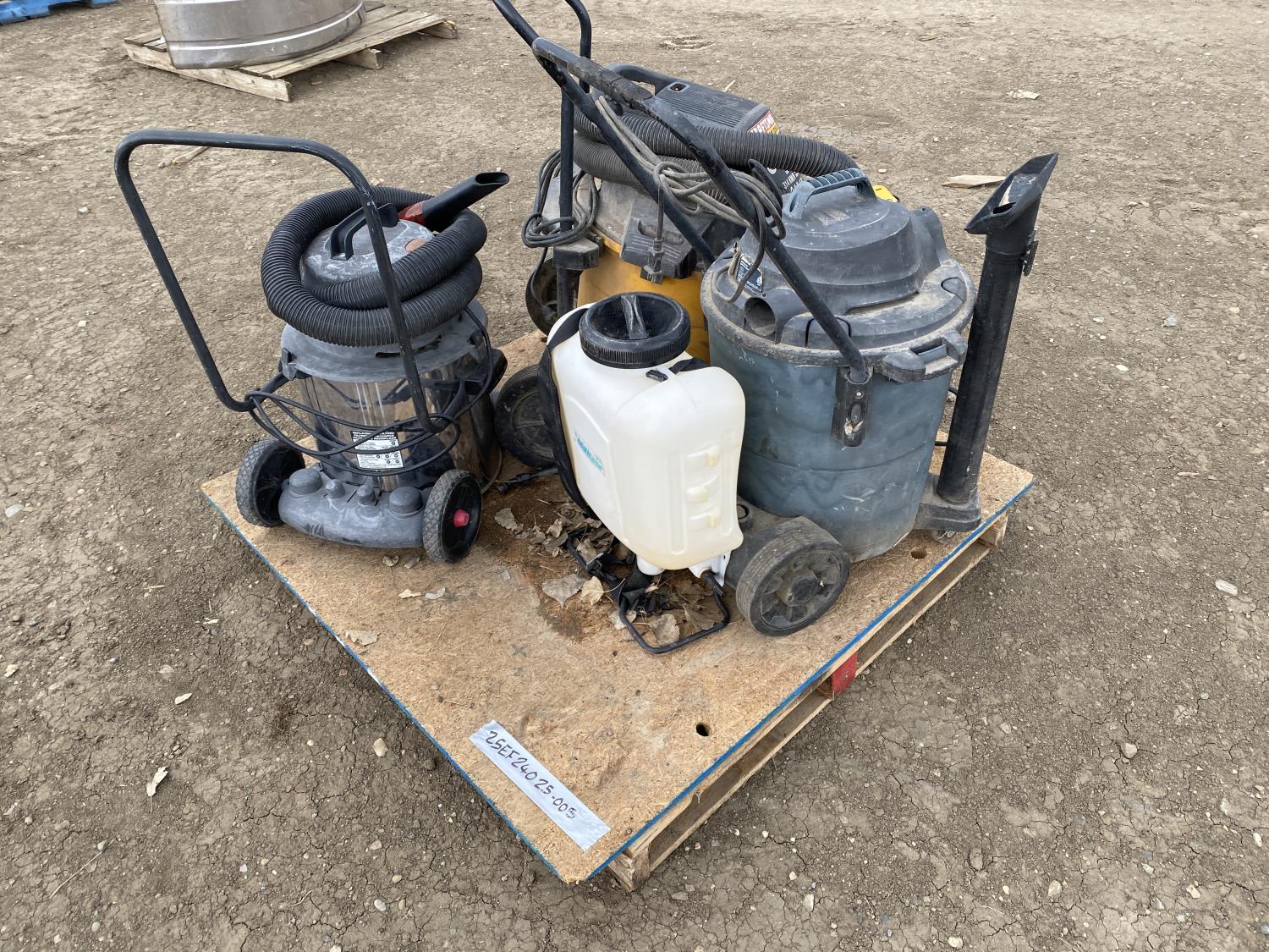 (1) 5.5 HP 8 gallon shop vac, (1) 6.25 HP 16 gallon craftsman professional, (1) 12 gallon Mastervac, (1) Agriease backpack sprayer