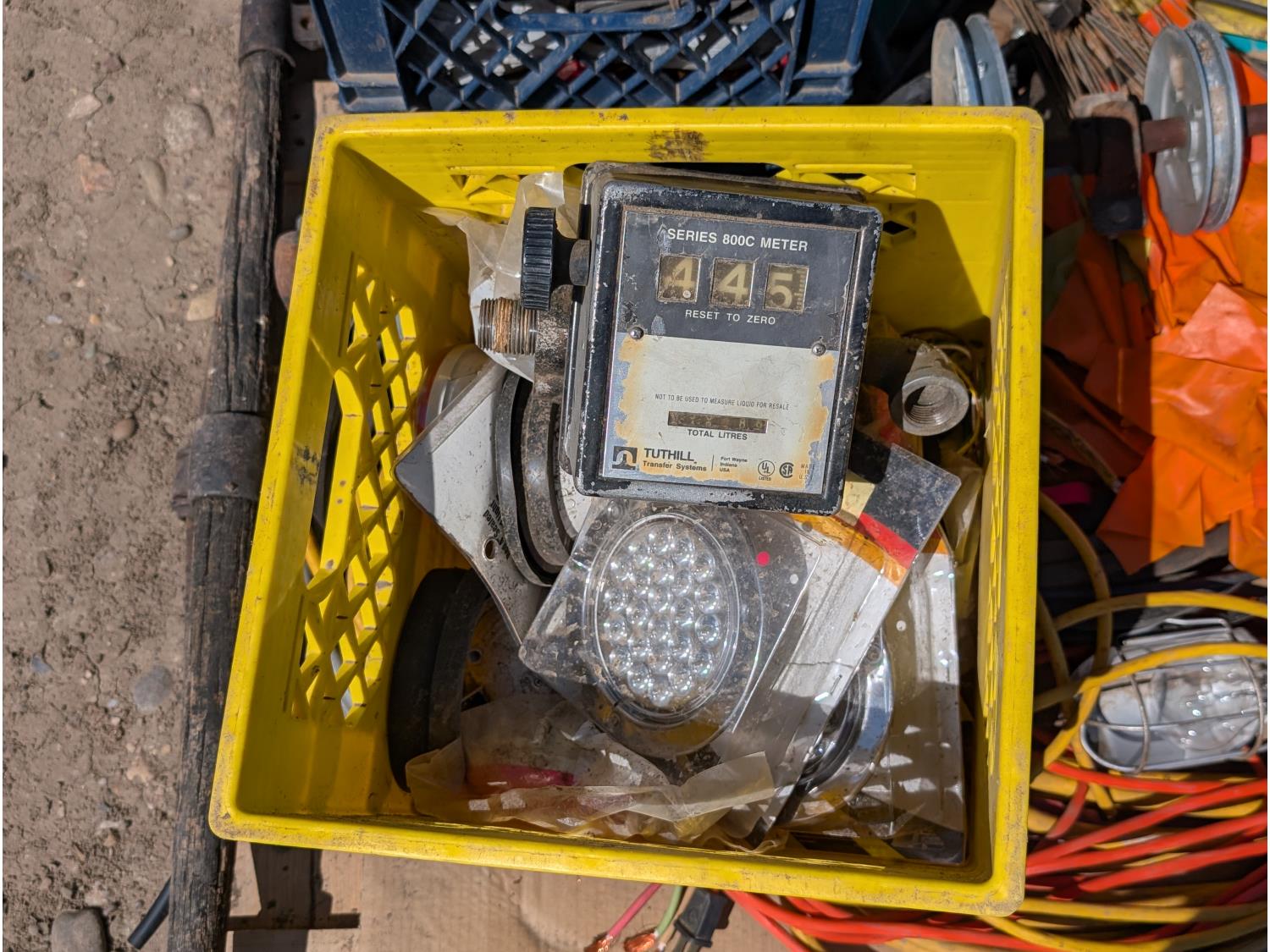 Qty of (1) Tuthill series 800c fuel transfer meter, Qty of (1) 120v work light, Qty of miscellaneous automotive lighting, Qty of (2) battery chargers, miscellaneous automotive parts