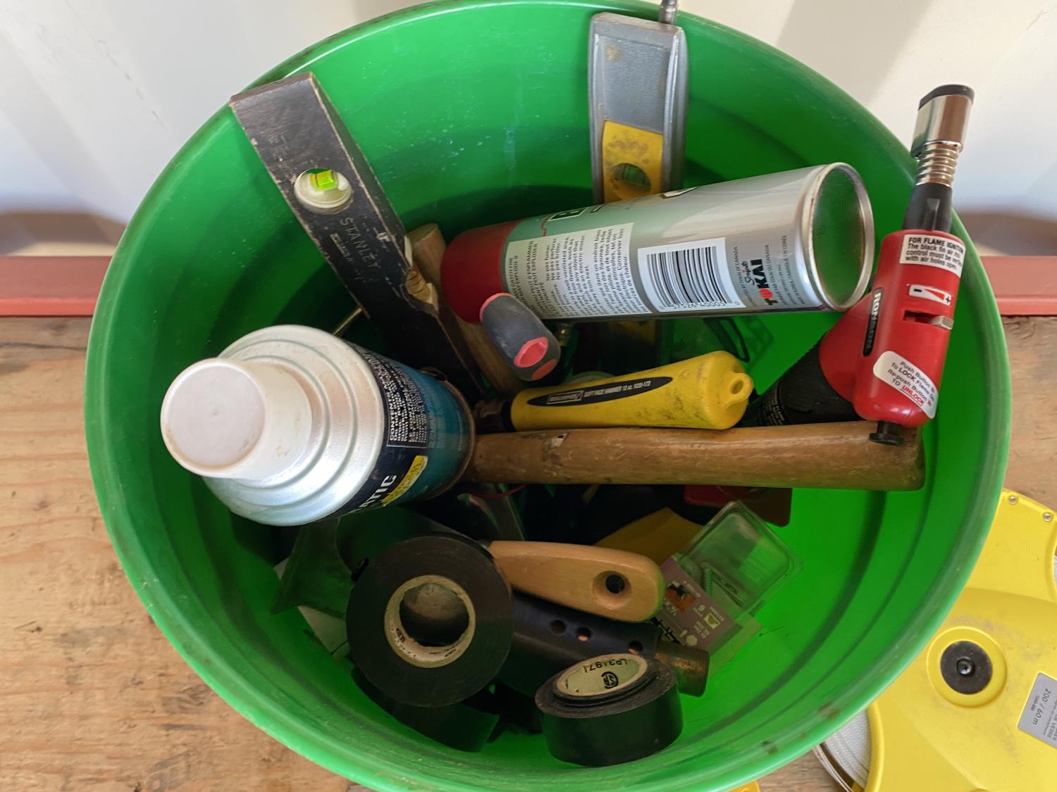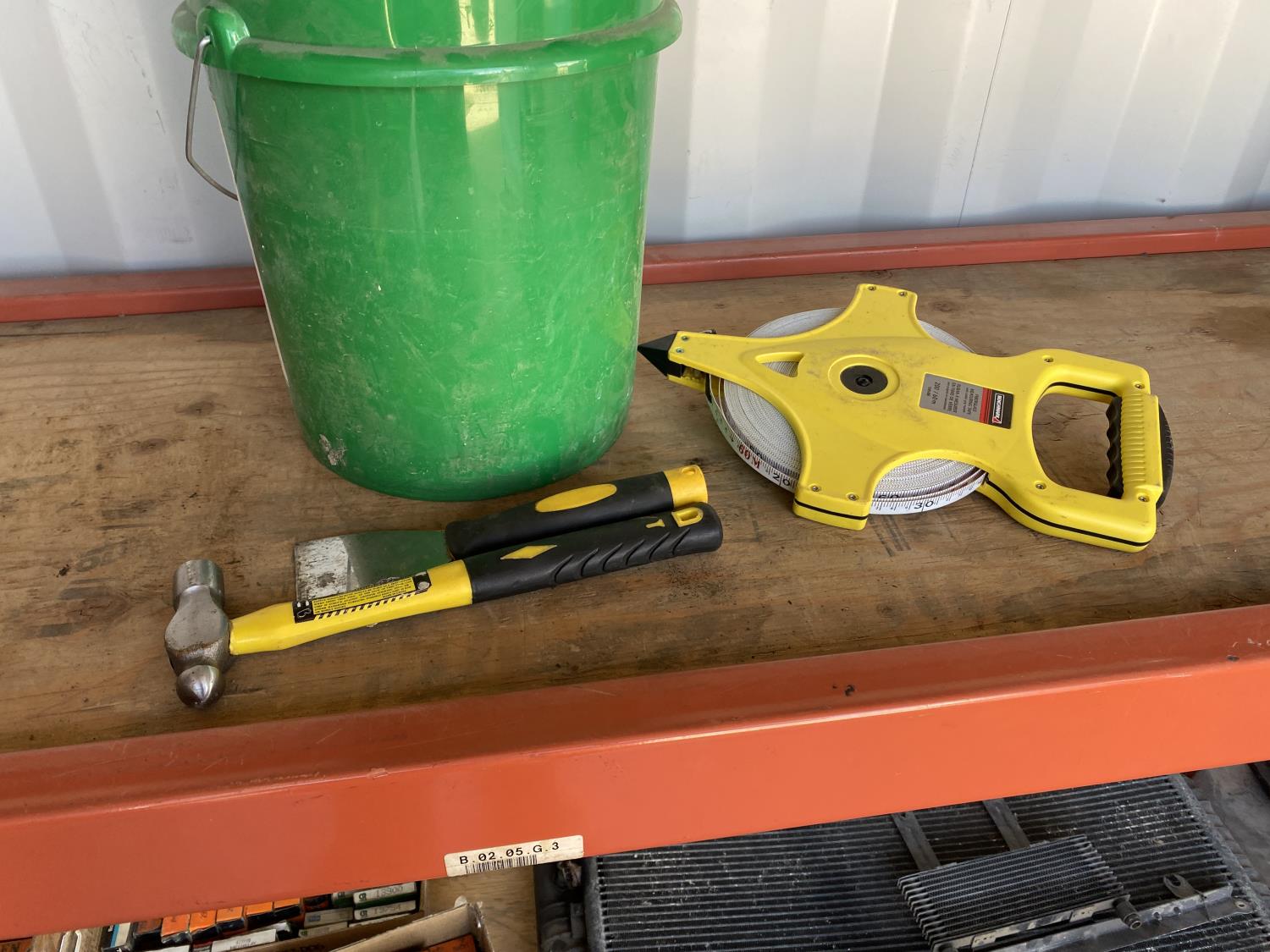 Includes hammers, levels, tape, measuring tapes