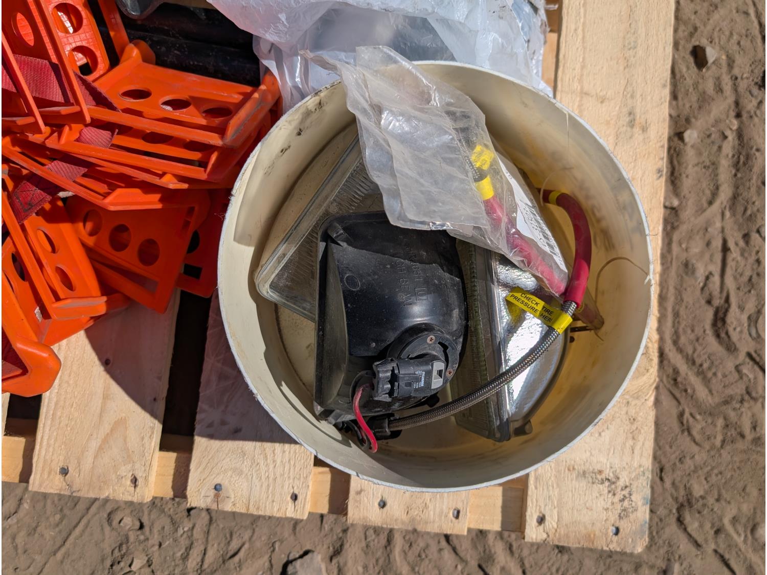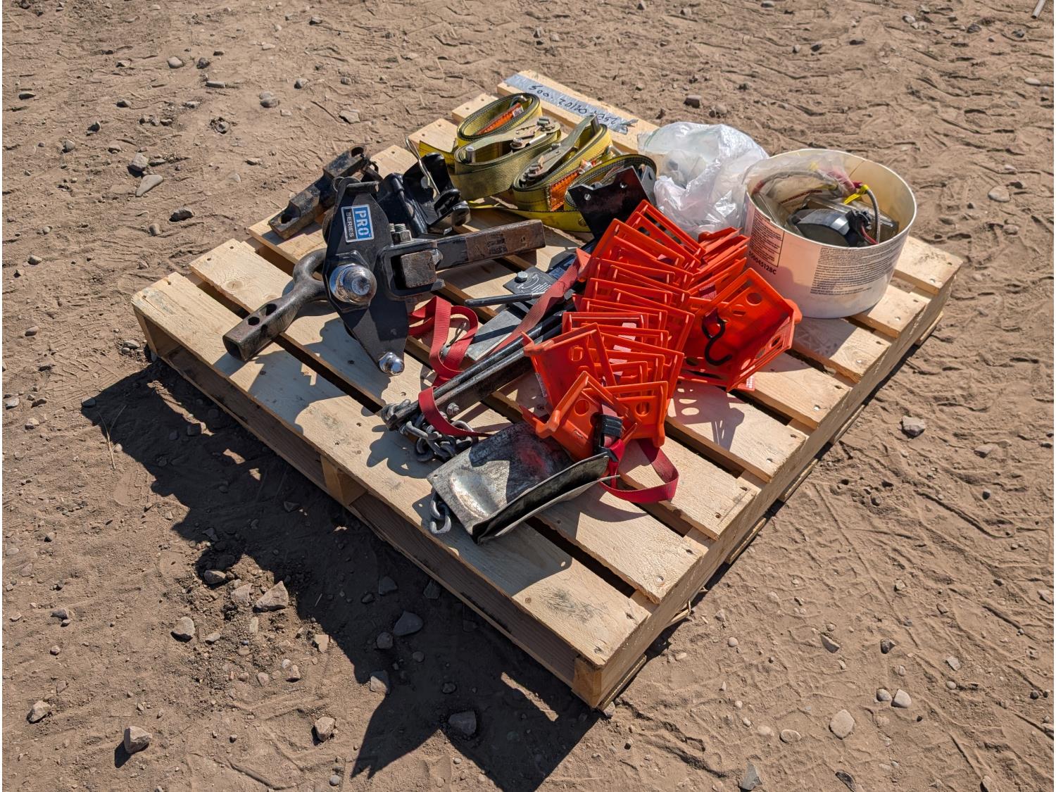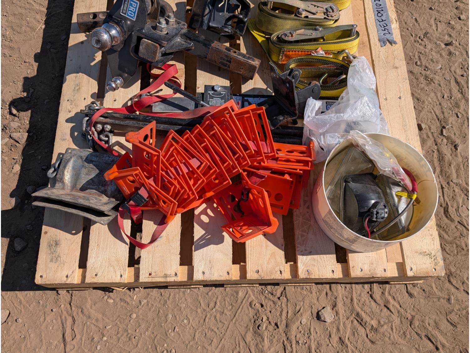 Qty of (4) rachet straps, Qty of (1) hitch assembly w/ ball, pintle, and pin attachments. Qty of edge protectors, Qty of miscellaneous headlights