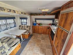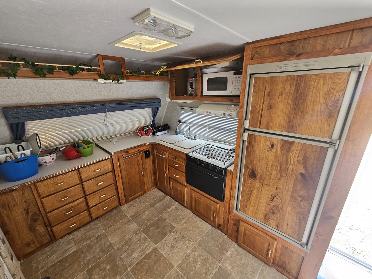 stove, fridge, microwave, full bath, A/C, outdoor shower, 1 slide, manual awning, torsion suspension, electric brakes, hitch, power front hitch jack, 205/75R14 tires