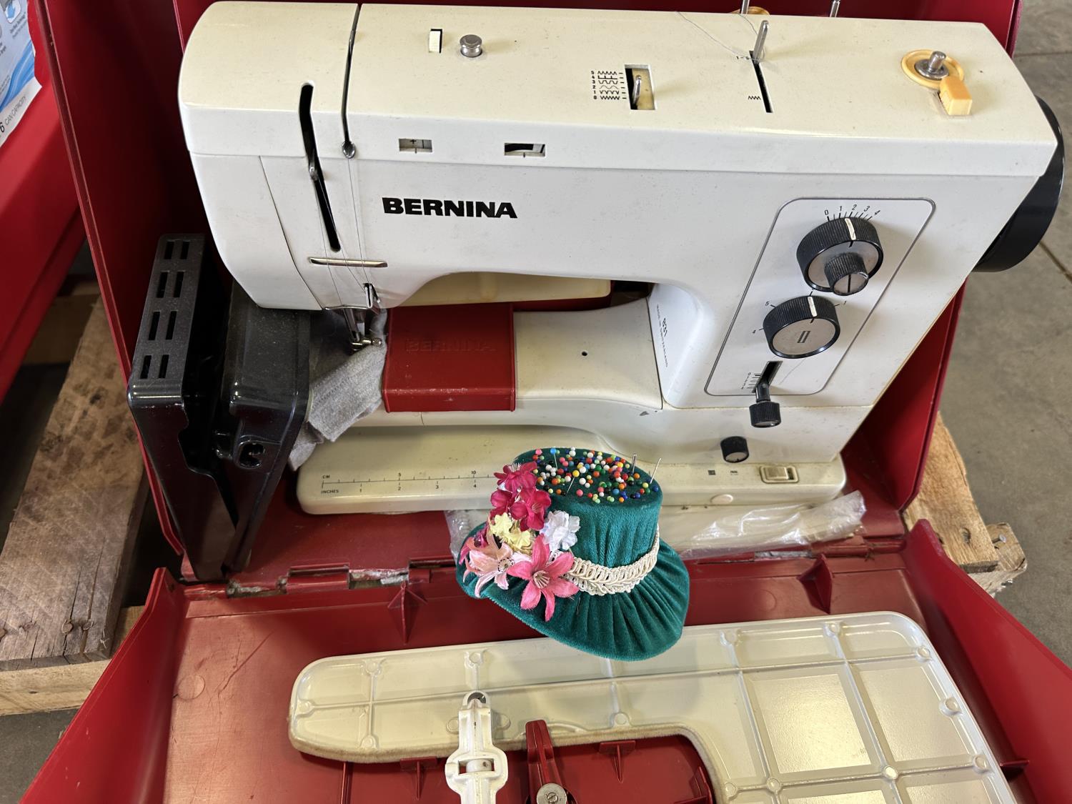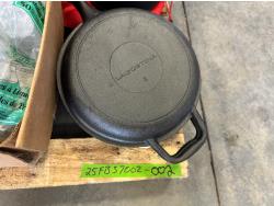 Cooler, cast iron pan, sewing machine, (2) motorcycle helmets sizes large and XL