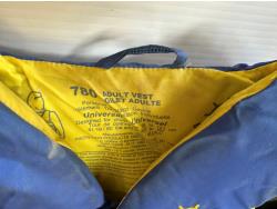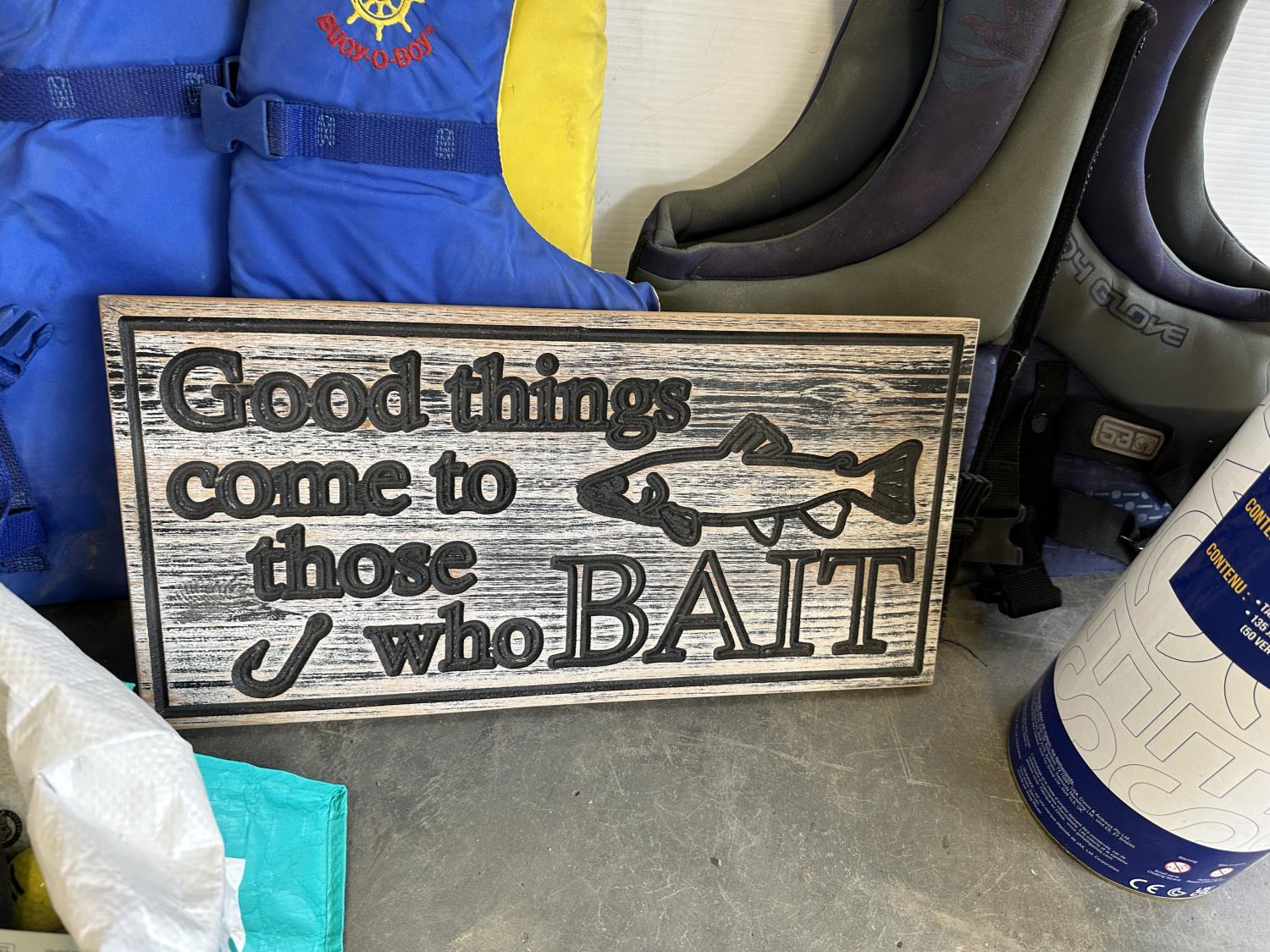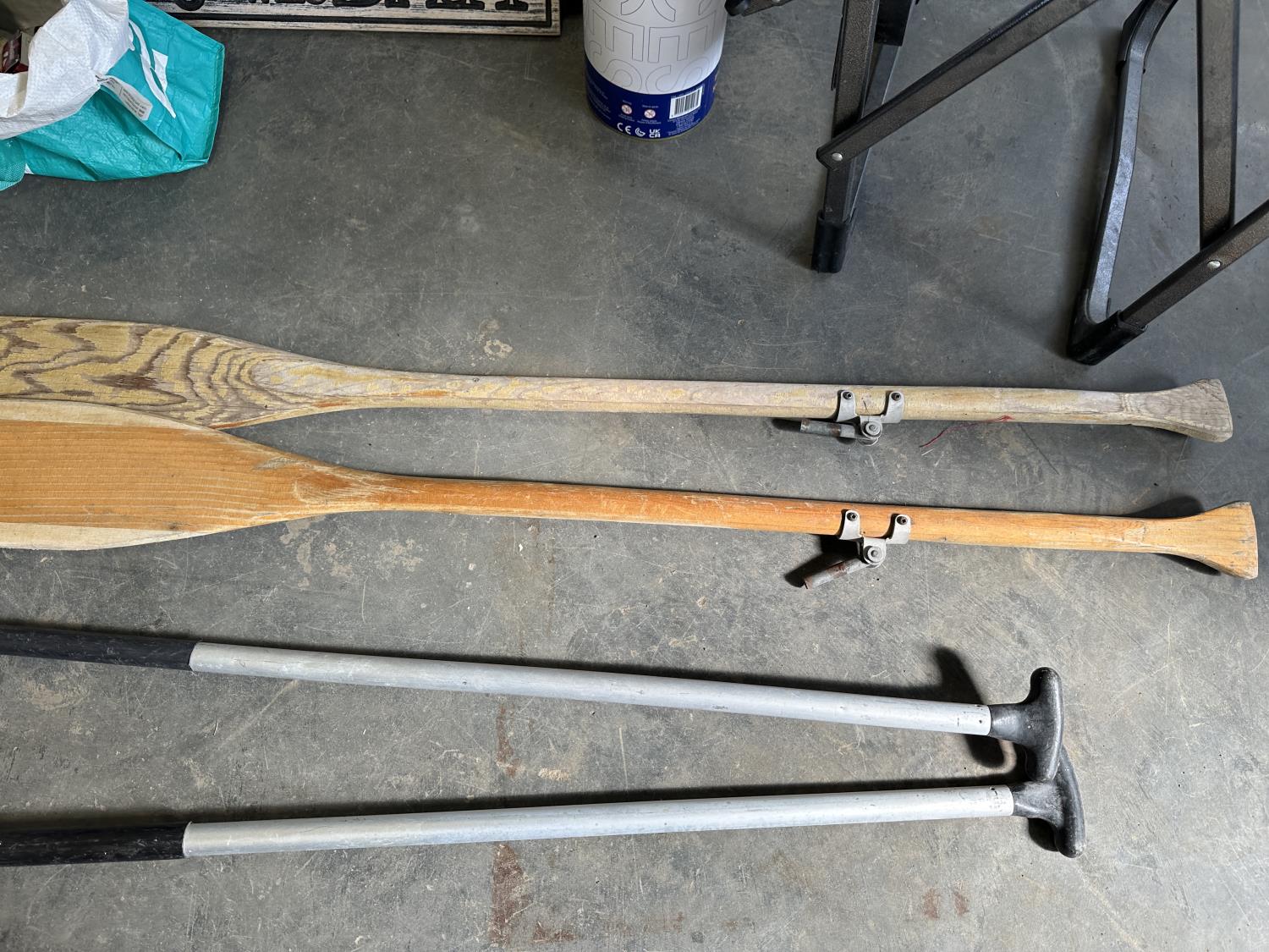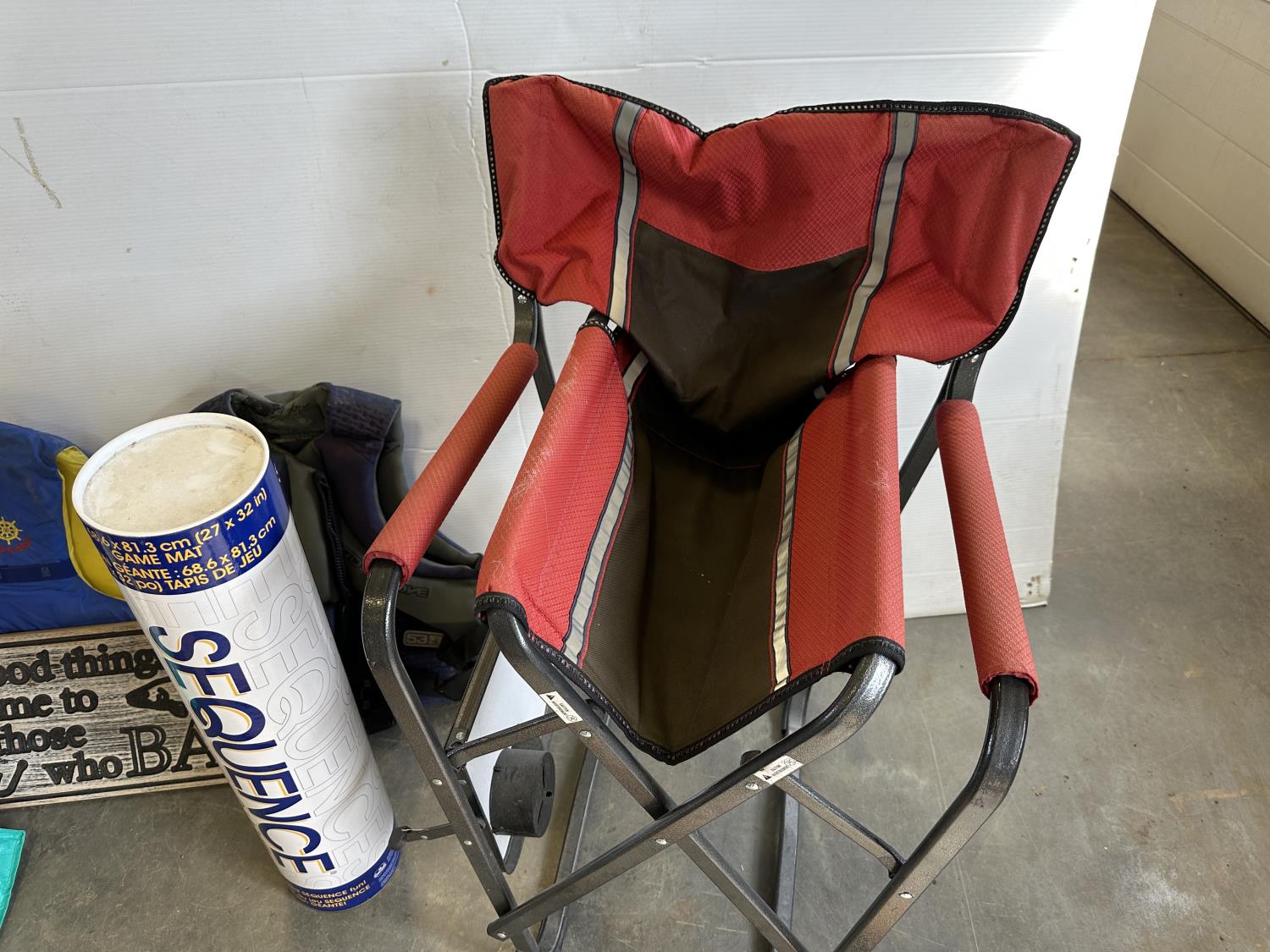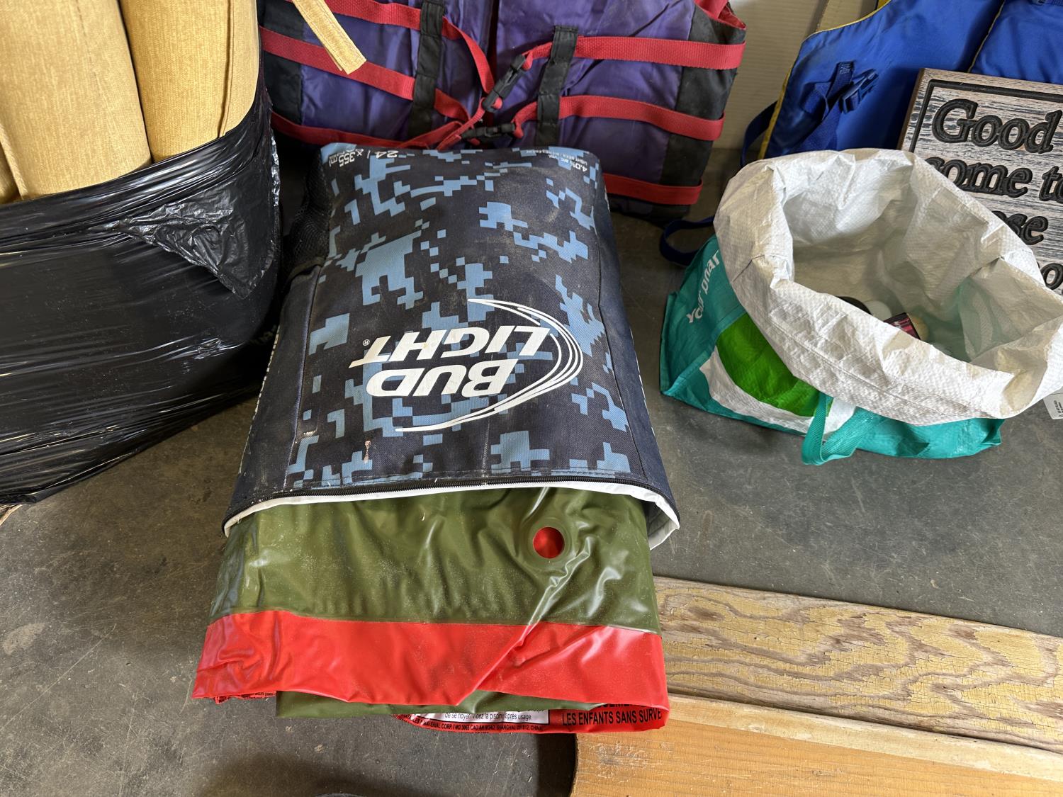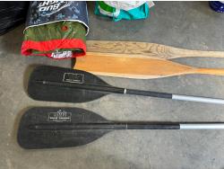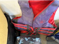 Inflatable boat, paddles, lawn chair, patio cushions, life jackets