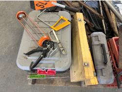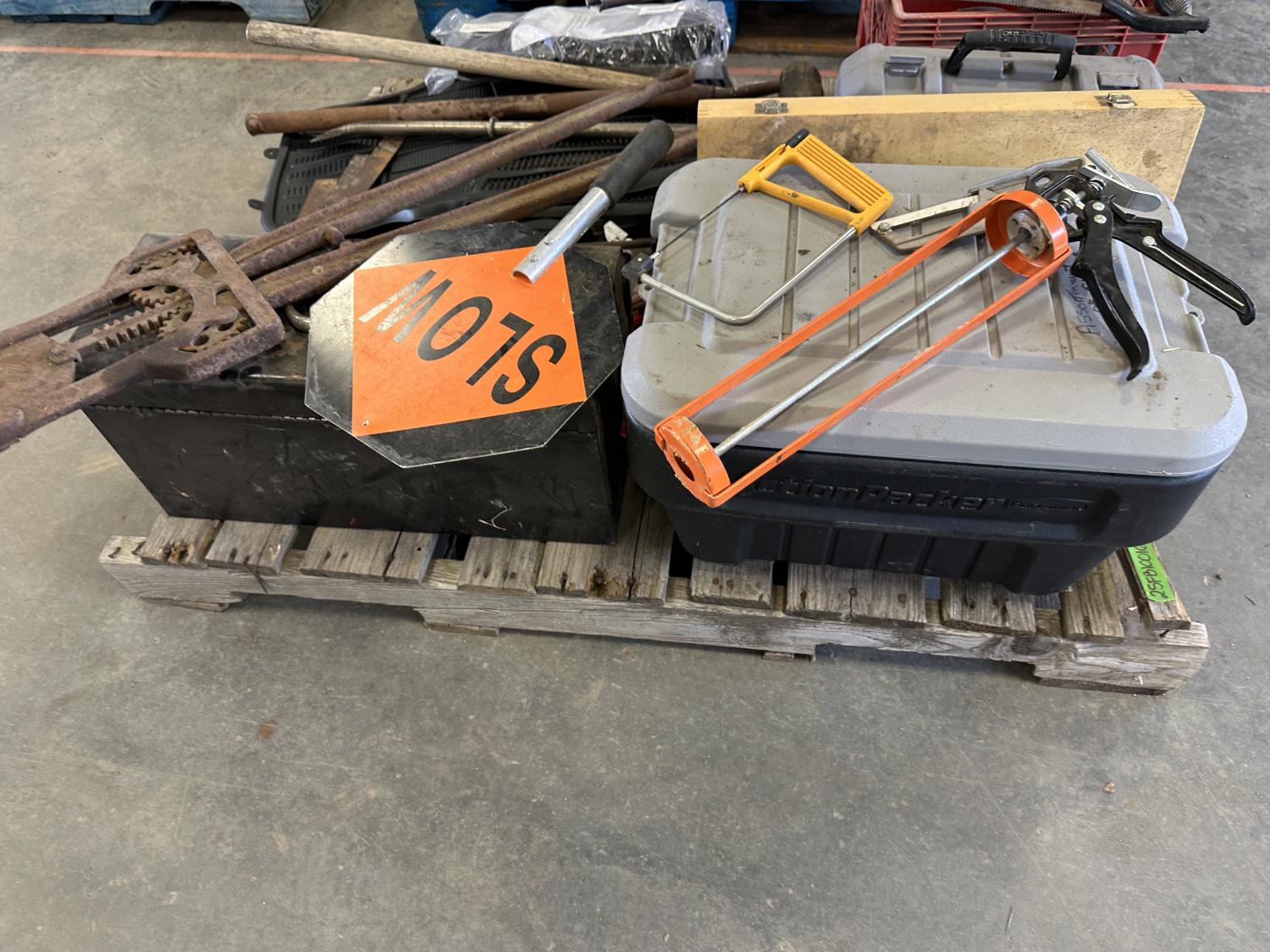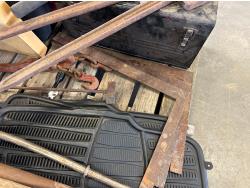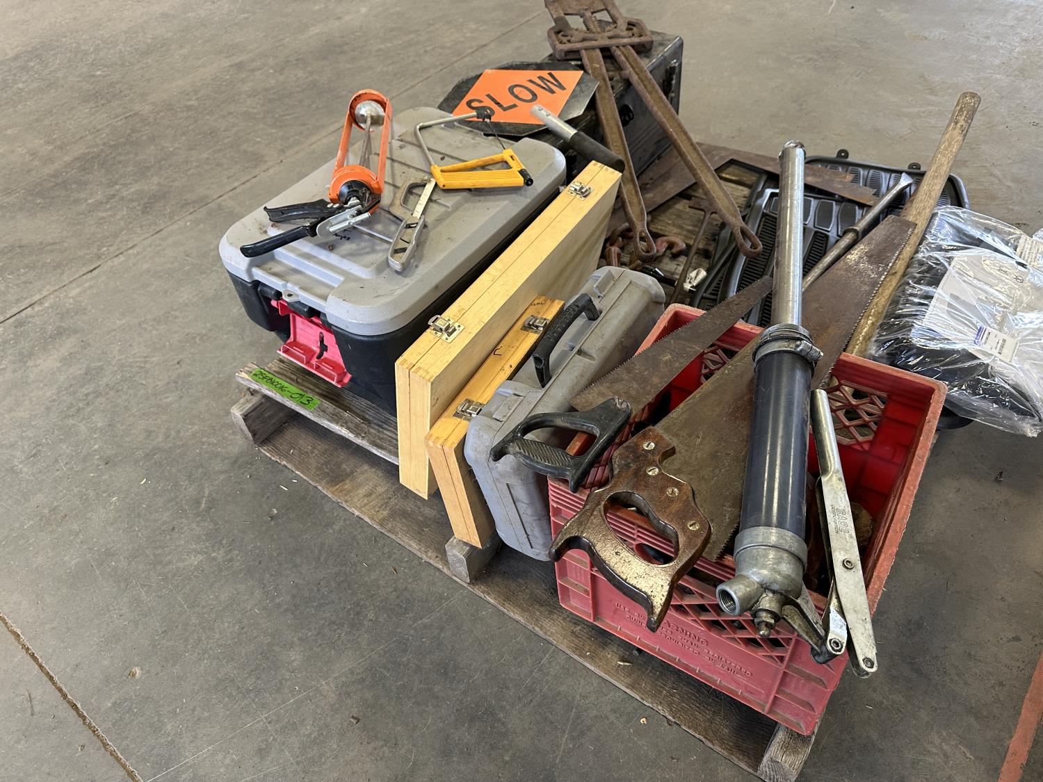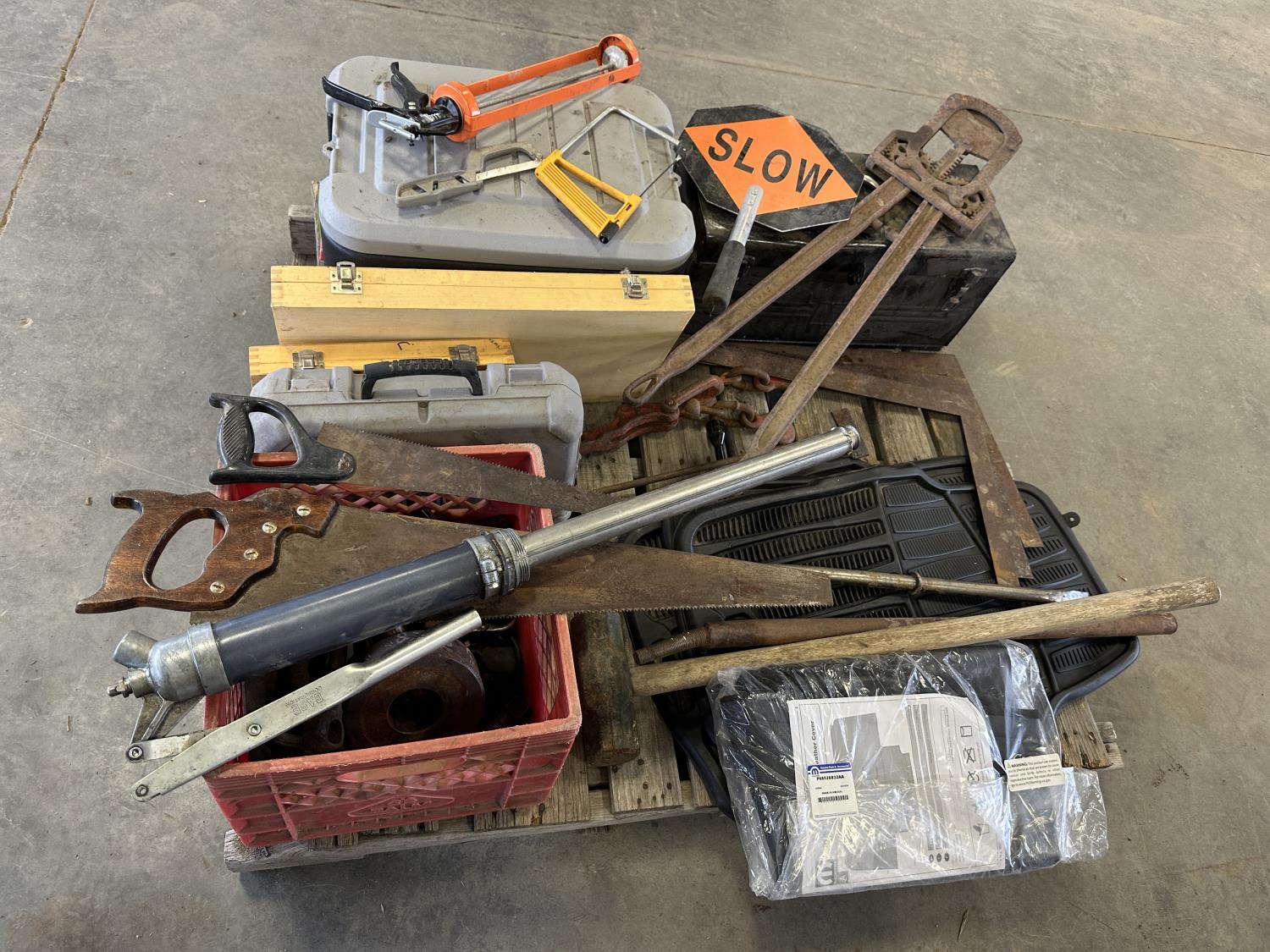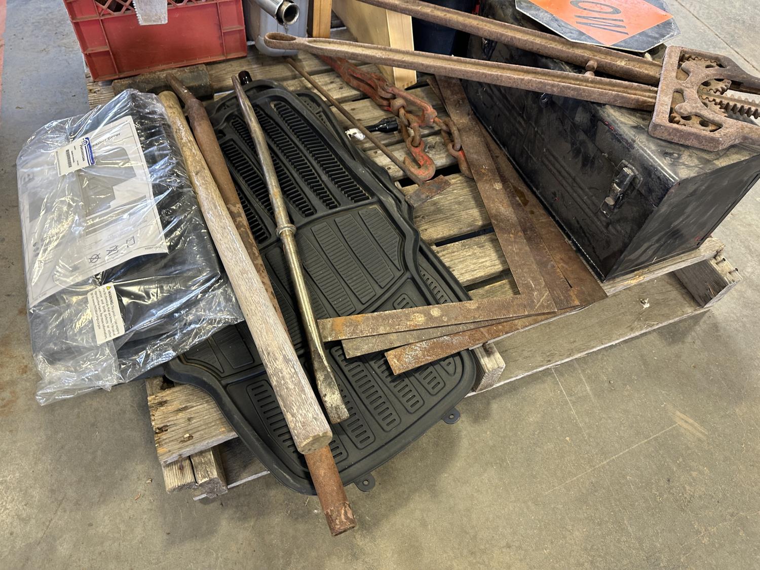 Hand saws, Mopar winter front, floor mats, snipe, pry bar, tire iron, (3) antique squares, (5) empty tool storage boxes