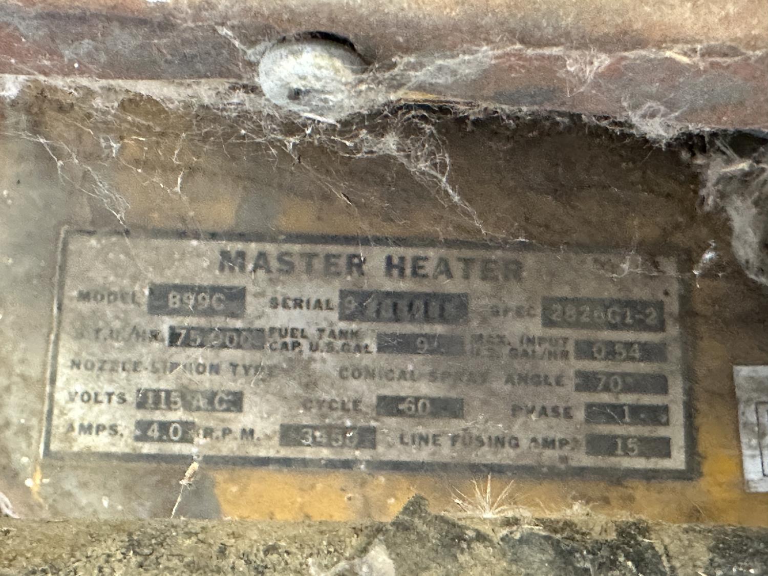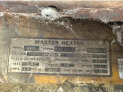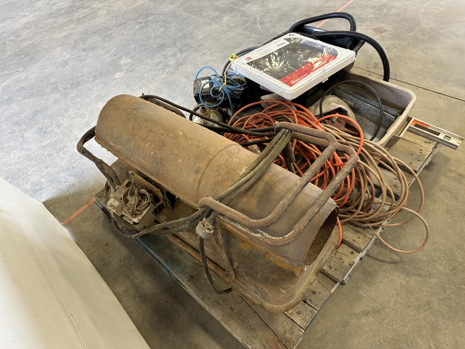 Antique Master Heater 25,000 BTU heater (inoperable), Flotec 1 inch water pump, Marathon 3/4 HP 115V motor, extension cords, miscellaneous hardware