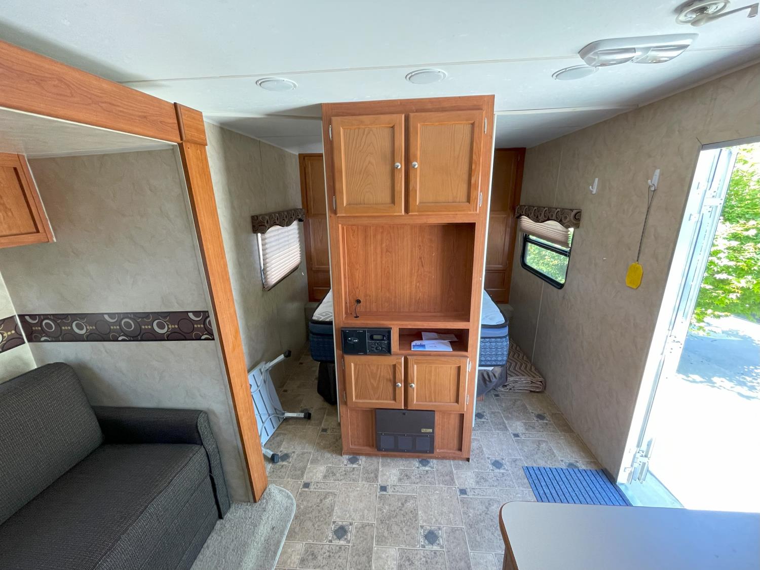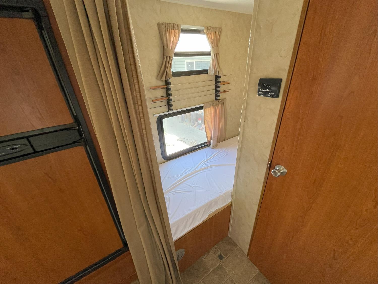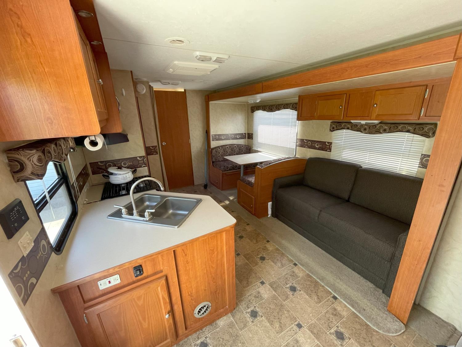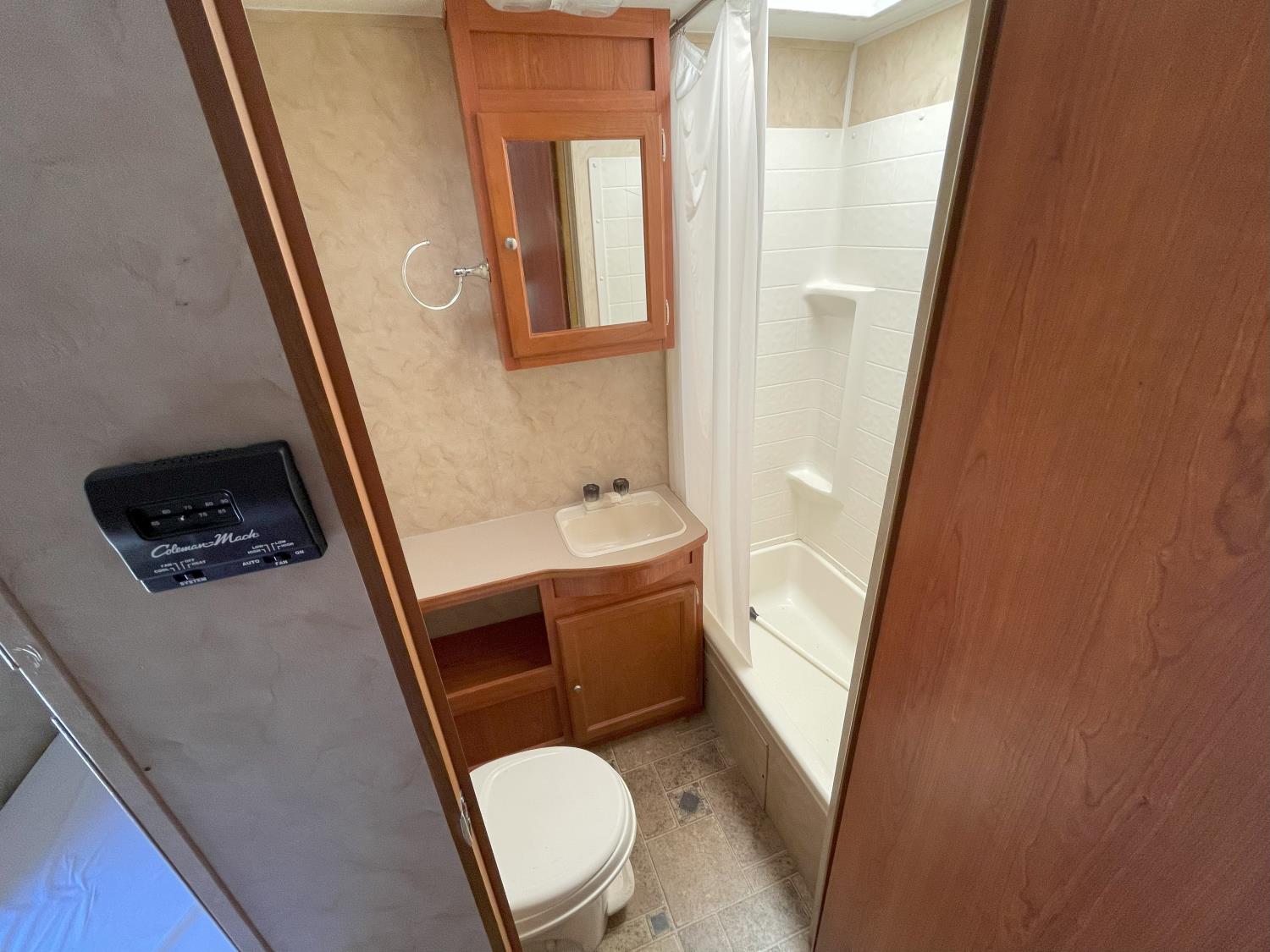 Sleeps 6, stove, fridge, microwave, full bath, master bedroom, A/C, 1 slide, manual awning, torsion suspension, electric brakes, 205/75R14 tires