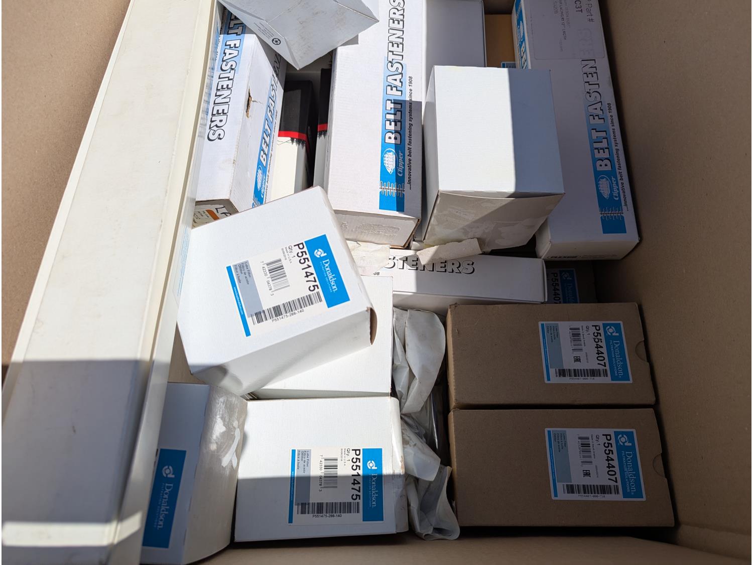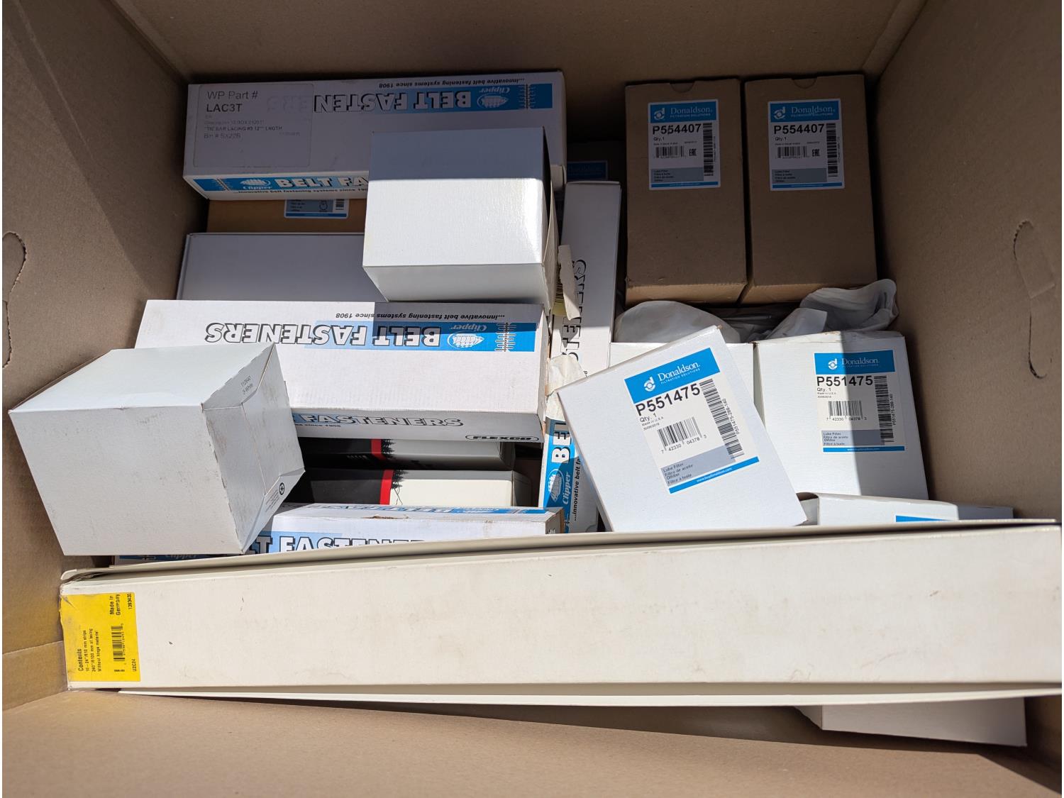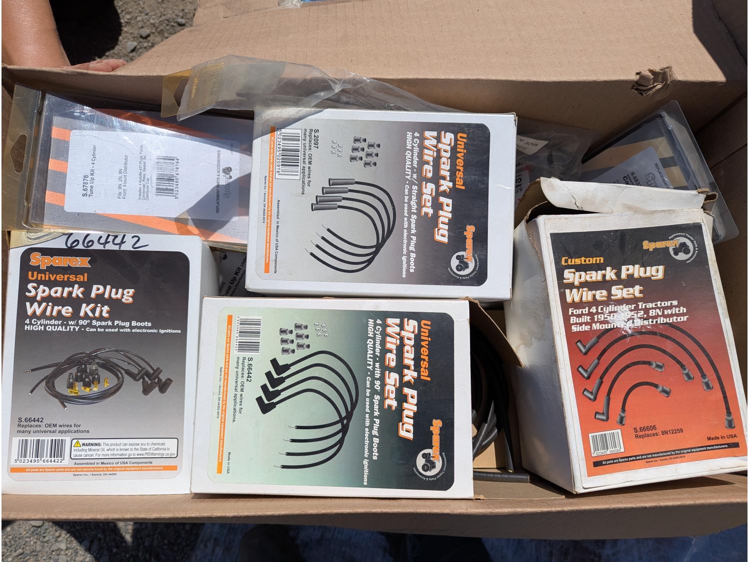 Hose, threaded rod, clutch assemblies, boxes of various tines, filters, spark plug wire sets and other assorted items