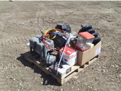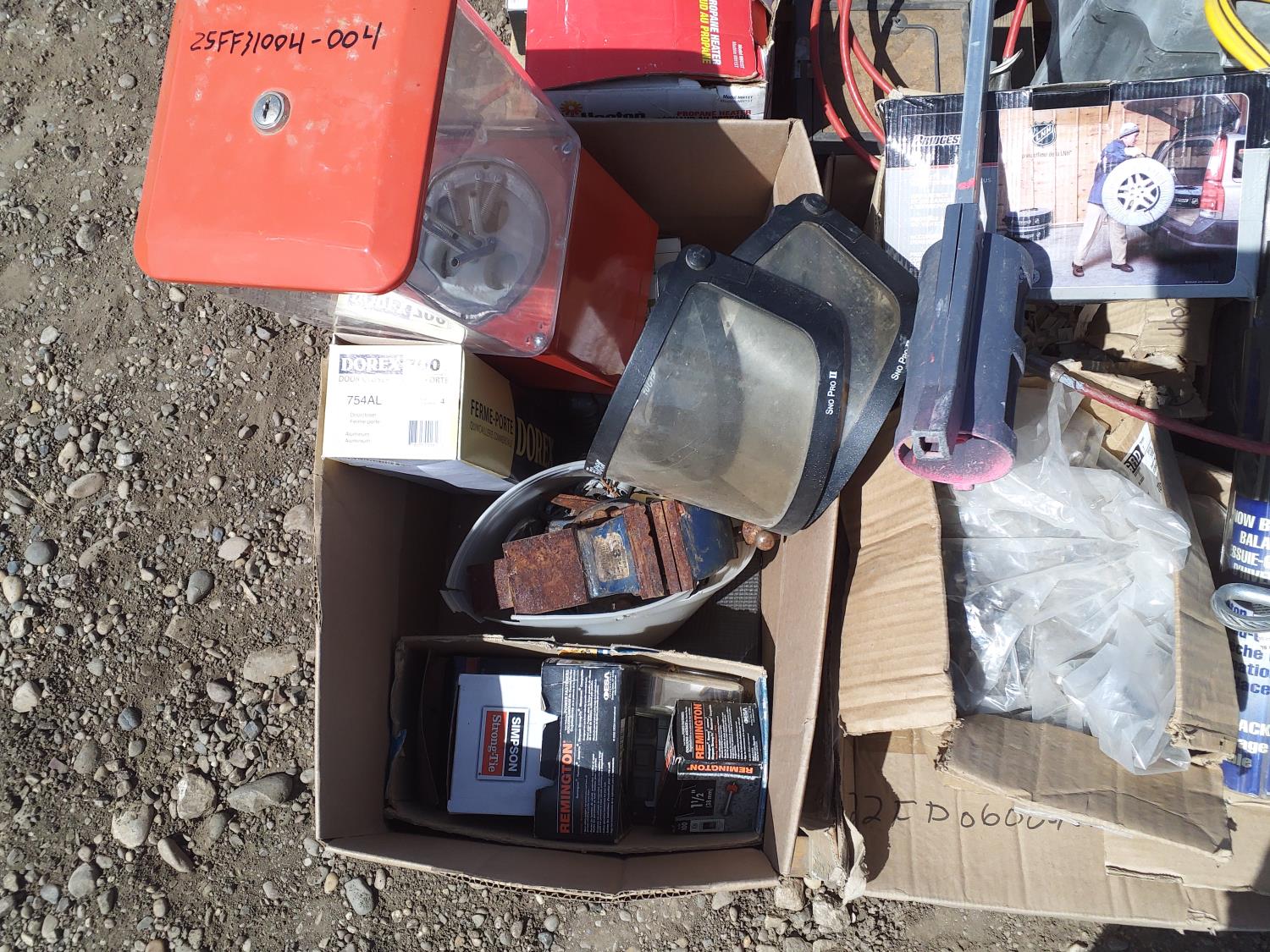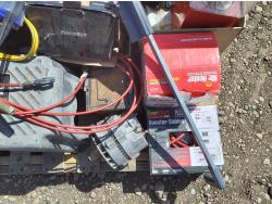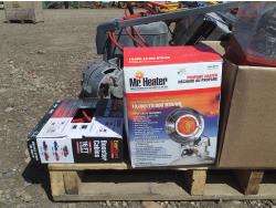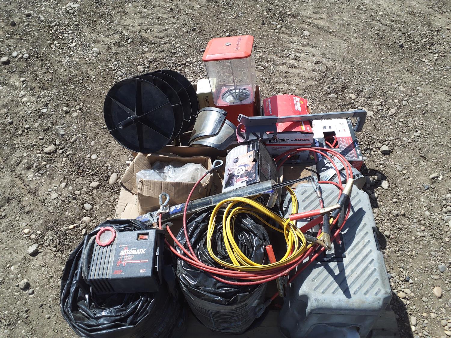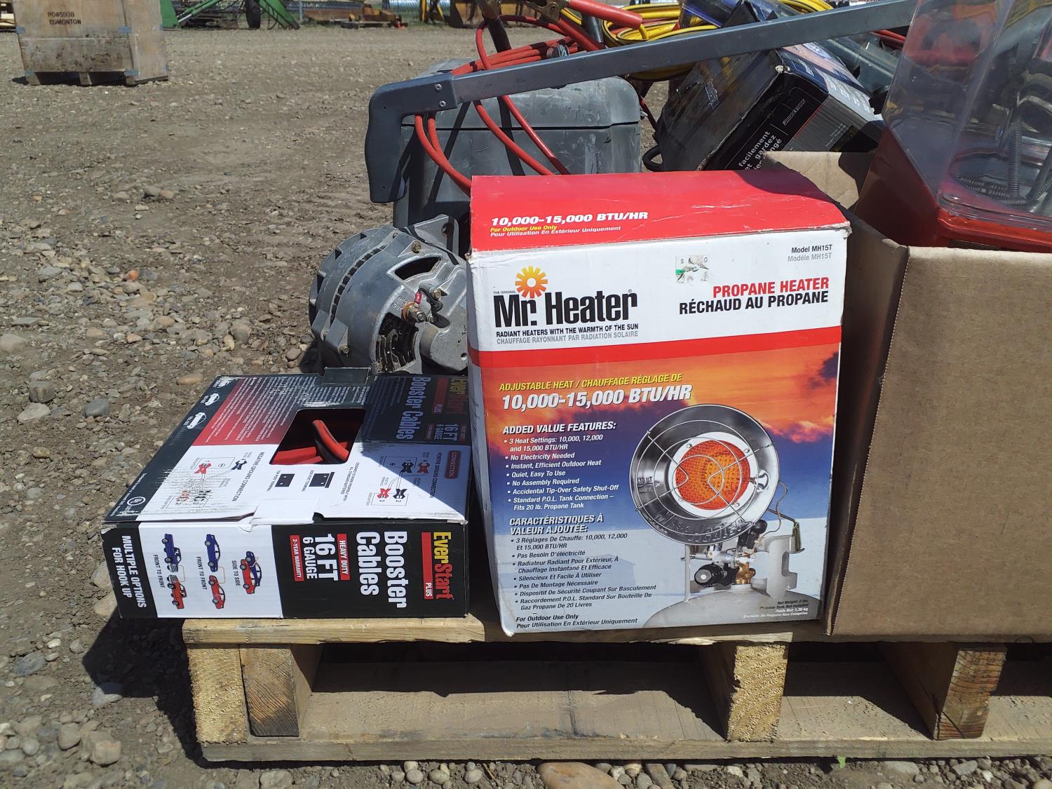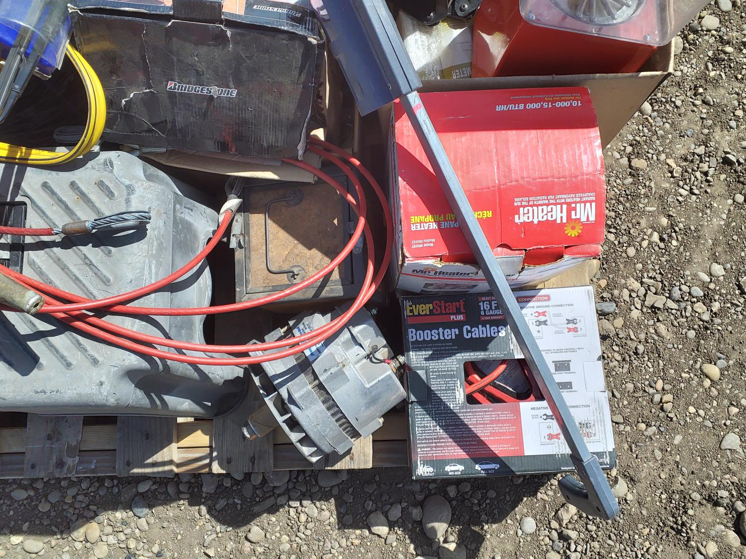 stool, (2) booster cables, tire covers, bolt bin, 12 volt air compressor and Mr. Heater