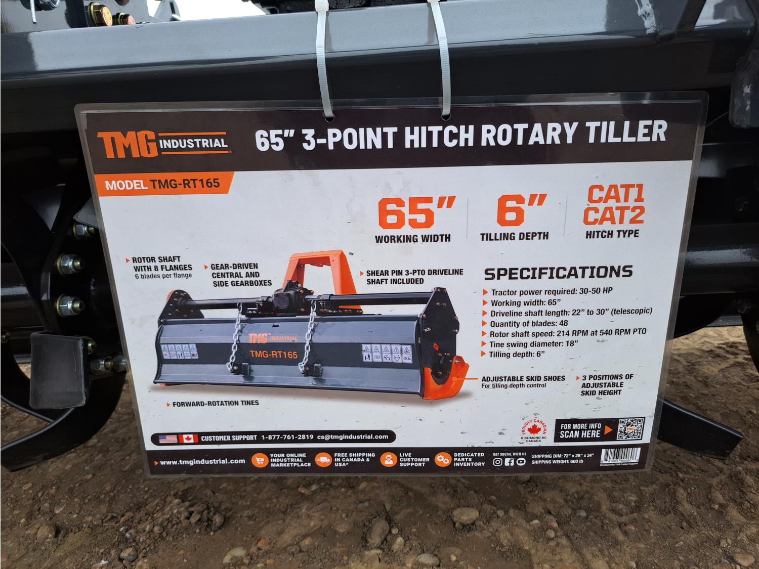 30-50 HP tractor, 6 inch tilling depth, PTO shaft included, category 1 & 2 hookup