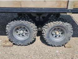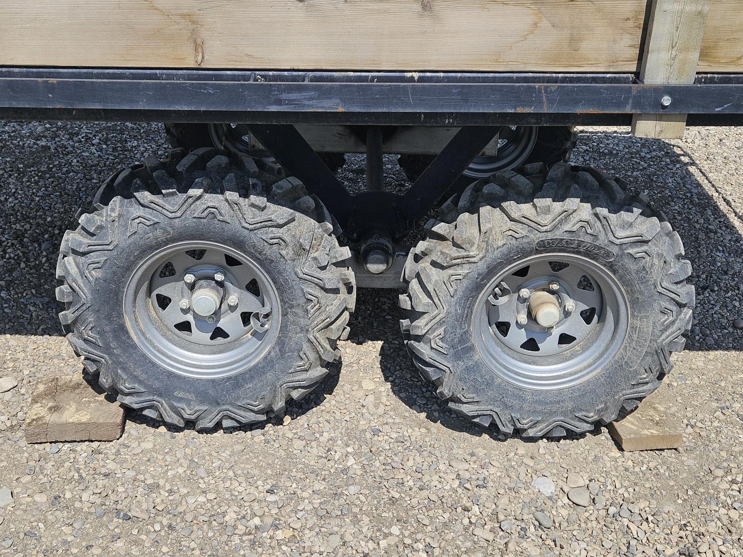 70 inch wide deck, wood deck, walking axles suspension, ball hitch, rub rails, stake pockets, 25X10.00-12 tires