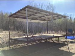 Metal pipe frame, removable metal roof, wood floor, portable stairs