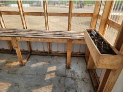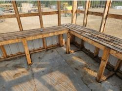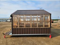 on skids, 78 inch walls, interior 19.5 inch W x 33 inch H wood benches, sheet metal flooring, 34 inch x 62 inch man door, motion light