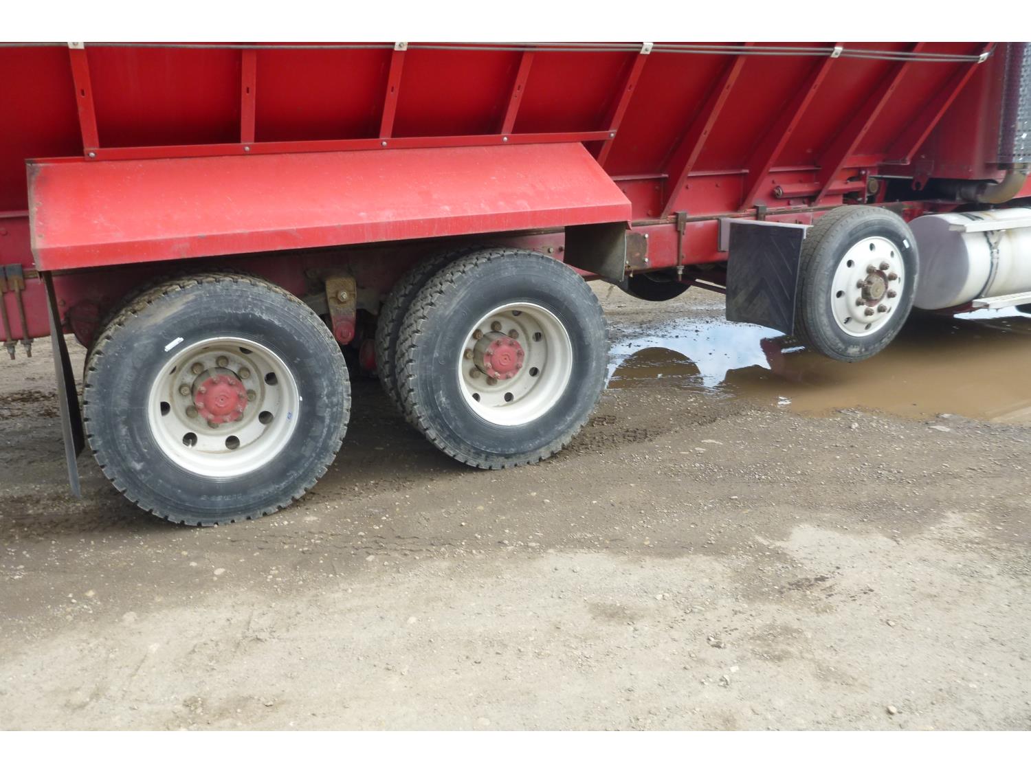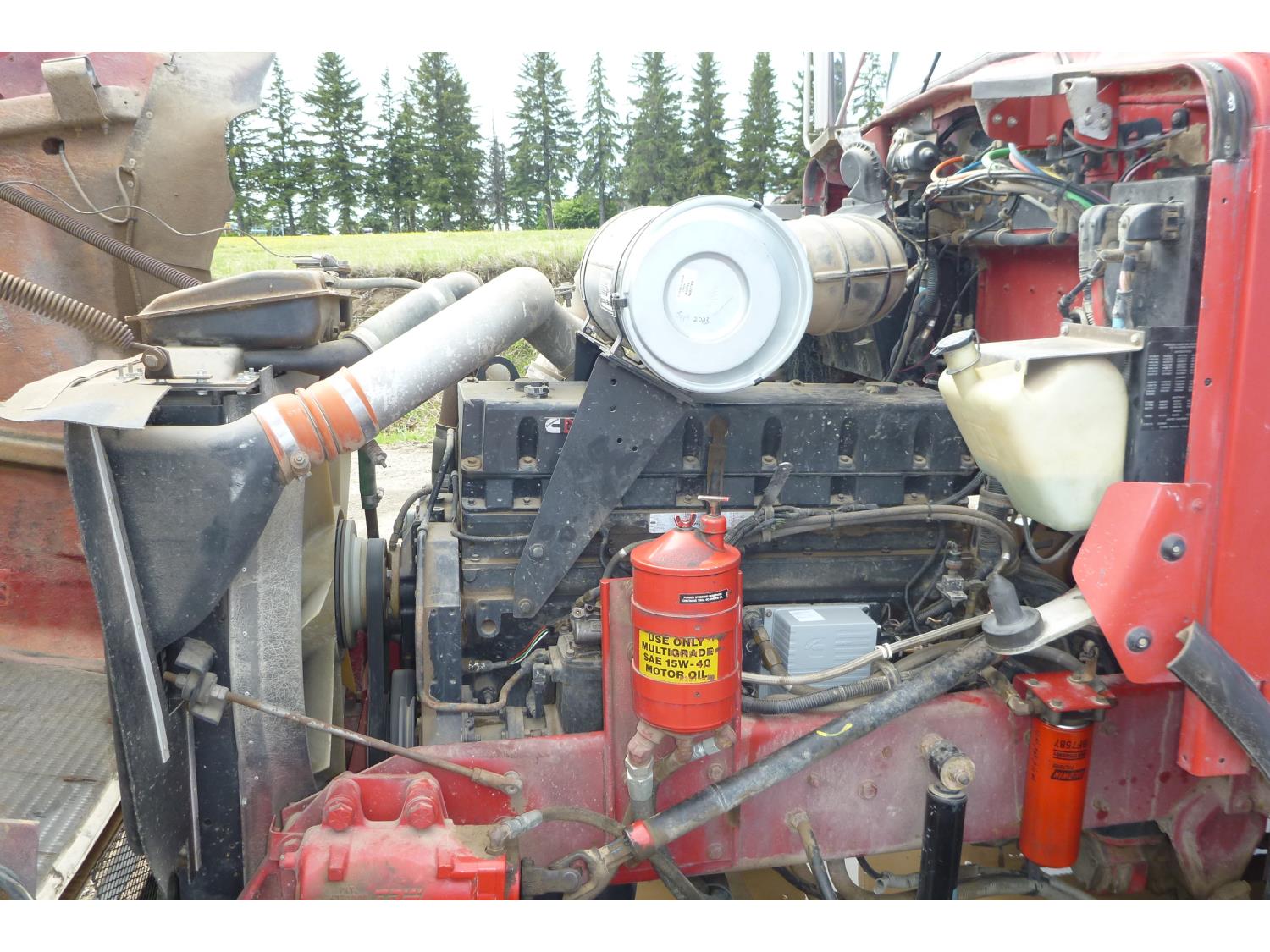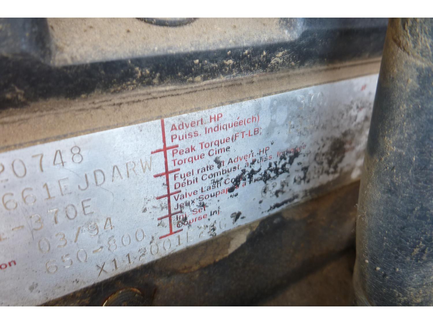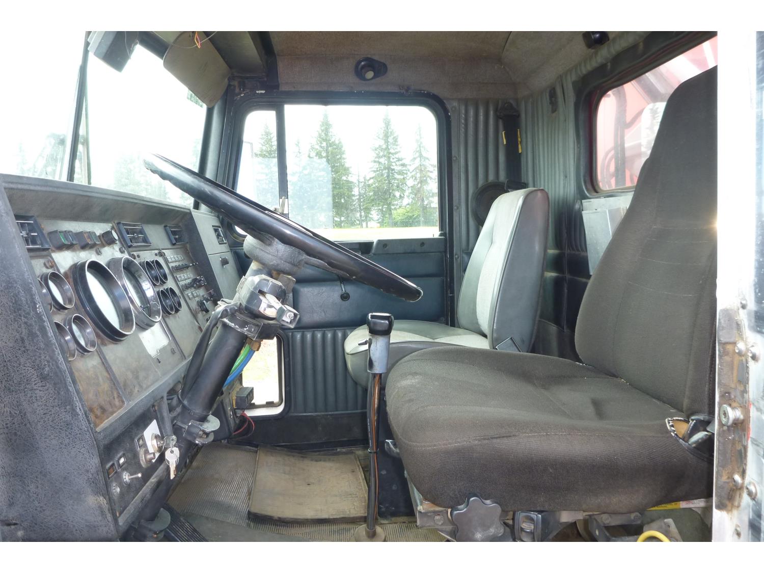 Cummins M11 370 HP engine, 13 speed manual transmission, differential lock, air drivers seat, Double L 20 ft box, tarp, Chelsea PTO, spring suspension, differential lock, lift axle, 4.33 ratio, 235/70R22.5, fronts 295/75R22.5, rears 11R22.5