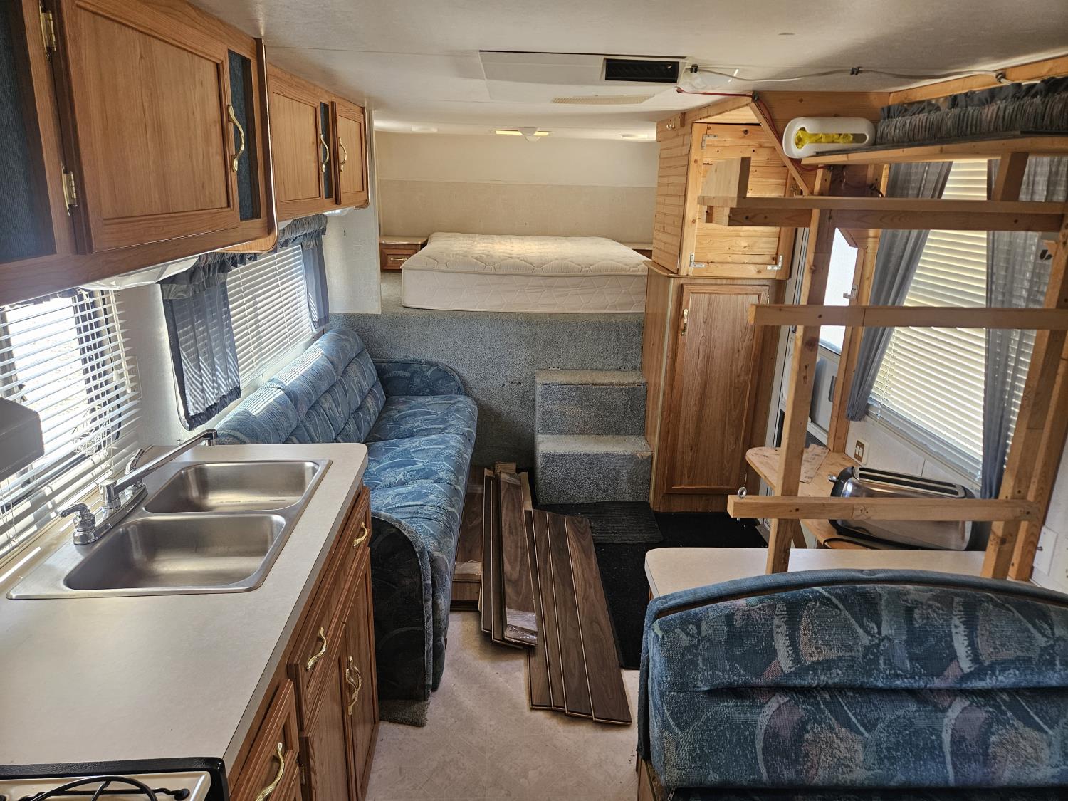 Sleeps 4, stove, fridge, microwave, full bath, A/C, outdoor shower, manual awning, spring suspension, electric brakes, back wall repaired, extra laminate flooring, 205/75R16 tires