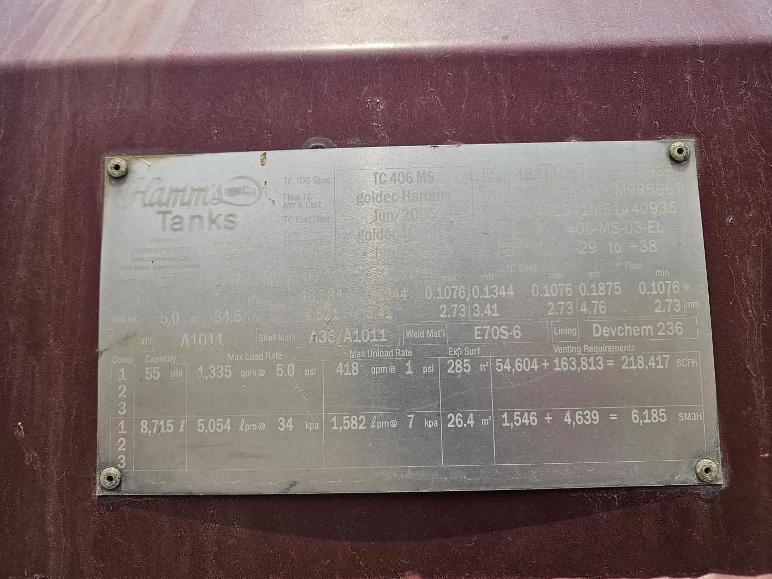 Cummins ISC 315 8.3 L 6 cylinder 315 HP diesel engine, engine brake, Eaton Fuller 10 speed manual transmission, cruise control, radio, hydraulic wet kit, chain holders, hydraulic pump, Hamm's 8715 liter 1 compartment tank, air ride suspension, 14,598 lb front axle, 22,994 lb rear axles, 4.56 ratio, all aluminum wheels, 11R22.5 tires